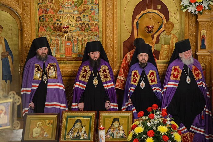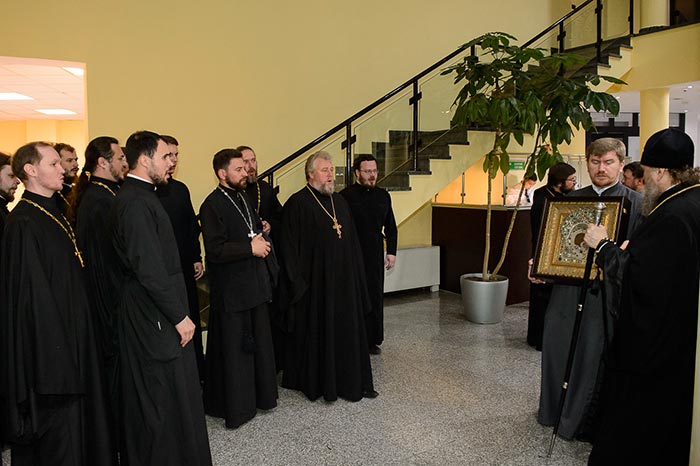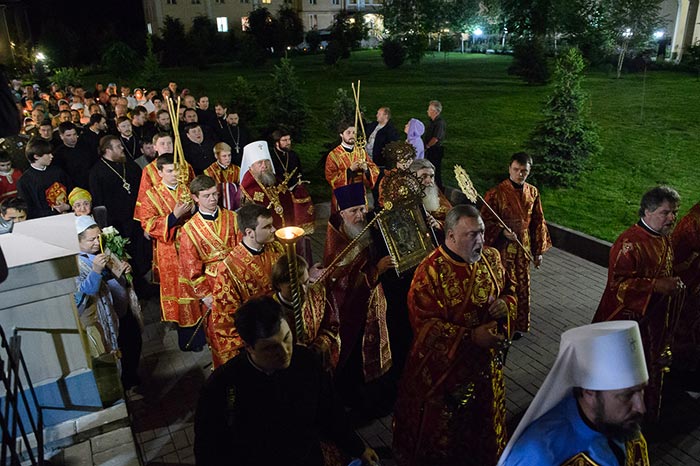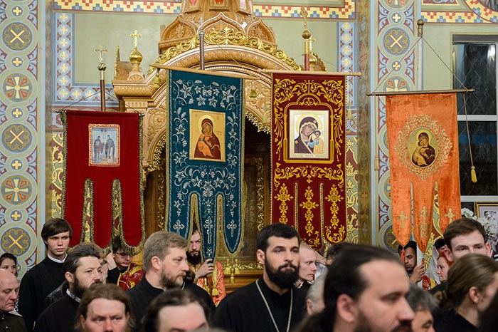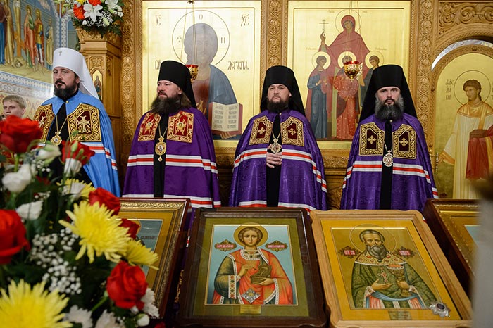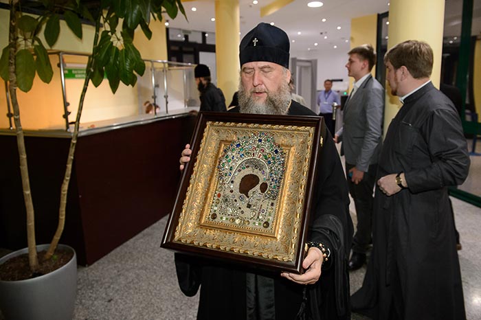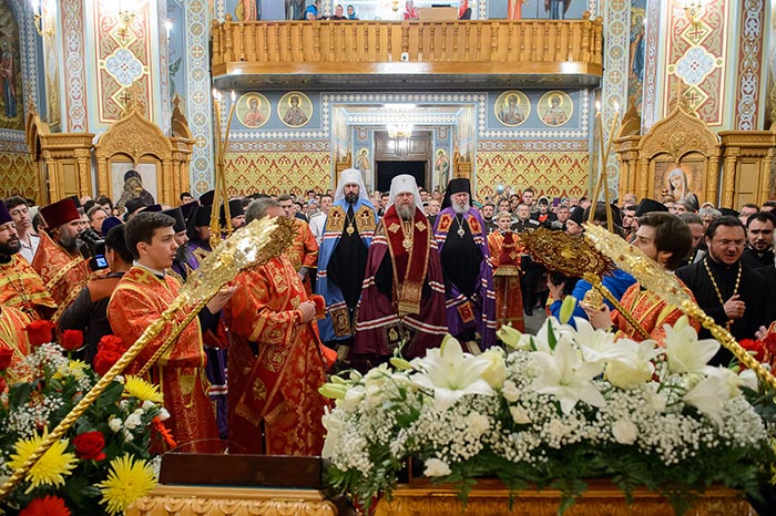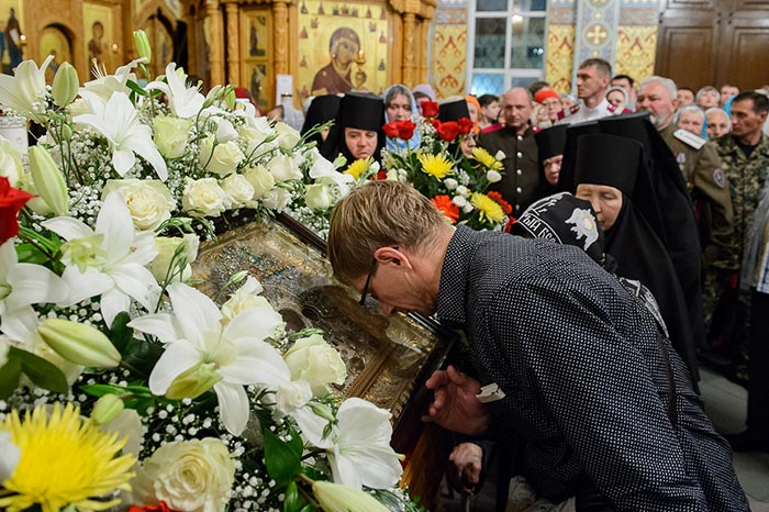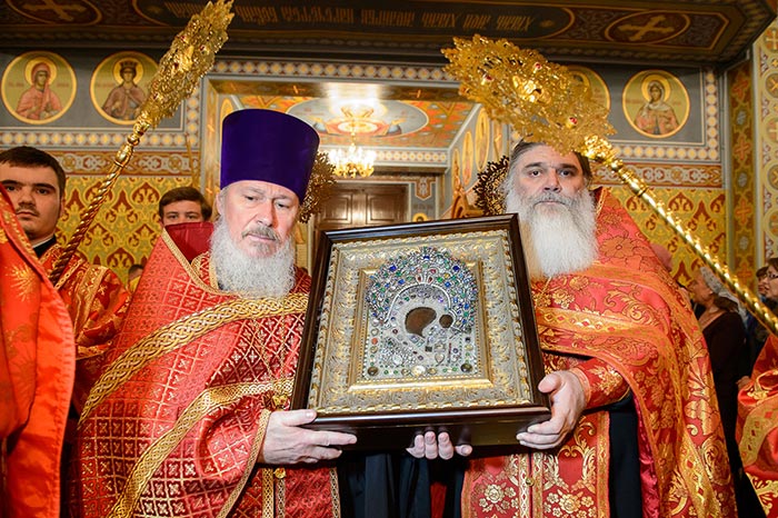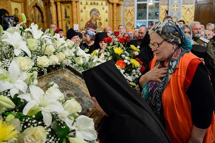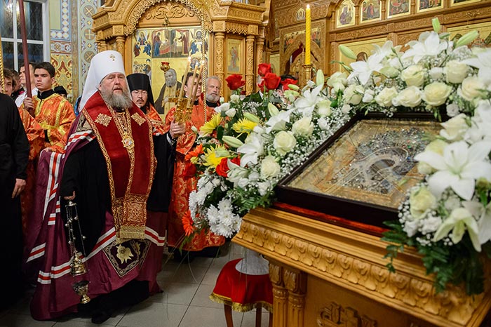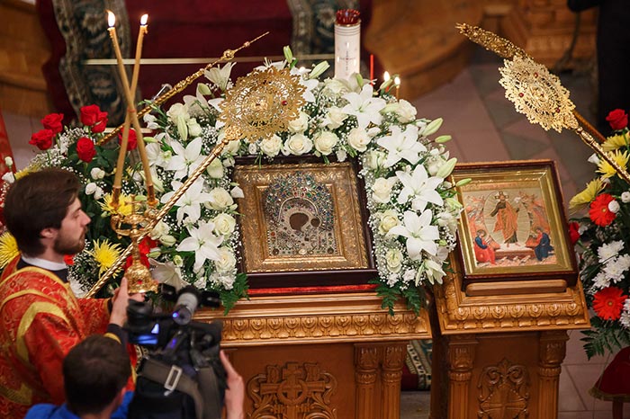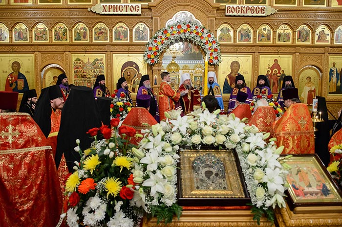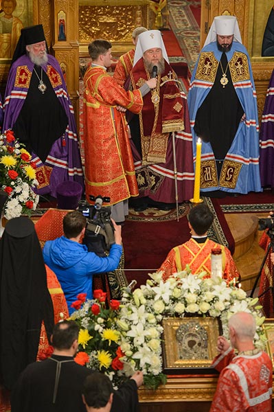 Под пение тропаря «Заступнице усердная» иерархи внесли чудотворный образ под своды собора и установили киот в центре храма, после чего началось совершение молебна.