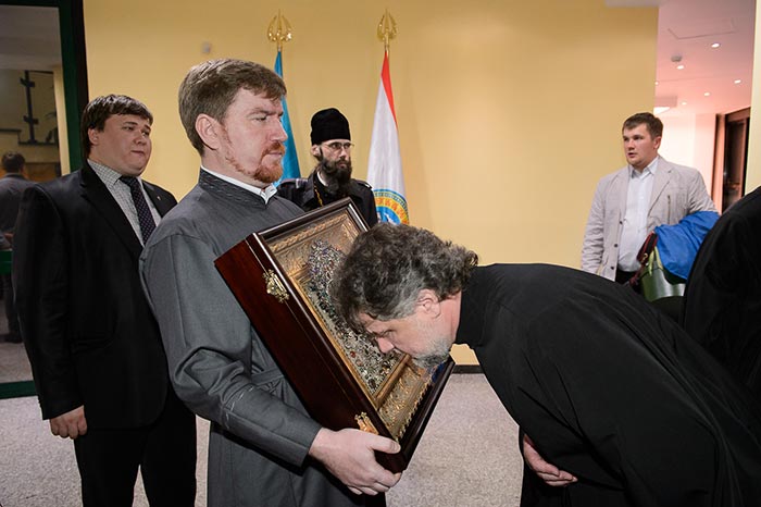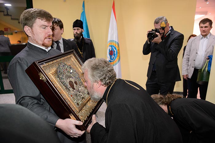 Из Казани святыню сопровождали митрополит Астанайский и Казахстанский Александр и клирики Казанской епархии Татарстанской митрополии.