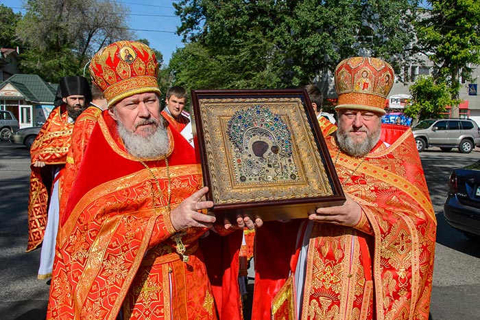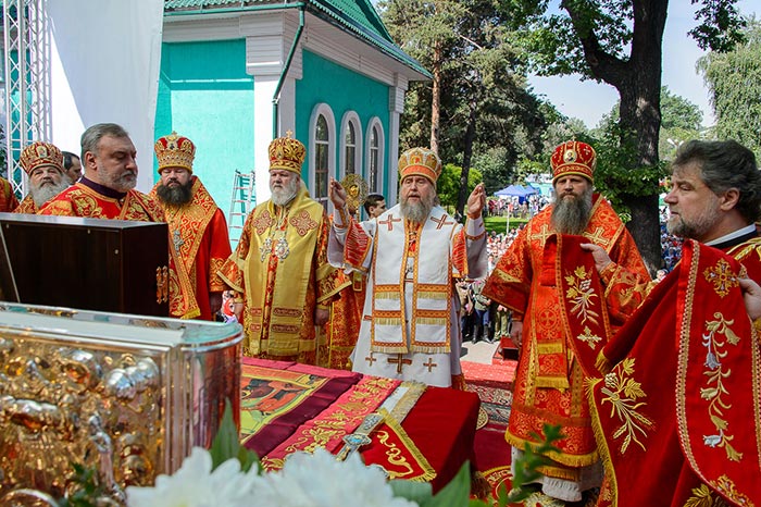 При пении стихиры «Под Твою милость прибегаем, Богородице Дево» митрополит Александр и архипастыри осенили прихожан и паломников Казанской иконой Божией Матери и благословили чудотворной святыней четыре стороны света, призывая заступление Божией Матери на город Алма-Ату и всю Казахстанскую землю.