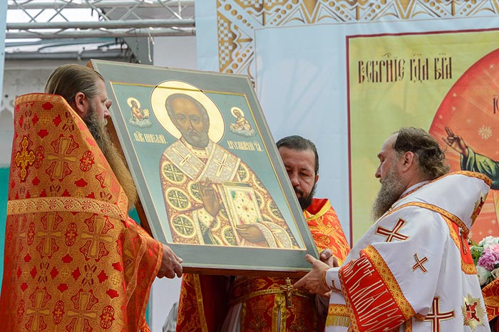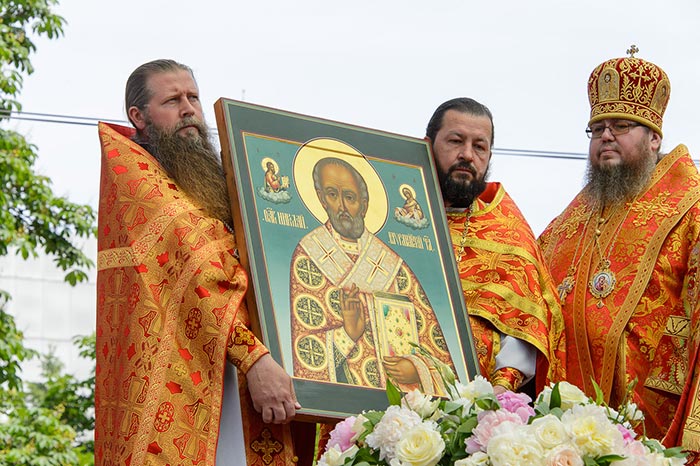 В завершение Литургии состоялось славление светлому Христову Воскресению и молебен Пресвятой Богородице и святителю Николаю Чудотворцу перед чудотворным Казанским образом «Заступницы усердной» и ковчегом с мощами Мирликийского иерарха.