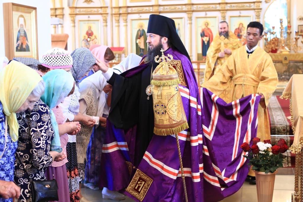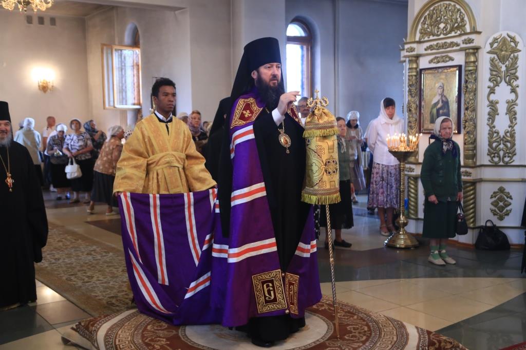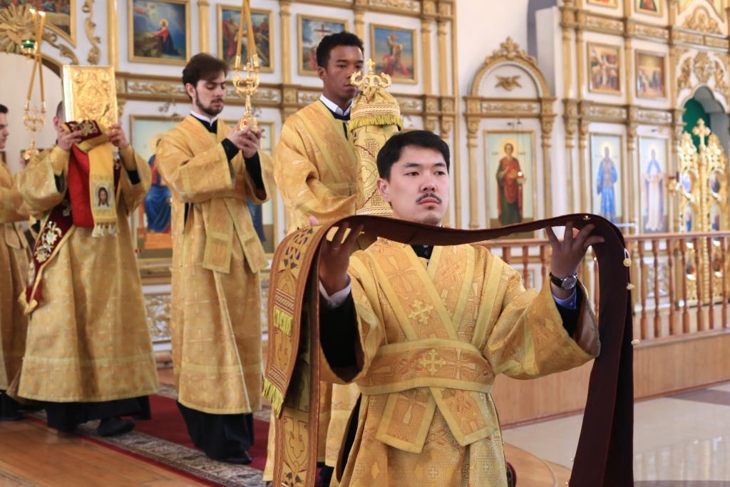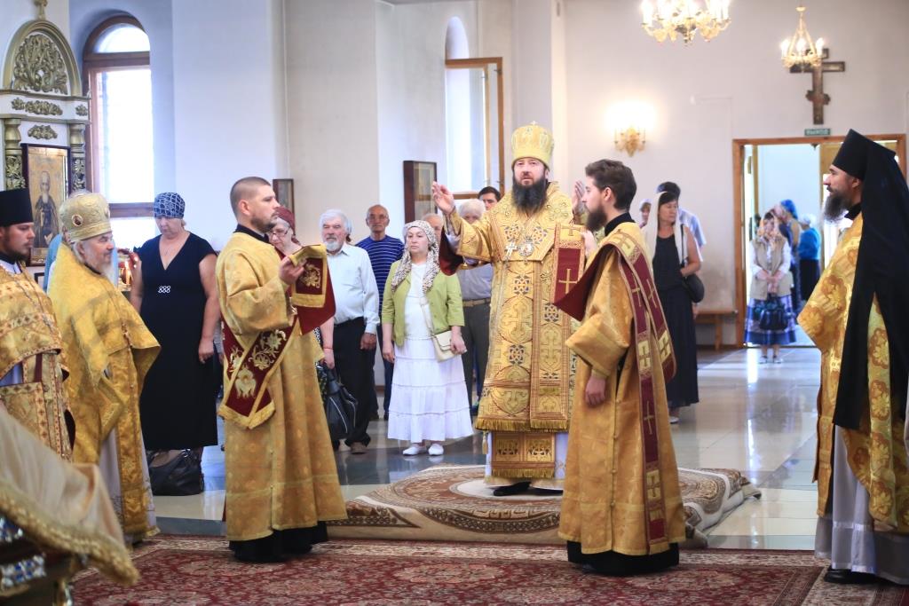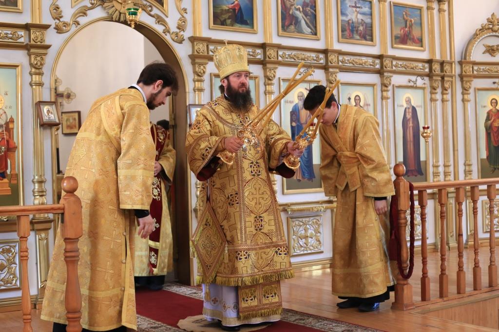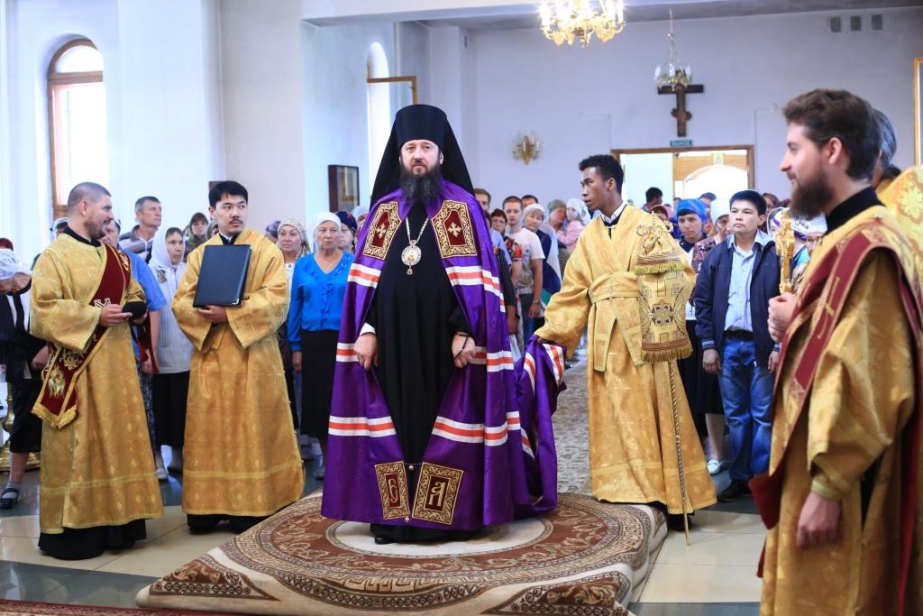 Его Преосвященству сослужили: духовник Усть-Каменогорской епархии архимандрит Спиридон (Теплухин), ключарь кафедрального собора иеромонах Никодим (Авдеев), протодиакон Георгий Засыпкин, иеродиакон Мефодий (Шевчук).