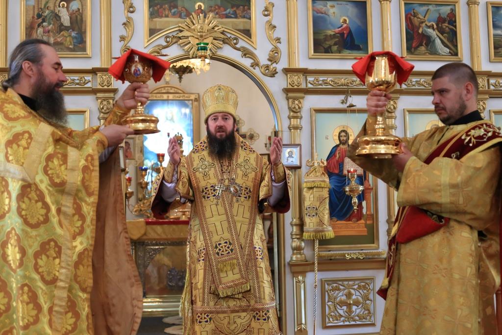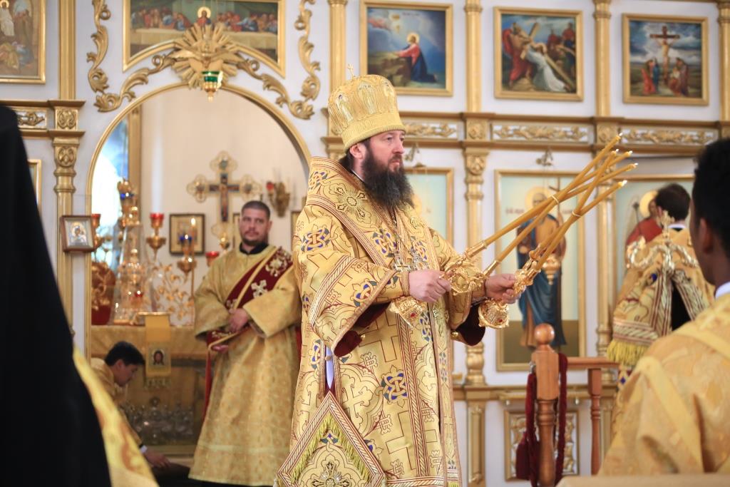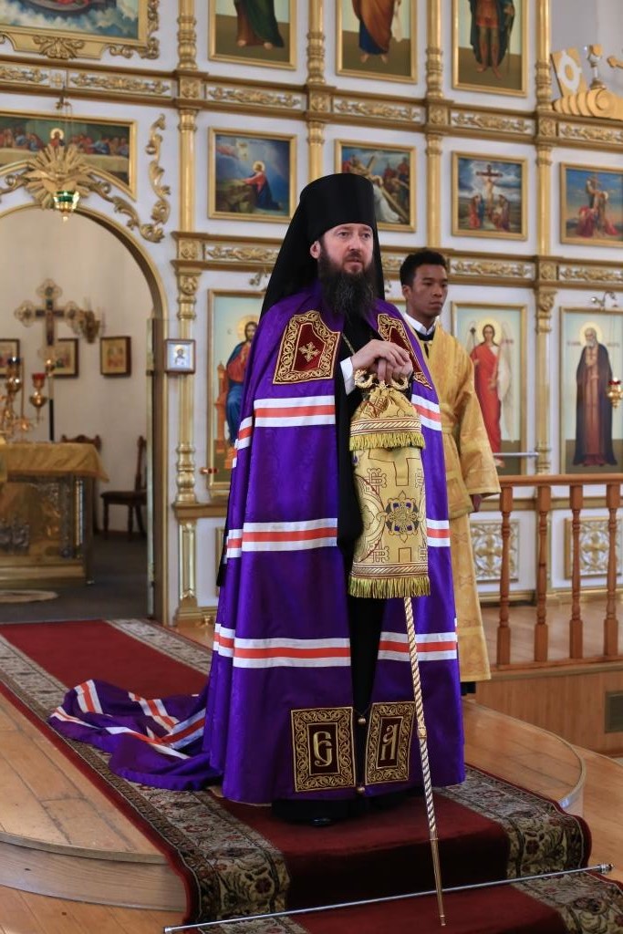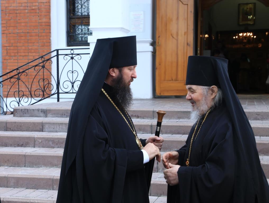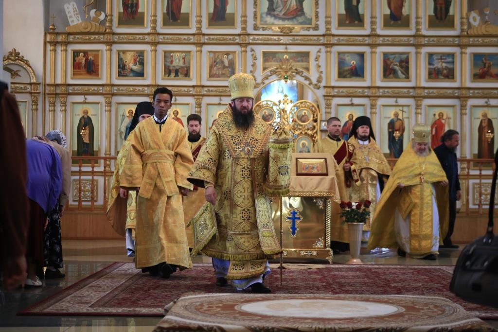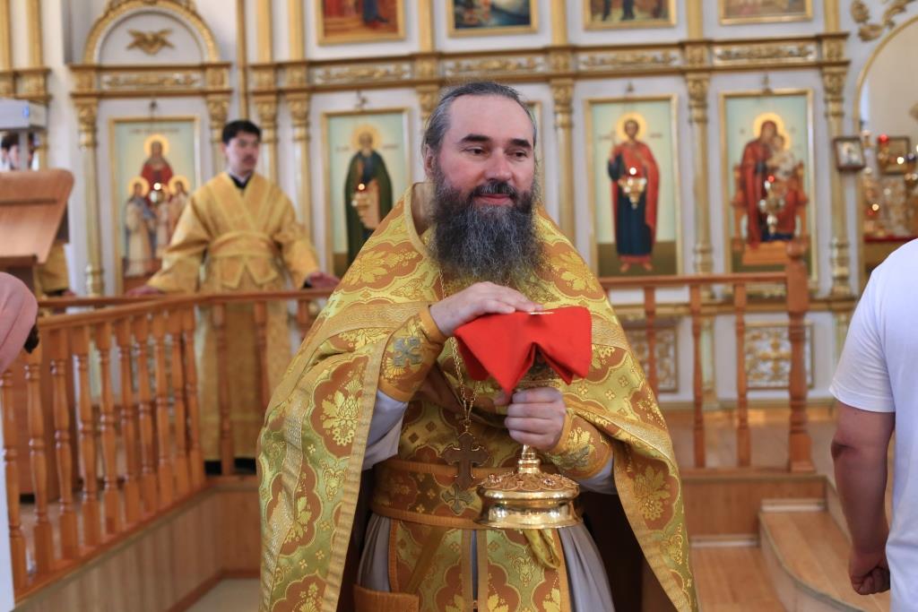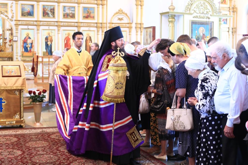 Его Преосвященству сослужили: духовник Усть-Каменогорской епархии архимандрит Спиридон (Теплухин), ключарь кафедрального собора иеромонах Никодим (Авдеев), протодиакон Георгий Засыпкин, иеродиакон Мефодий (Шевчук).