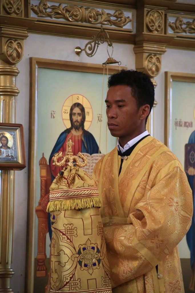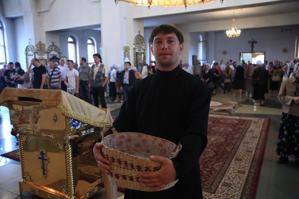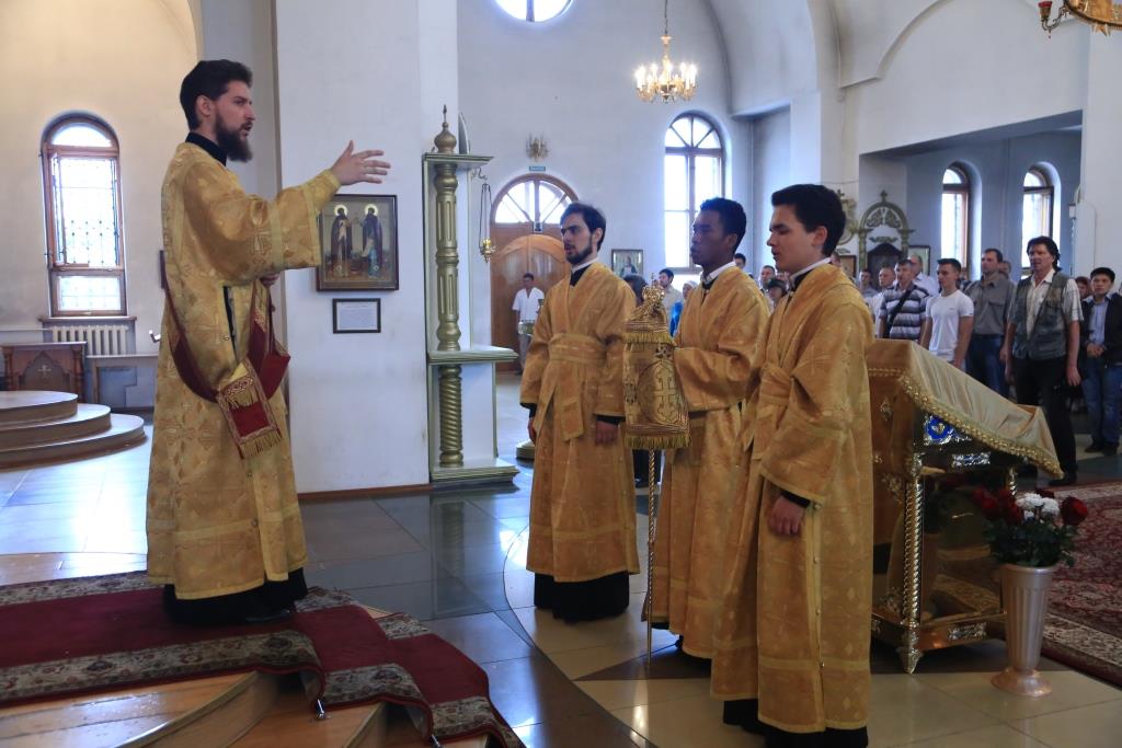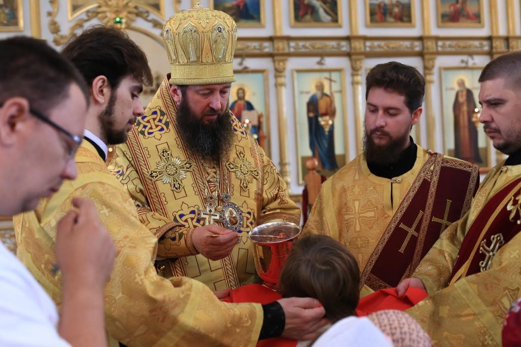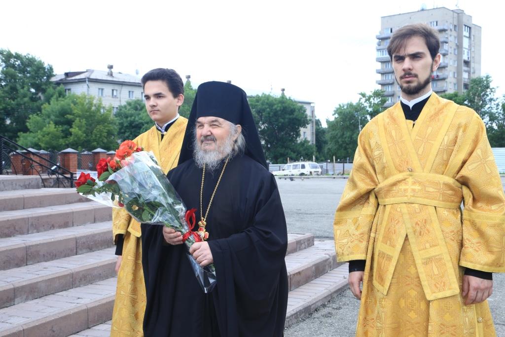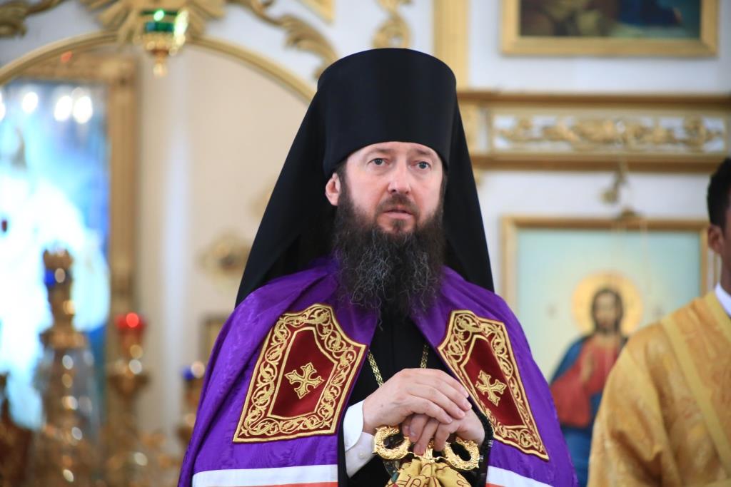 Его Преосвященству сослужили: духовник Усть-Каменогорской епархии архимандрит Спиридон (Теплухин), ключарь кафедрального собора иеромонах Никодим (Авдеев), протодиакон Георгий Засыпкин, иеродиакон Мефодий (Шевчук).