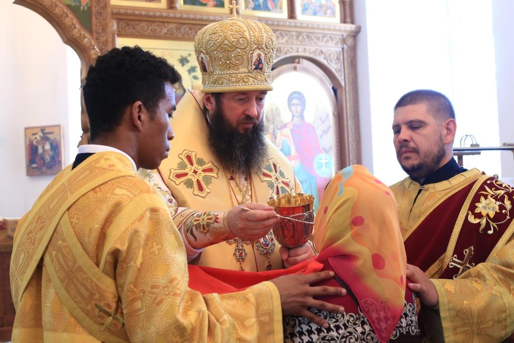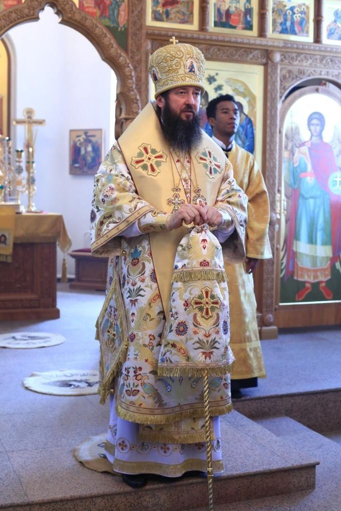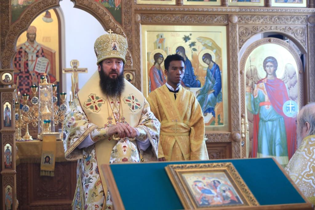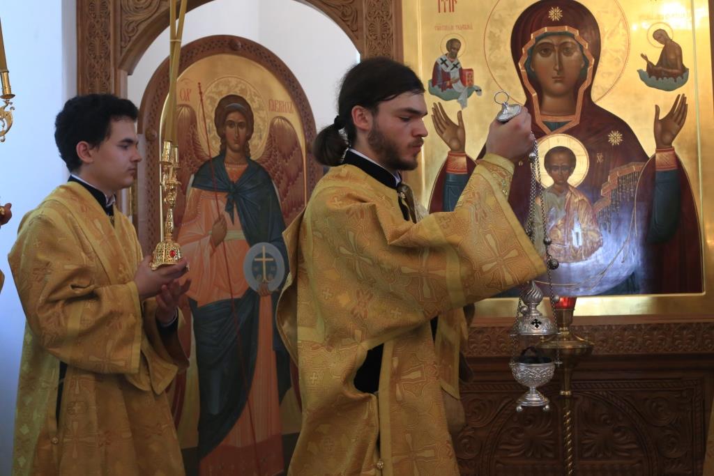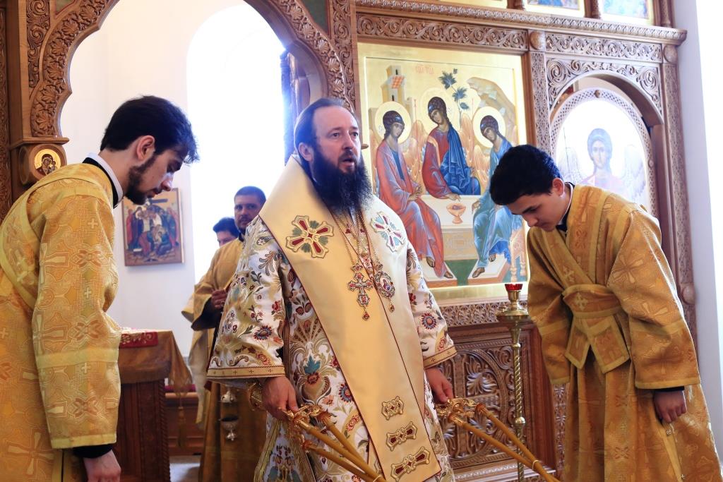В праздничный день Архипастырю сослужили: духовник епархии архимандрит Спиридон (Теплухин), ключарь Андреевского собора иеромонах Никодим (Авдеев), протодиакон Георгий Засыпкин, иеродиакон Тимофей (Хитрич).
