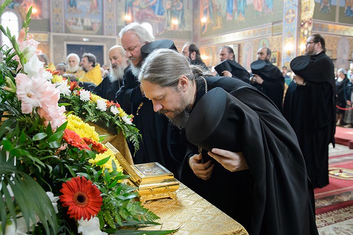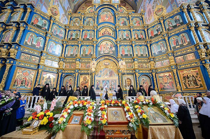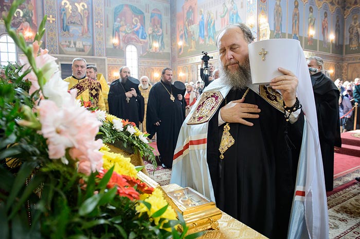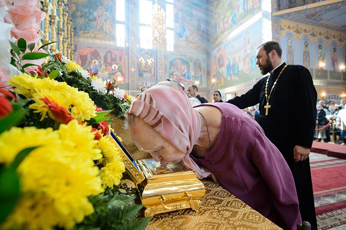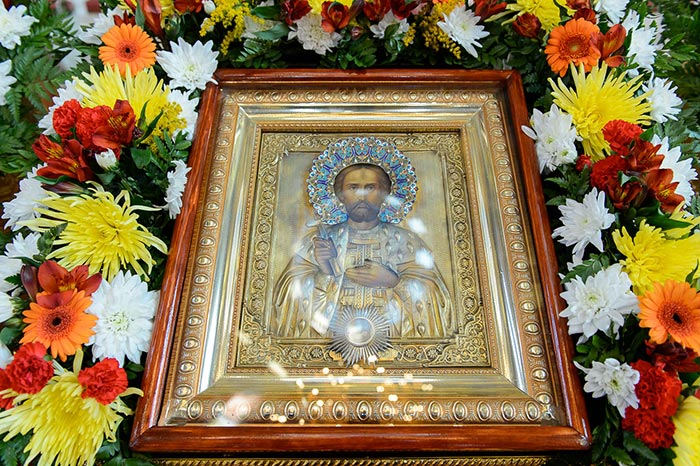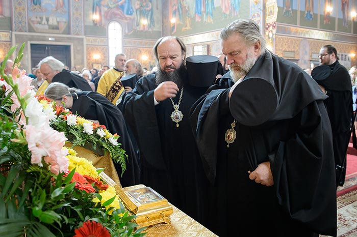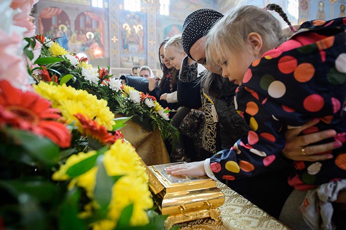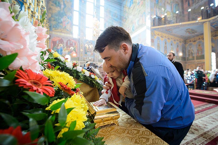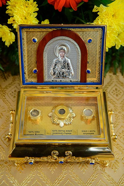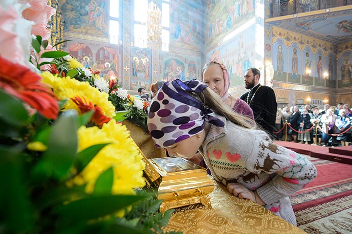 Литургия завершилась славлением перед иконами с частицами мощей благоверного князя Александра Невского и преподобного Александра Свирского и ковчегом с мощами блаженной Матроны Московской.