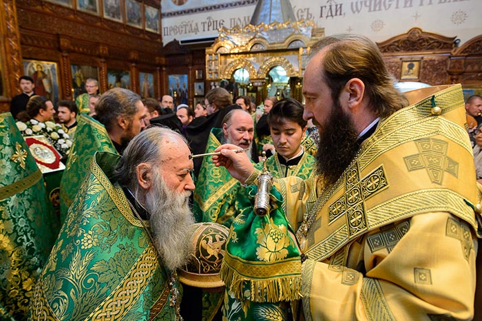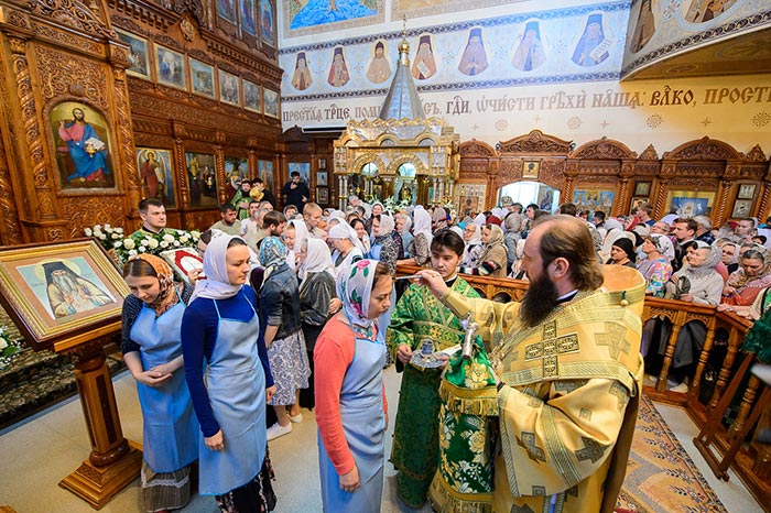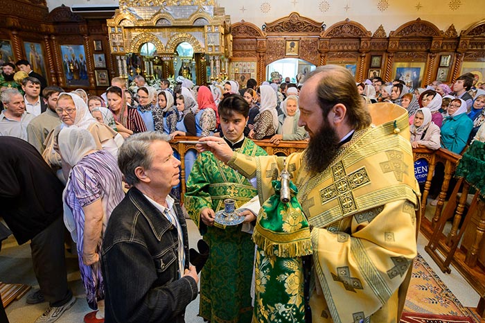 Во время чтения канона верующие, прикладывающиеся к раке с мощами святого старца Севастиана, были помазаны освященным елеем.