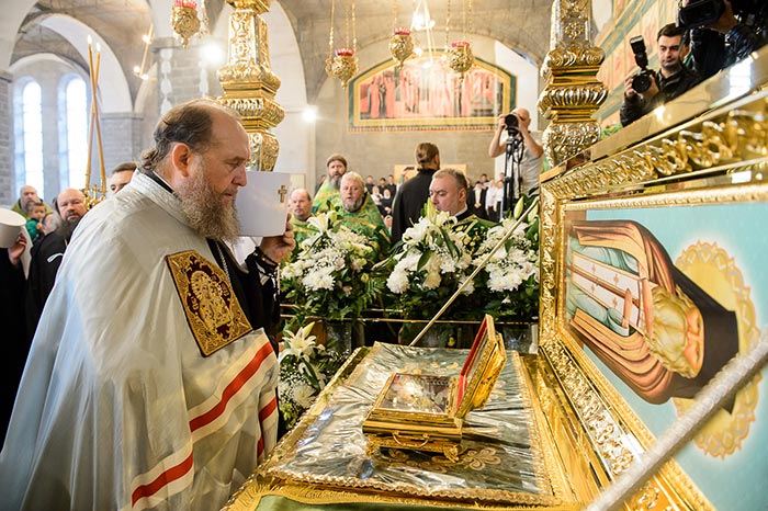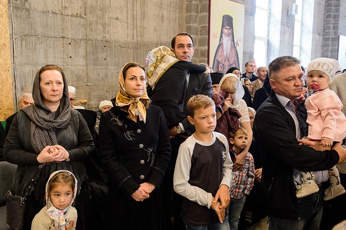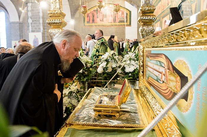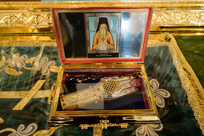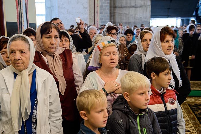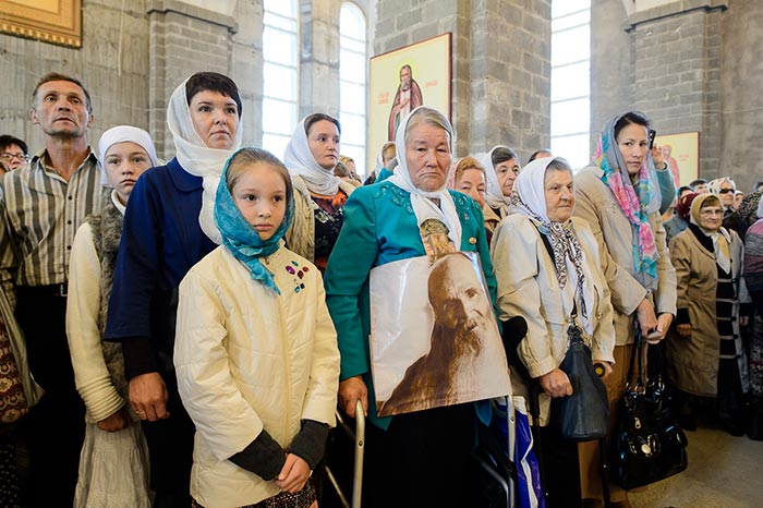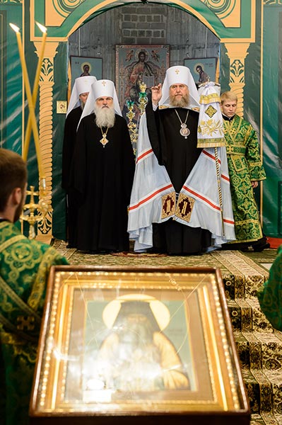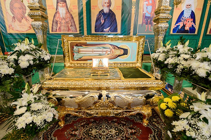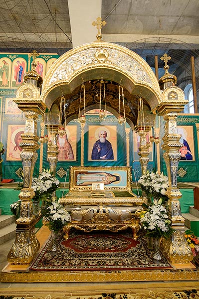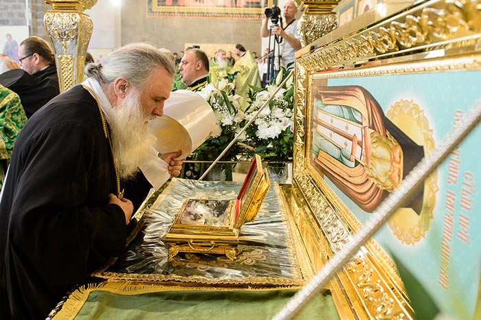Литургия завершилась славлением перед частью мощей преподобноисповедника Севастиана Карагандинского, положенных в посеребренную гробницу под сенью, выполненную специально для новопостроенного собора на художественно-производственном предприятии Русской Православной Церкви «Софрино».