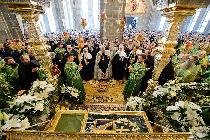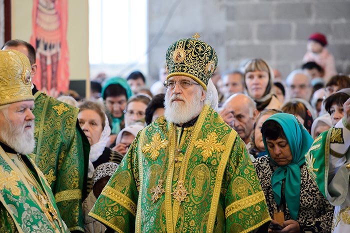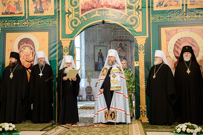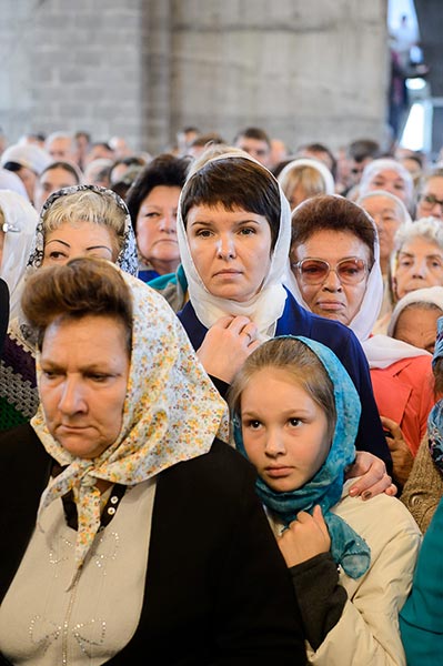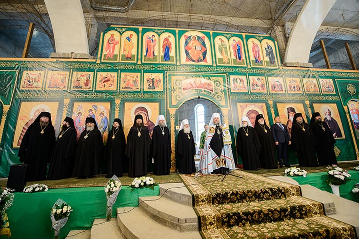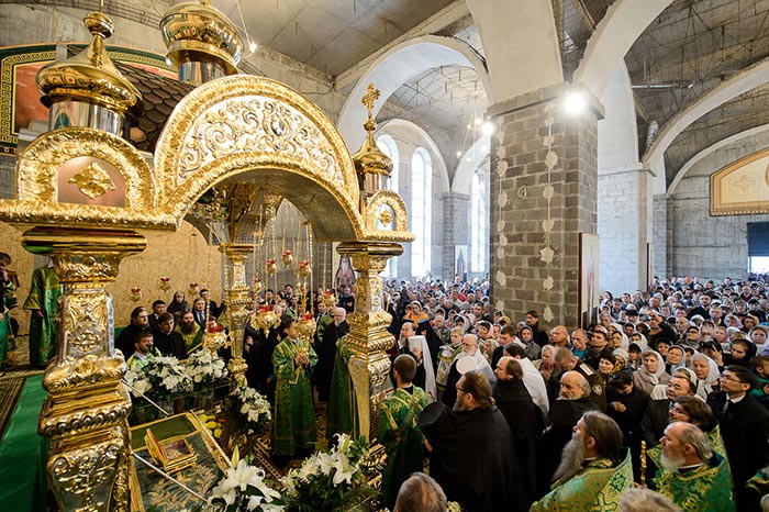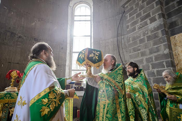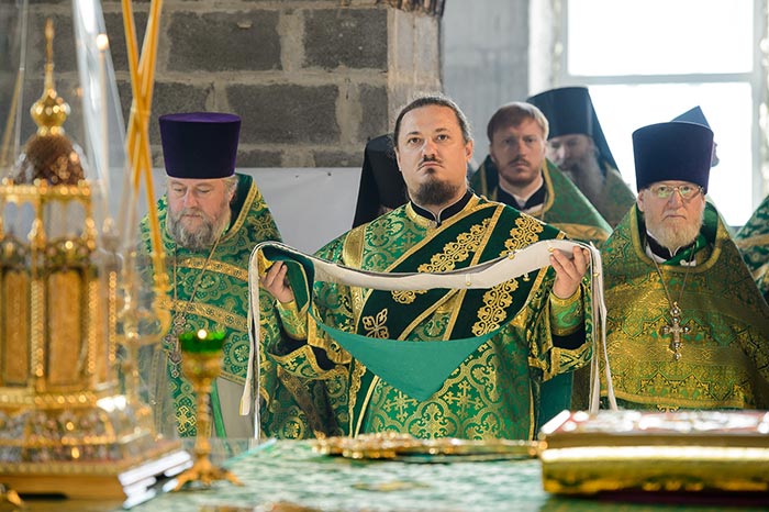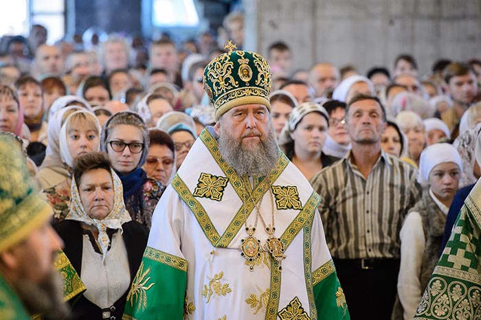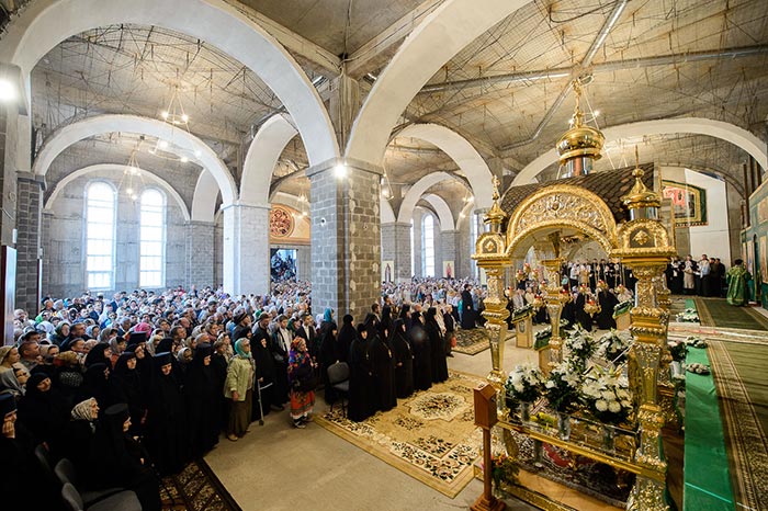 Литургия завершилась славлением перед частью мощей преподобноисповедника Севастиана Карагандинского, положенных в посеребренную гробницу под сенью, выполненную специально для новопостроенного собора на художественно-производственном предприятии Русской Православной Церкви «Софрино».