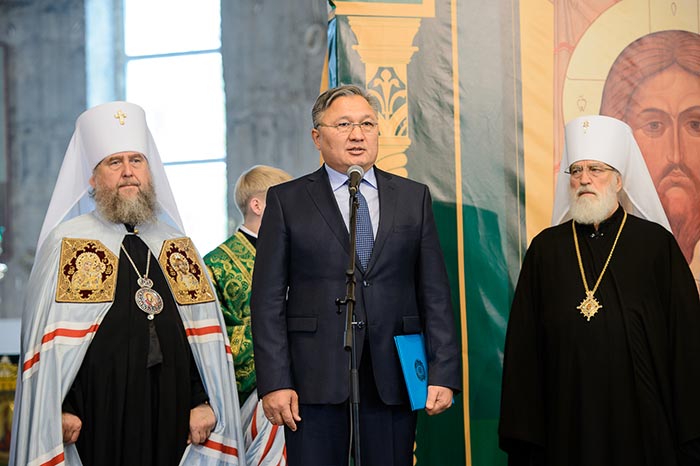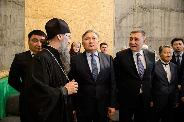 Далее митрополит Александр предоставил слово акиму Карагандинской области Н.К. Абдибекову. Нурмухамбет Канапиевич зачитал приветствие в адрес участников торжеств от Председателя Сената Парламента Республики Казахстан Касым-Жомарт Токаева. Руководитель региона поздравил православных христиан и от себя лично, отметив значимый вклад в духовное развитие Карагандинской области представителей Православного христианства. Н.К. Абдибеков подчеркнул значение трудов старца Севастиана в деле формирования уникального облика Карагандинского края, создания атмосферы братолюбия, взаимопомощи и добрососедства, отличающей землю Сары-Арки.