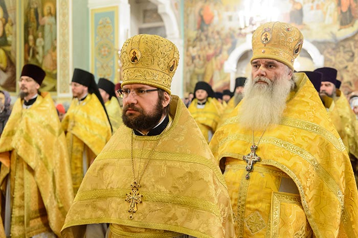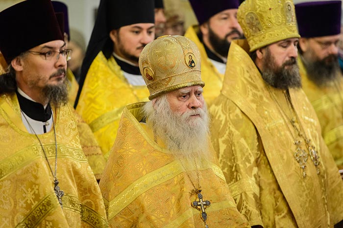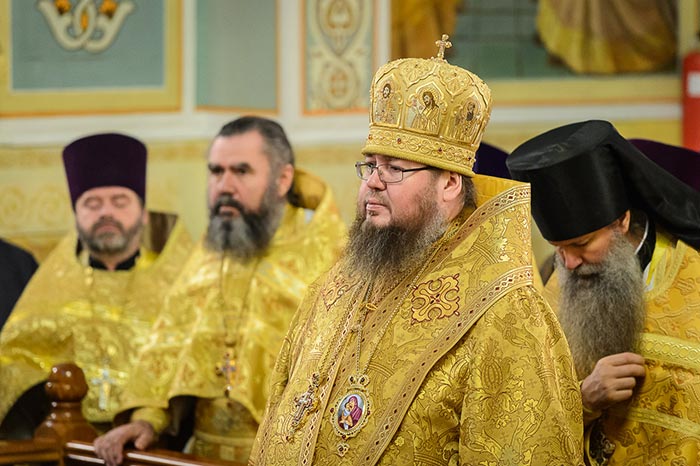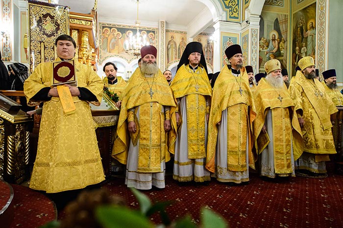 Главе Казахстанского Митрополичьего округа сослужили: викарий Астанайской епархии епископ Талдыкорганский Нектарий, епископ Усть-Каменогорский и Семипалатинский Амфилохий, епископ Кокшетауский и Акмолинский Серапион, епископ Петропавловский и Булаевский Владимир; благочинный храмов Алма-Аты протоиерей Валерий Захаров, благочинный приходов Астаны архимандрит Сергий (Карамышев), руководители епархиальных отделов и комиссий в священном сане, настоятели и духовенство алма-атинских храмов.