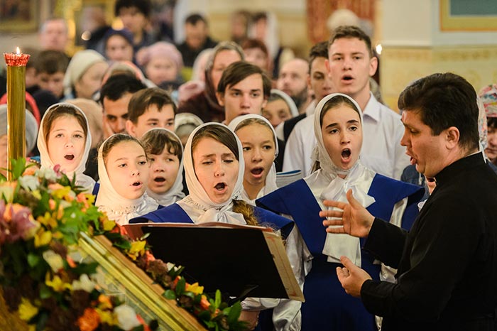 Песнопения Литургии исполняли: хор Никольского собора под управлением О. Берекешевой, хор духовенства Алма-Атинской епархии под управлением игумена Филиппа (Моисеева) и хор центральной детской воскресной школы под управлением В. Самодинова.