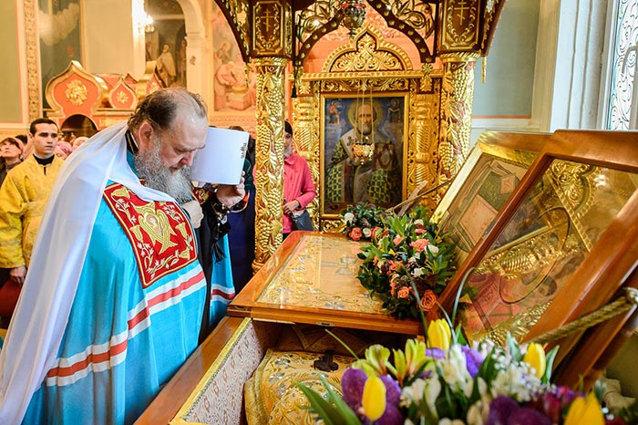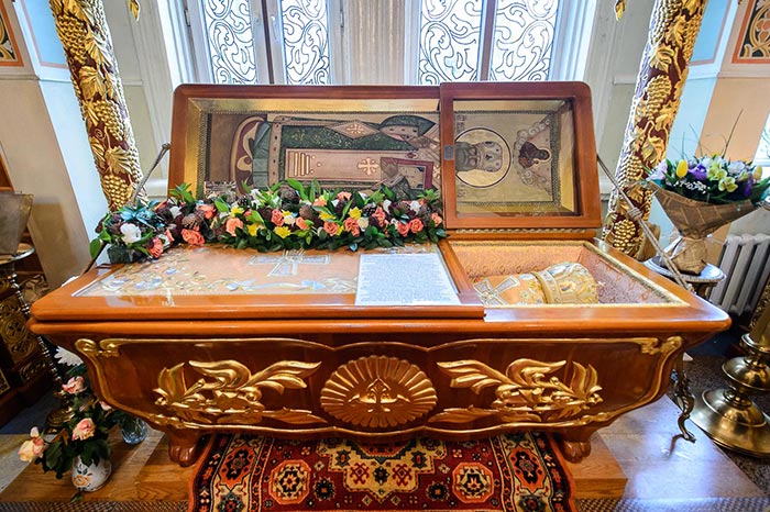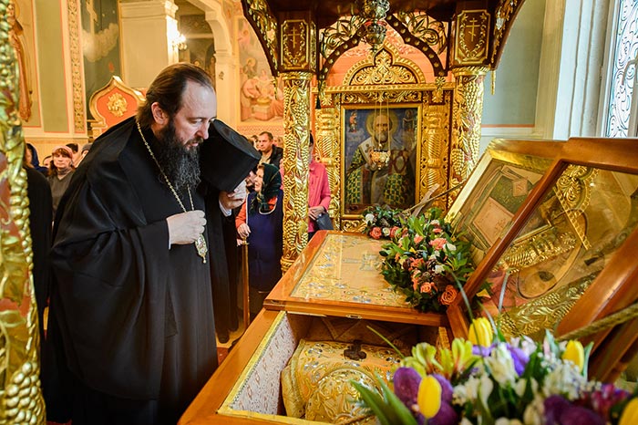 Литургия завершилась славлением небесным покровителям Казахстана перед ракой с мощами священноисповедника митрополита Николая и ковчегом с частью мощей преподобноисповедника Севастиана Карагандинского.