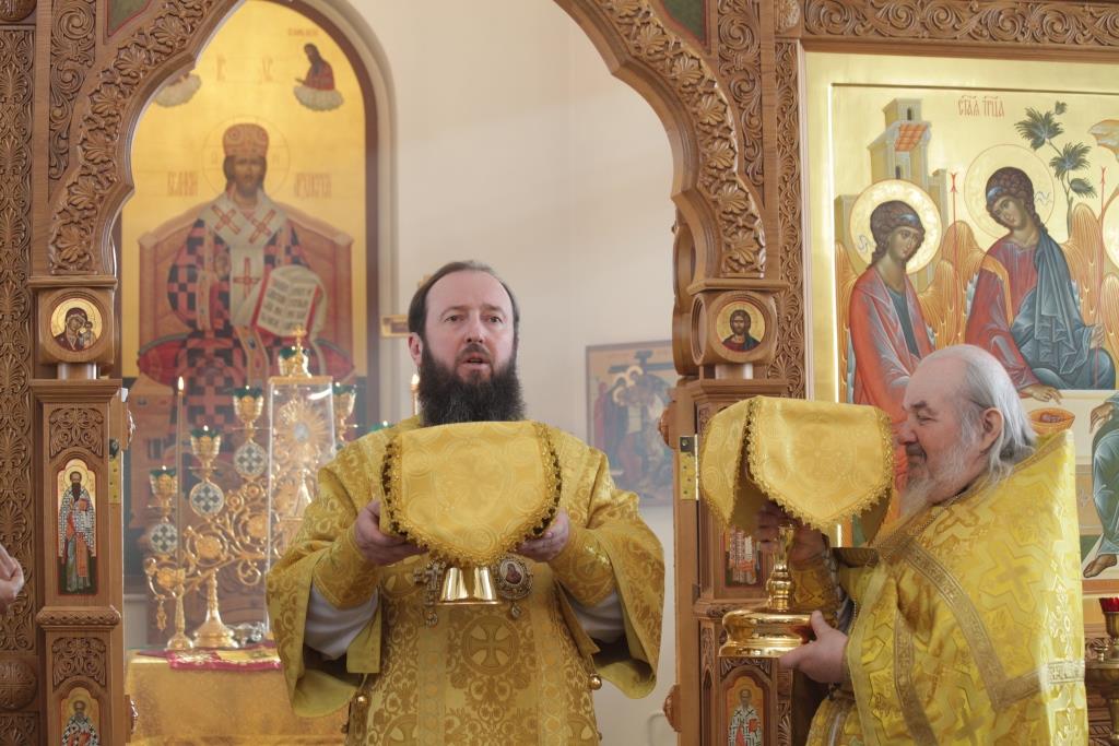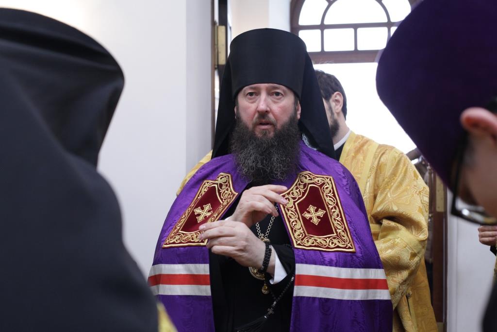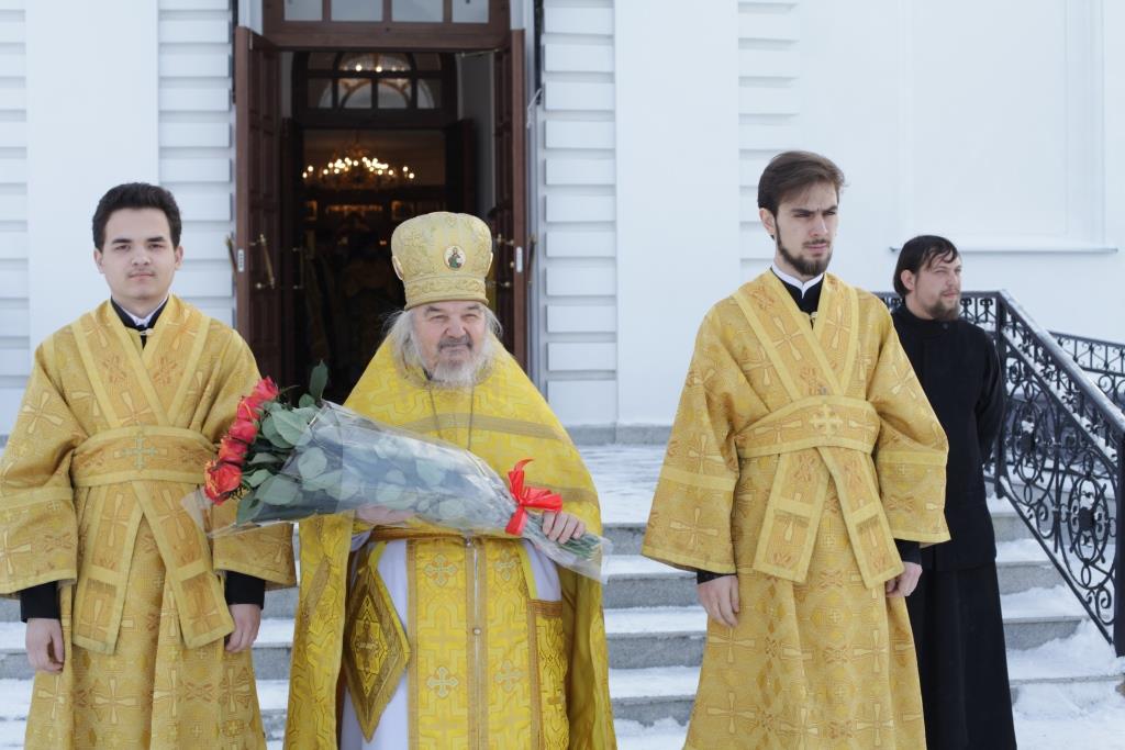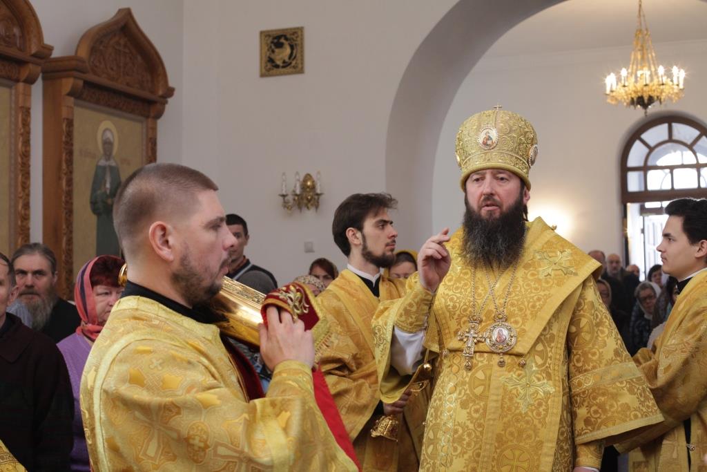 Его Преосвященству сослужили: духовник епархии архимандрит Спиридон (Теплухин), клирик собора иеромонах Севастиан (Андрющенко), протодиаконы Георгий Засыпкин и Андрей Дудник.