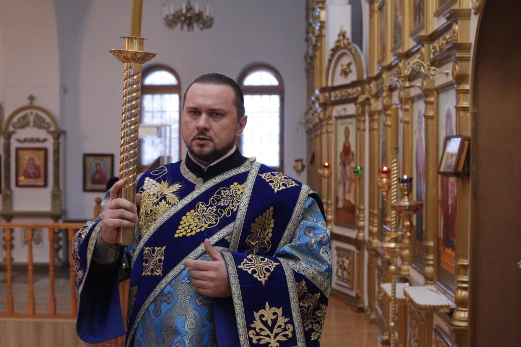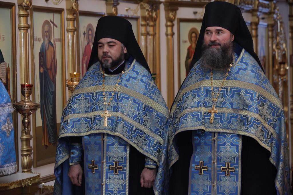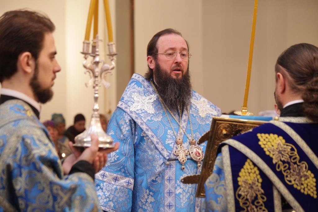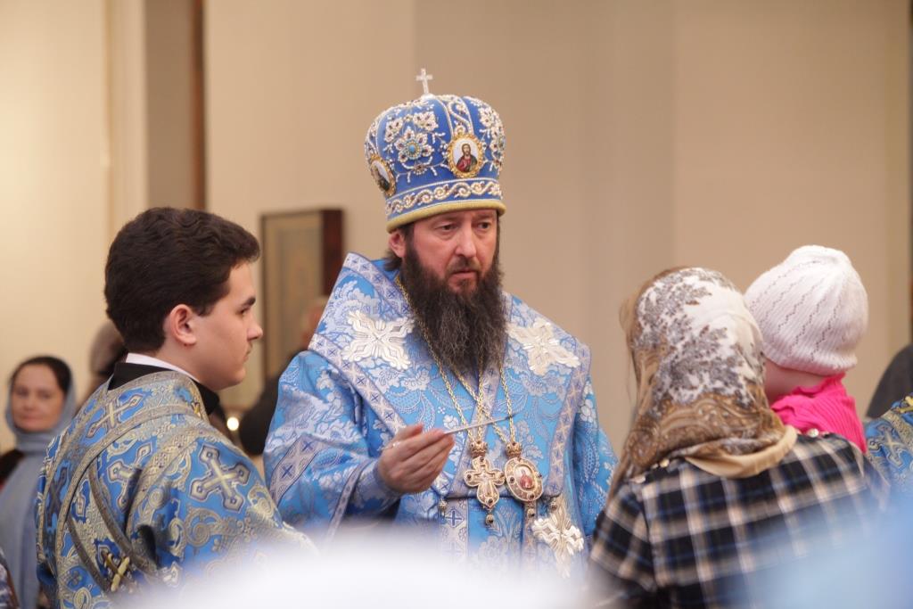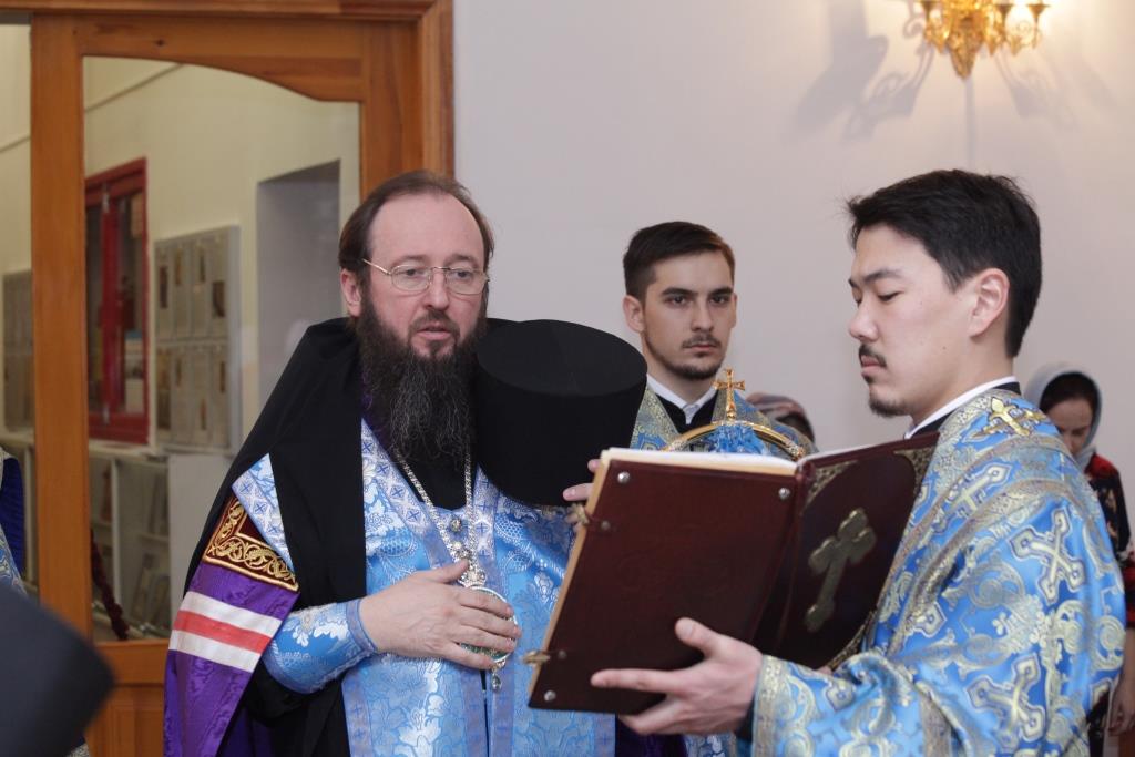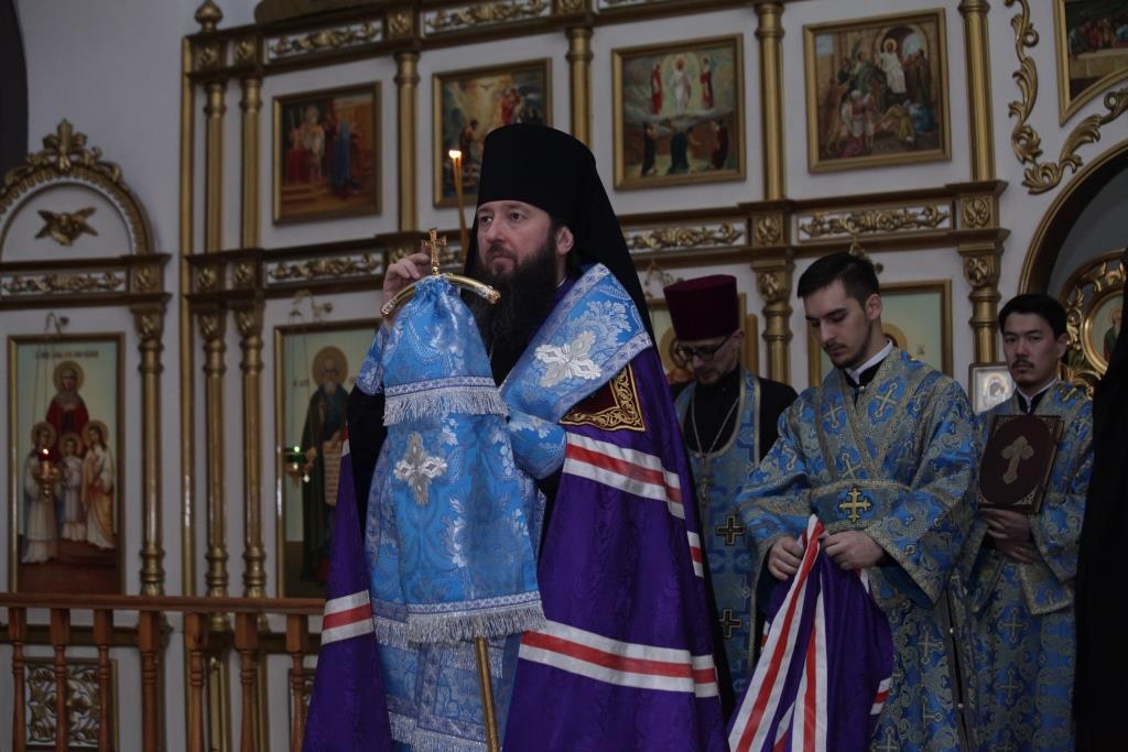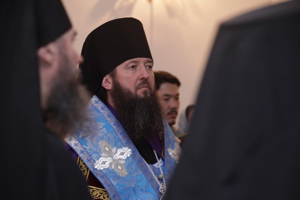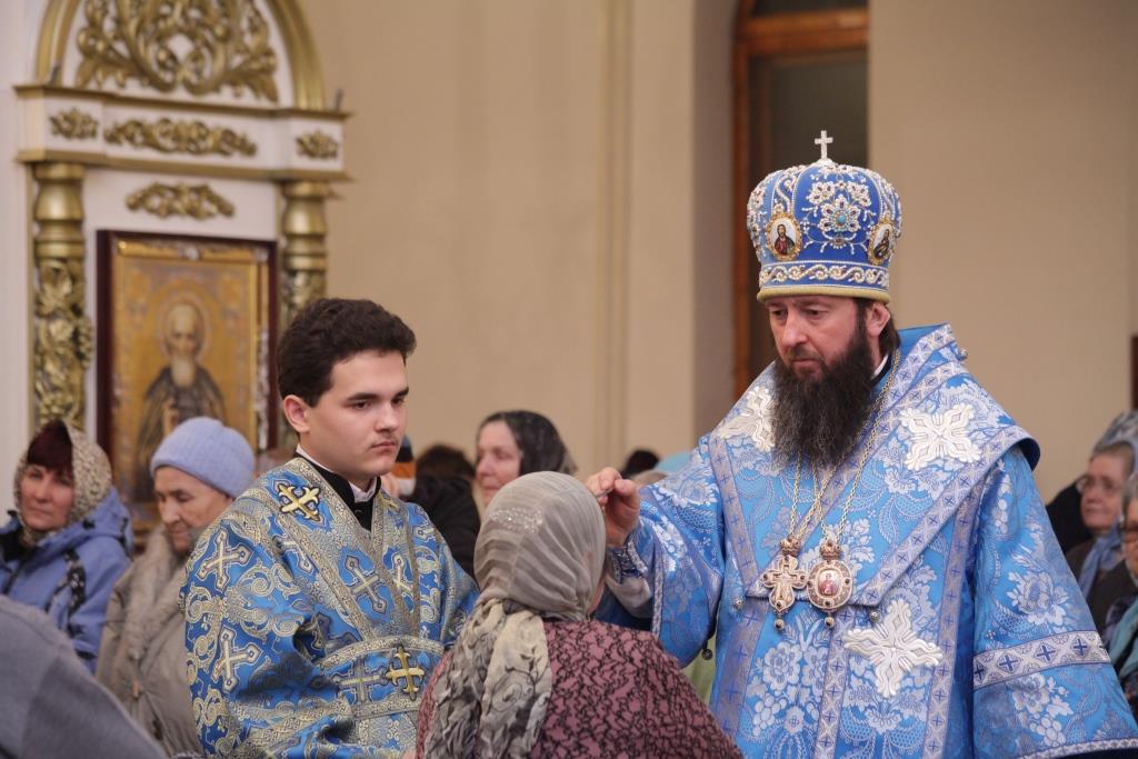 Его Преосвященству сослужили: ключарь собора иеромонах Никодим (Авдеев), клирики собора иеромонах Севастиан (Андрющенко) и иерей Константин Дьяков; протодиакон Андрей Дудник.