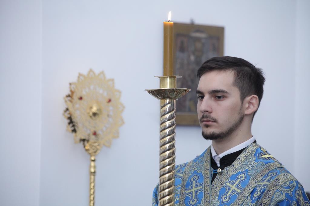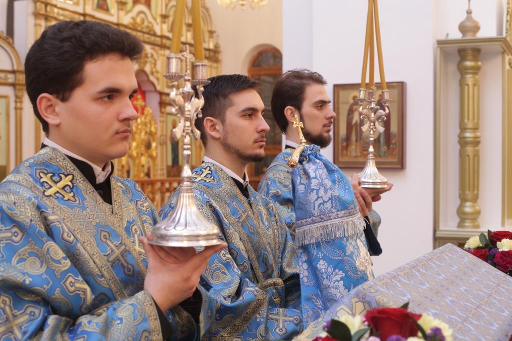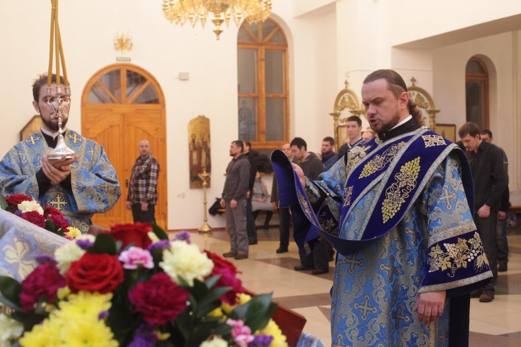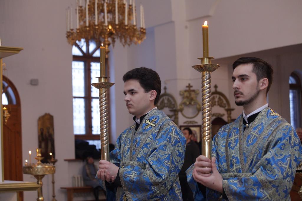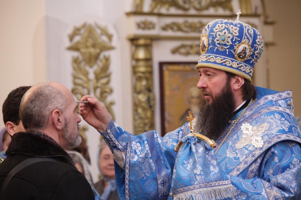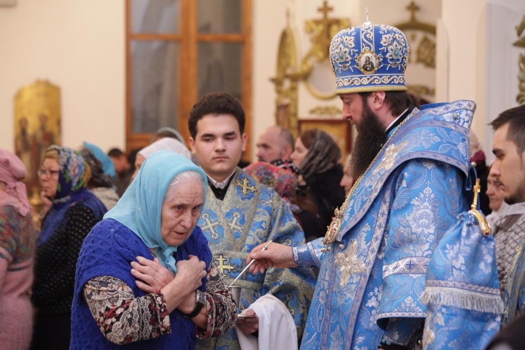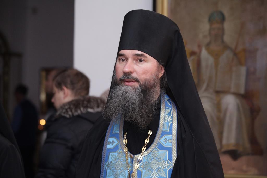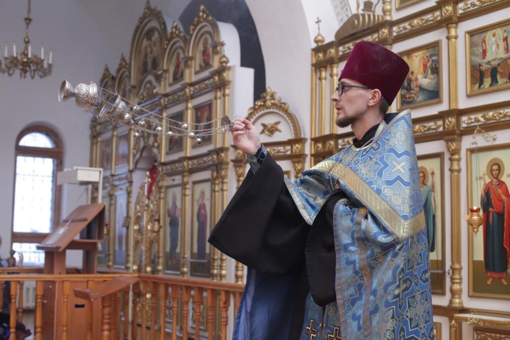 Его Преосвященству сослужили: ключарь собора иеромонах Никодим (Авдеев), клирики собора иеромонах Севастиан (Андрющенко) и иерей Константин Дьяков; протодиакон Андрей Дудник.