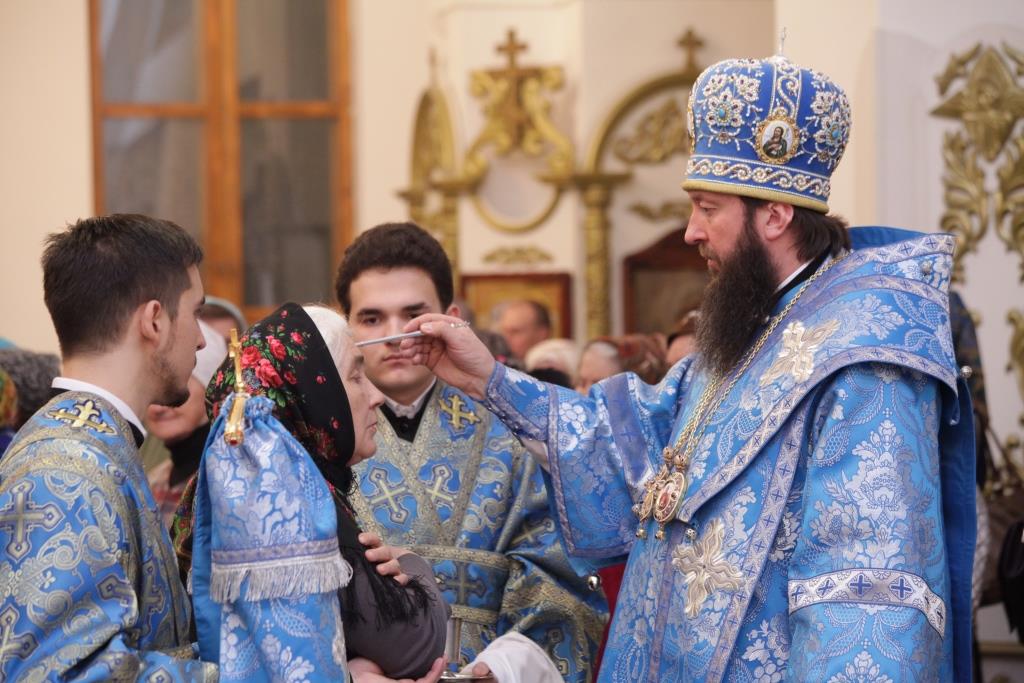 На утрене, после прочтения Евангельского зачала, архипастырь помазал духовенство и верующих освященным елеем.