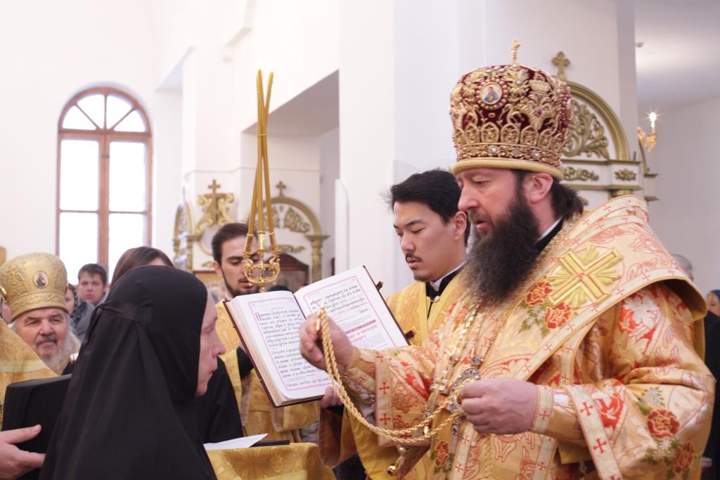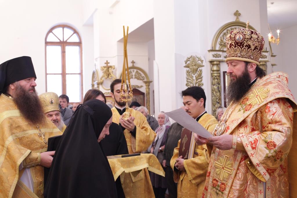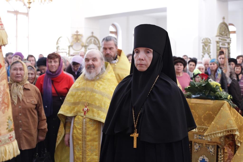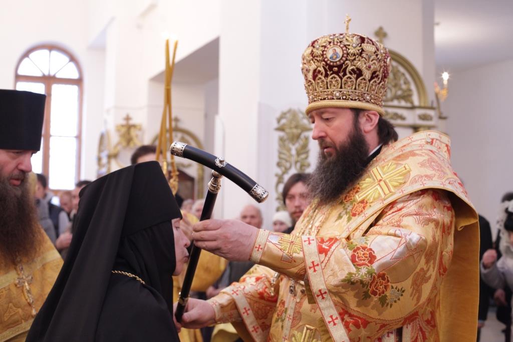 На малом входе Преосвященнейший Владыка, во исполнение благословения Святейшего Патриарха Московского и всея Руси Кирилла и в соответствии с решением Синода Казахстанского Митрополичьего Округа, возвел настоятельницу Знаменско-Абалацкого Петро-Павловского женского монастыря что в городе Семипалатинске монахиню Мариониллу (Помельникову) в сан игумении. Епископ Амфилохий возложил на матушку игумению наперсный крест и вручил игуменский жезл.
