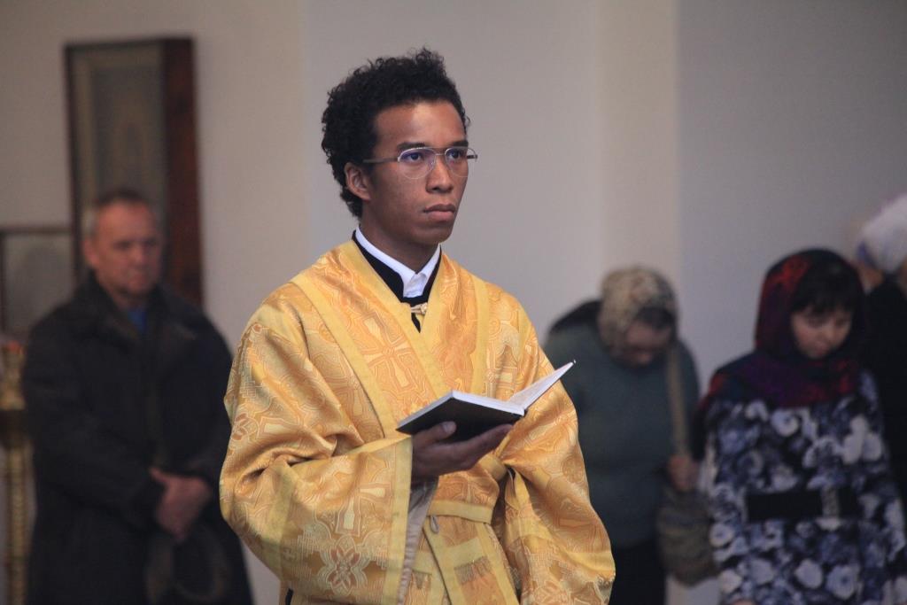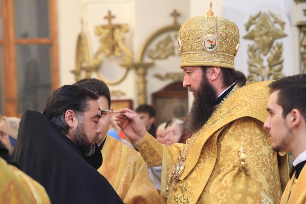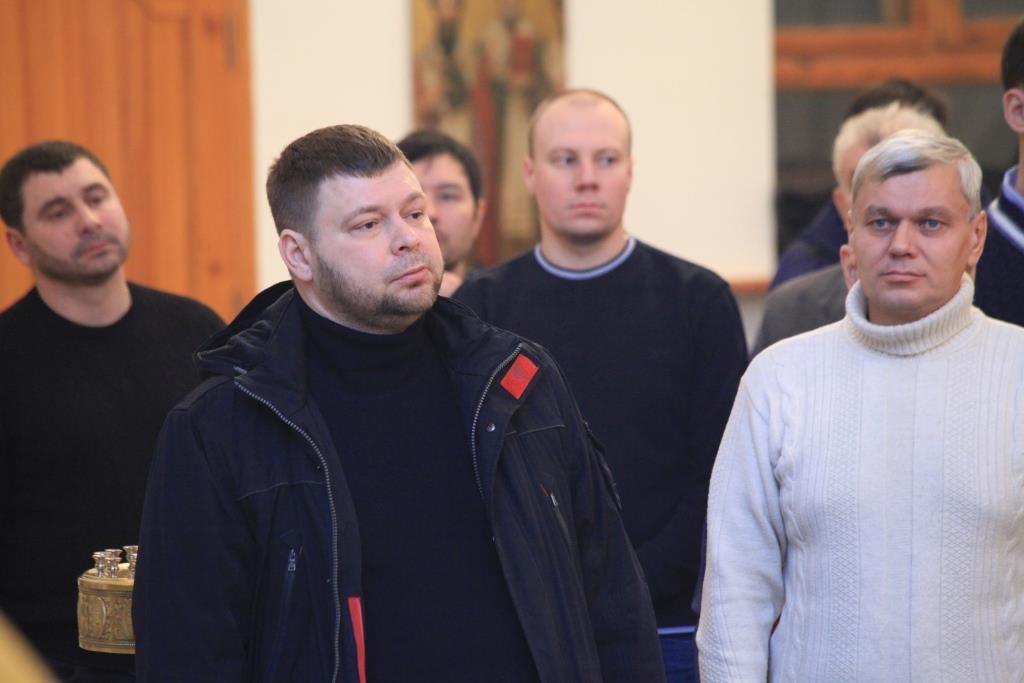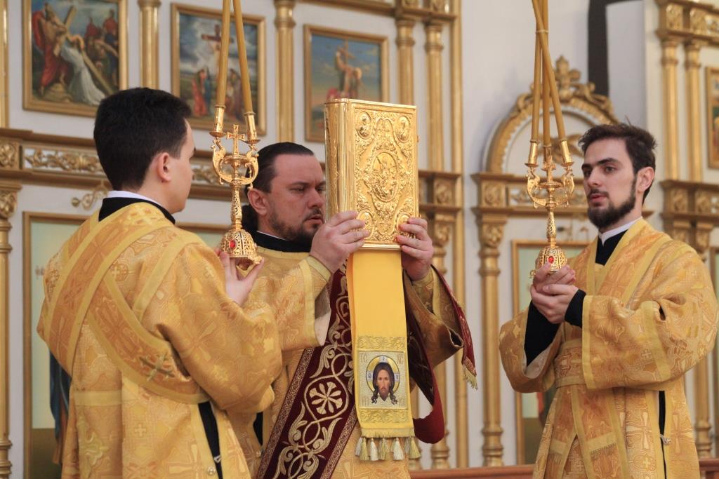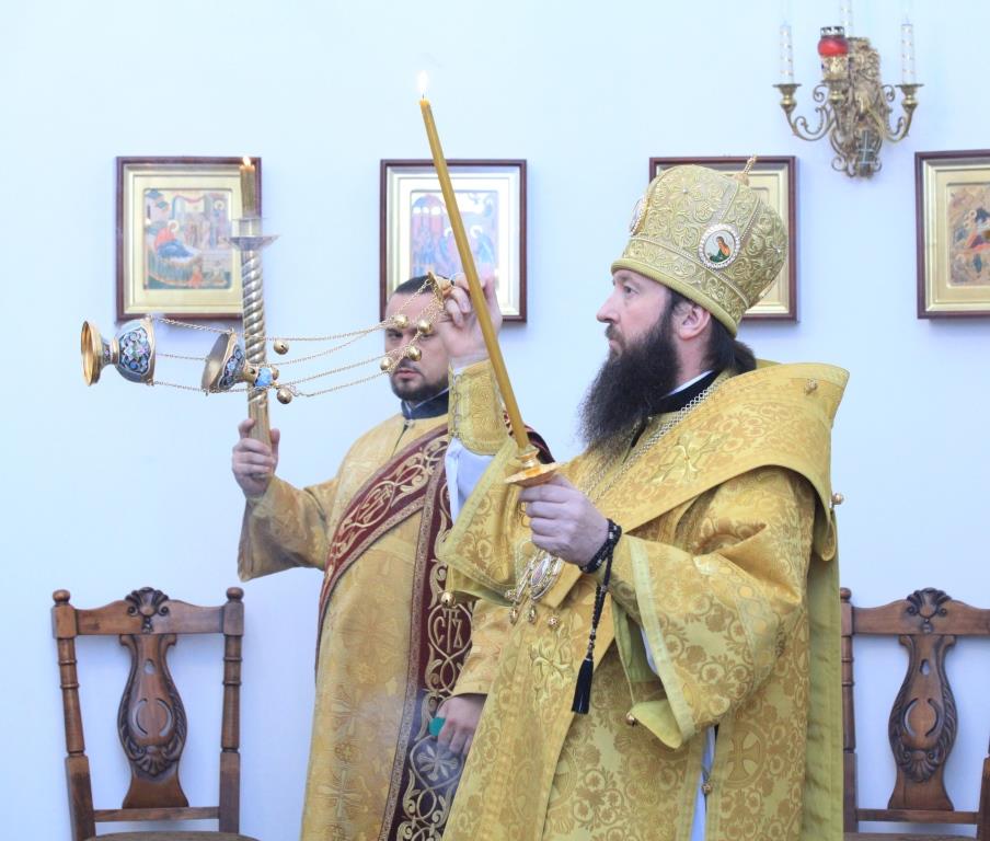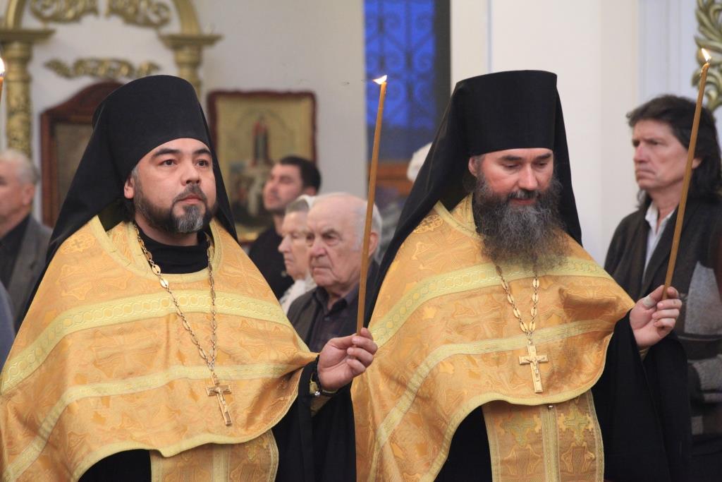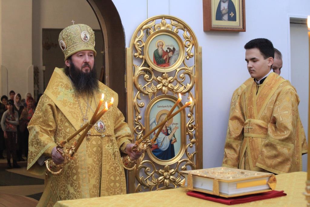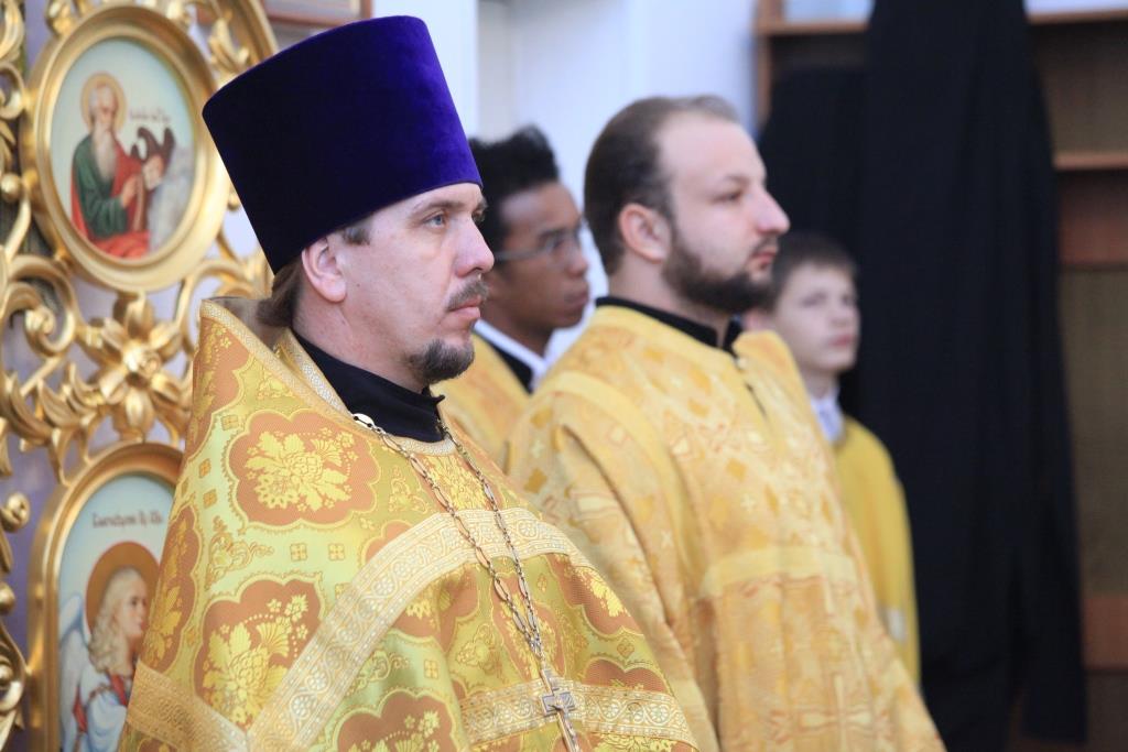 Его Преосвященству сослужили: ключарь собора иеромонах Никодим (Авдеев), клирики собора иеромонах Севастиан (Андрющенко), иерей Алексий Клепиков и иерей Константин Дьяков; протодиаконы Георгий Засыпкин и Андрей Дудник, иеродиакон Мефодий (Шевчук), диакон Алексий Горбунов.