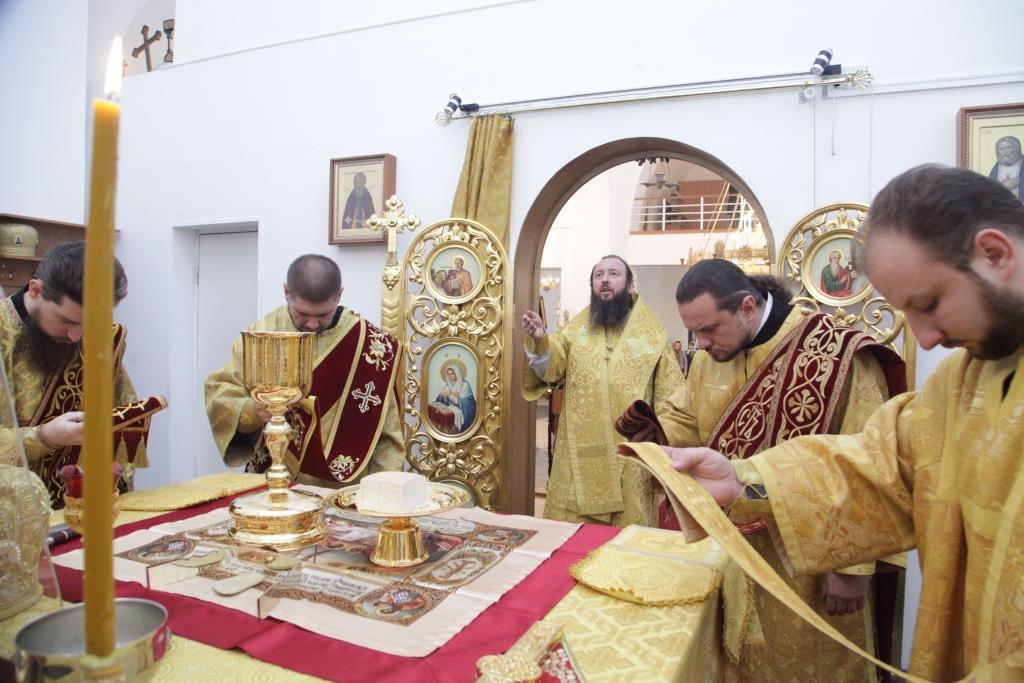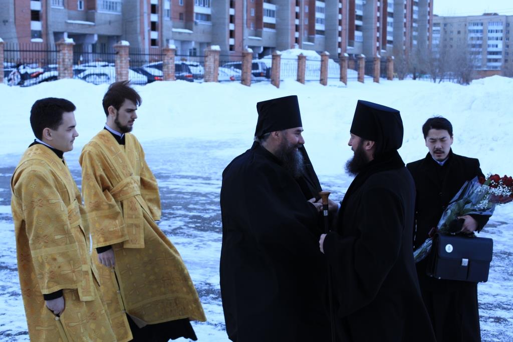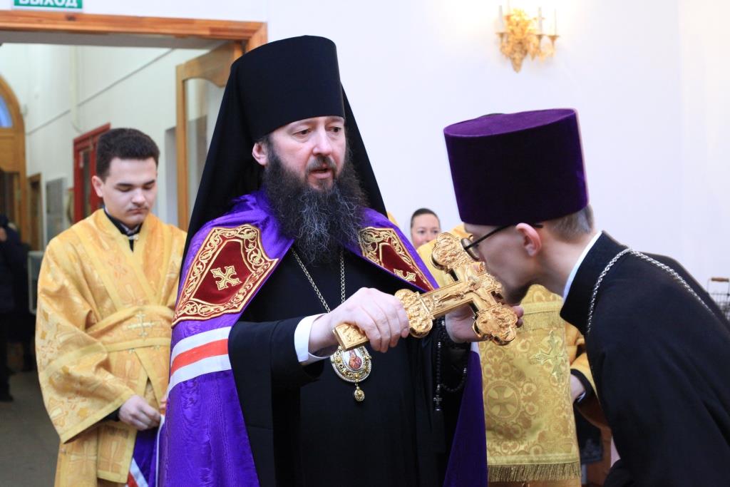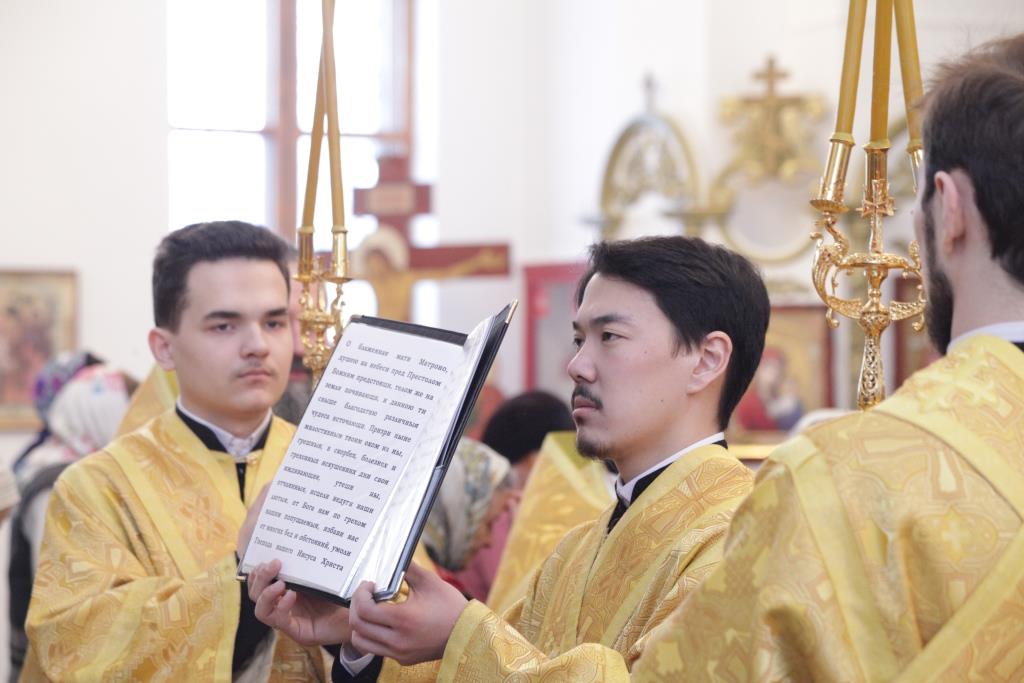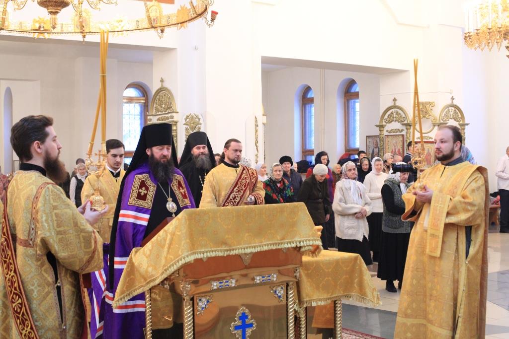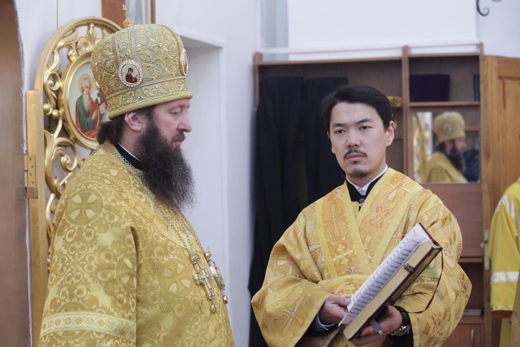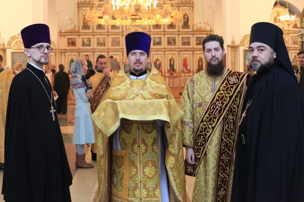 Архипастырю сослужили: духовник епархии архимандрит Спиридон (Теплухин), ключарь кафедрального собора иеромонах Никодим (Авдеев), клирики главного храма Восточного Казахстана иерей Алексий Клепиков и иерей Константин Дьяков, протодиаконы Георгий Засыпкин и Андрей Дудник, иеродиакон Мефодий (Шевчук), диакон Алексий Горбунов.