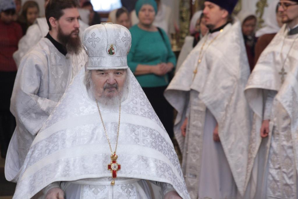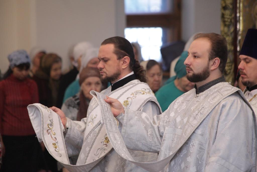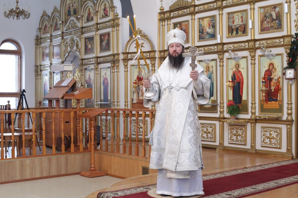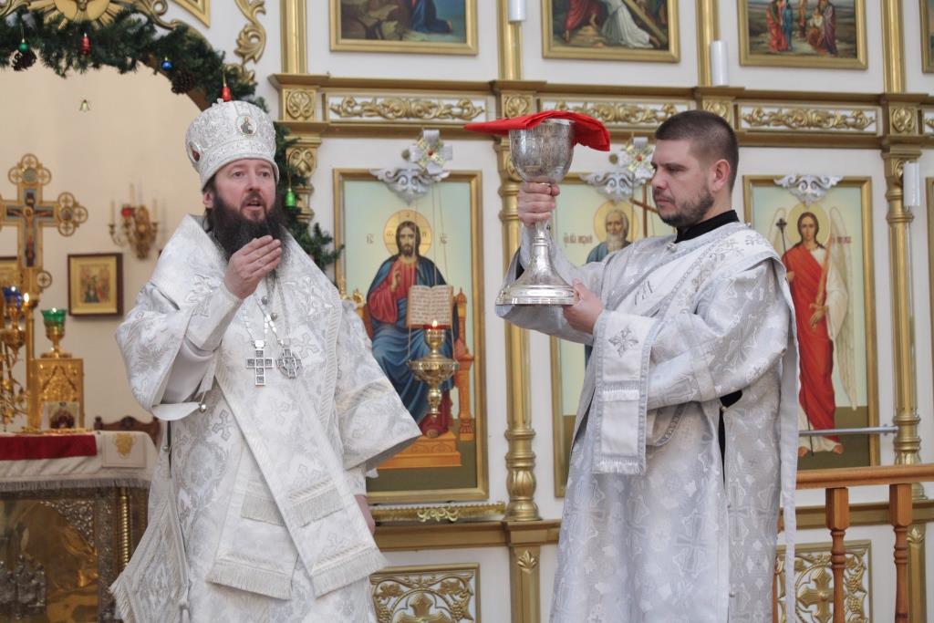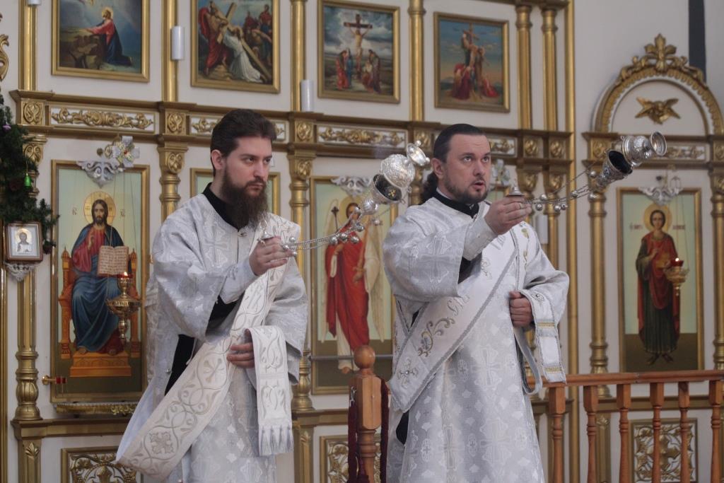 Его Преосвященству сослужили: духовник епархии архимандрит Спиридон (Теплухин), ключарь собора иеромонах Никодим (Авдеев), клирики собора иерей Алексий Клепиков и иерей Константин Дьяков; протодиаконы Георгий Засыпкин и Андрей Дудник, иеродиакон Мефодий (Шевчук), диакон Алексий Горбунов.