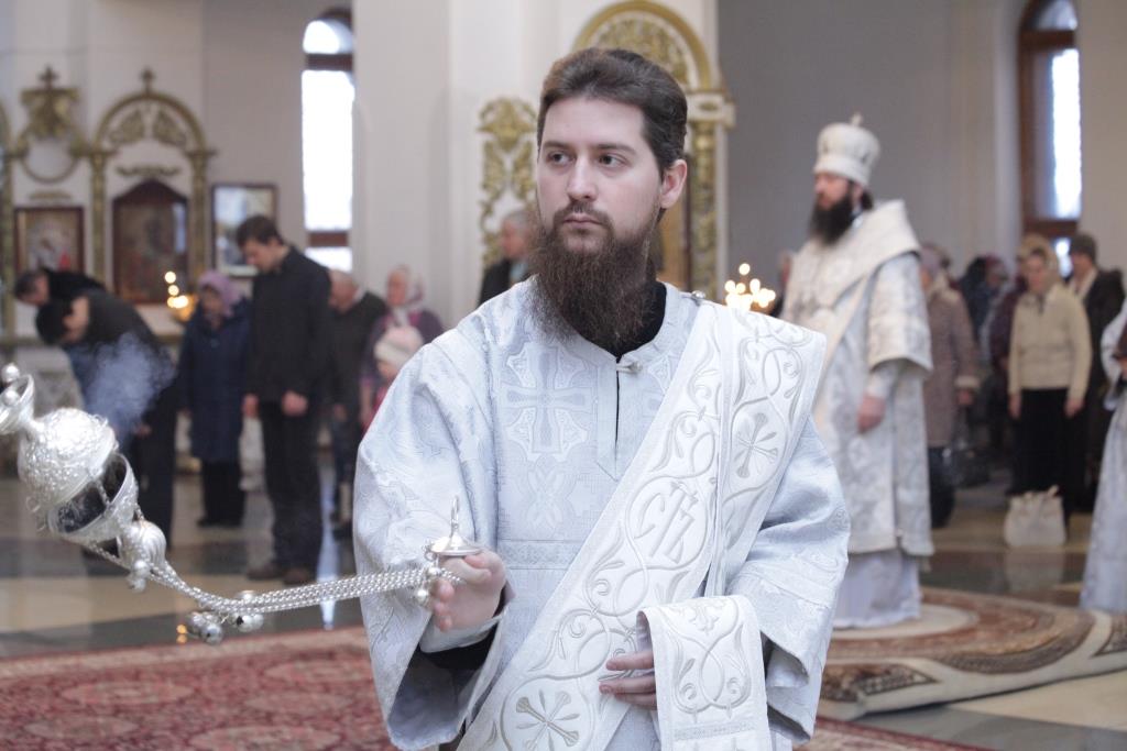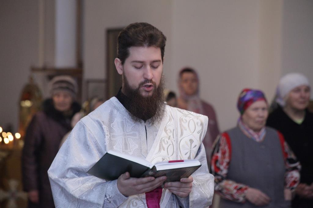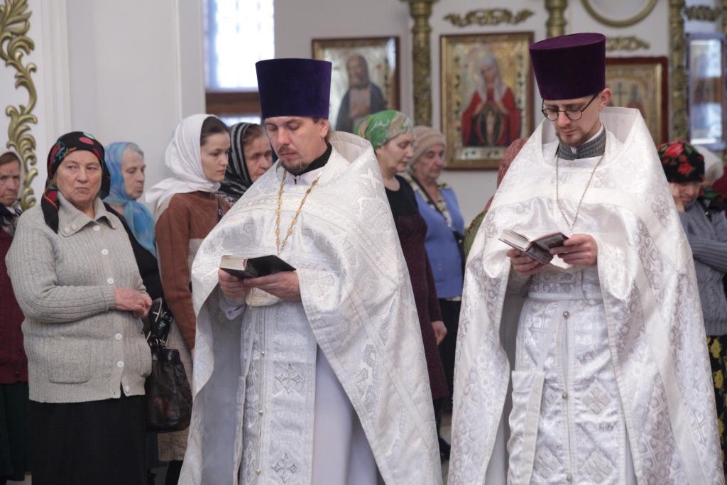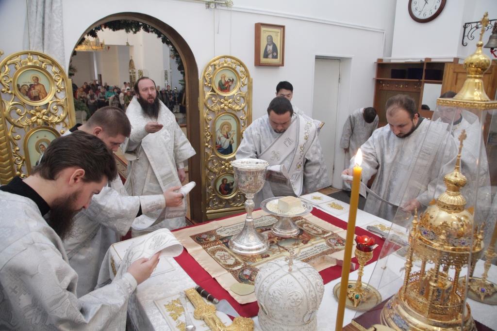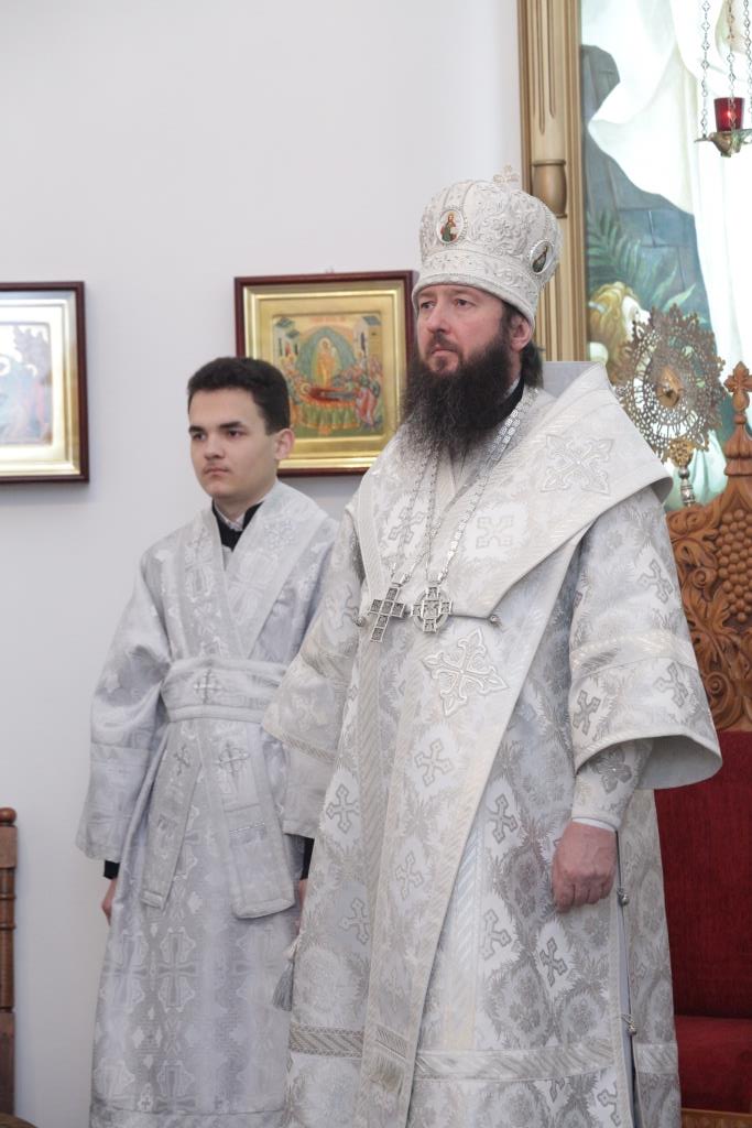 Его Преосвященству сослужили: духовник епархии архимандрит Спиридон (Теплухин), ключарь собора иеромонах Никодим (Авдеев), клирики собора иерей Алексий Клепиков и иерей Константин Дьяков; протодиаконы Георгий Засыпкин и Андрей Дудник, иеродиакон Мефодий (Шевчук), диакон Алексий Горбунов.