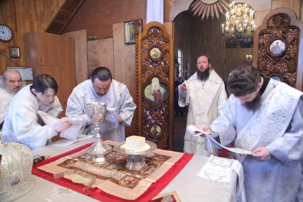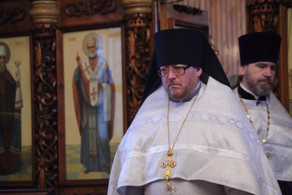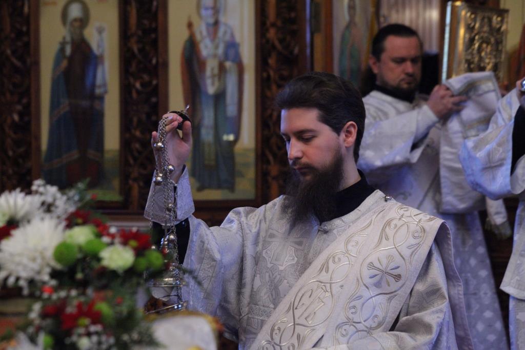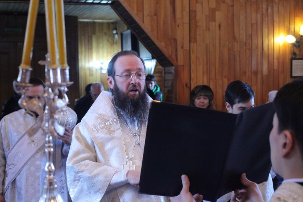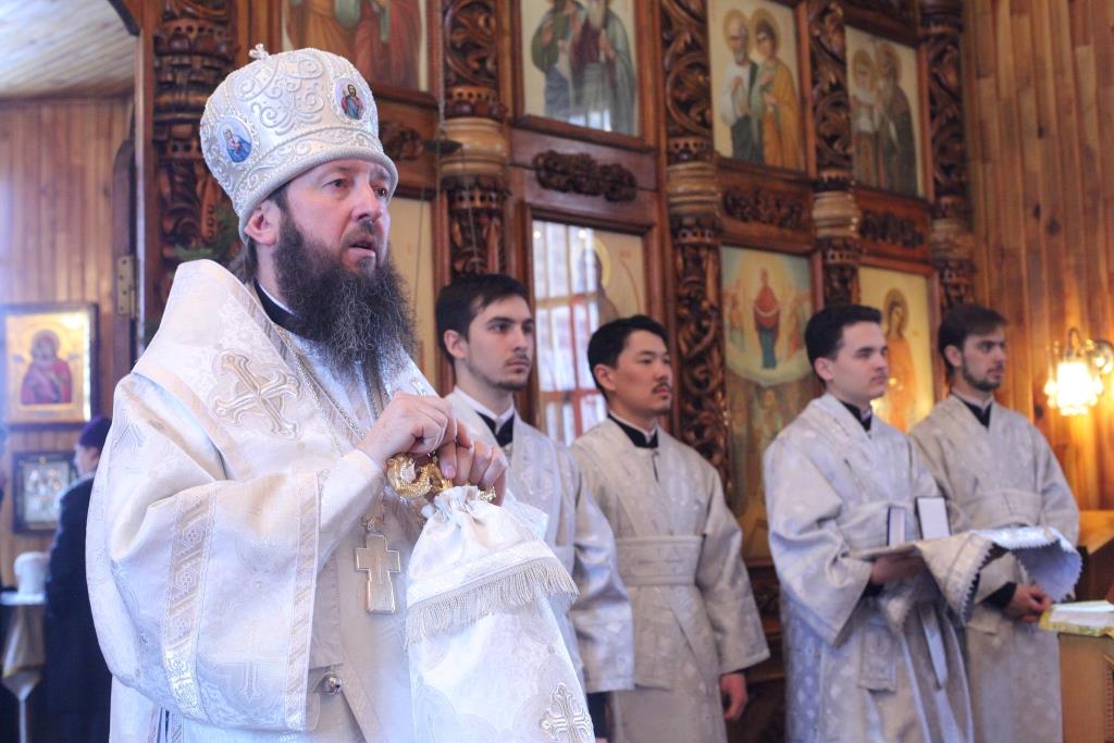 Владыке епископу сослужили: духовник епархии архимандрит Спиридон (Теплухин), благочинный Усть-Каменогорского церковного округа, настоятель Покровского храма иерей Алексий Анищенко, ключарь Андреевского кафедрального собора иеромонах Никодим (Авдеев), клирики Покровской церкви иеромонах Иустин (Ларионов) и иерей Александр Закурдаев. Диаконский чин возглавил протодиакон Андрей Дудник.
