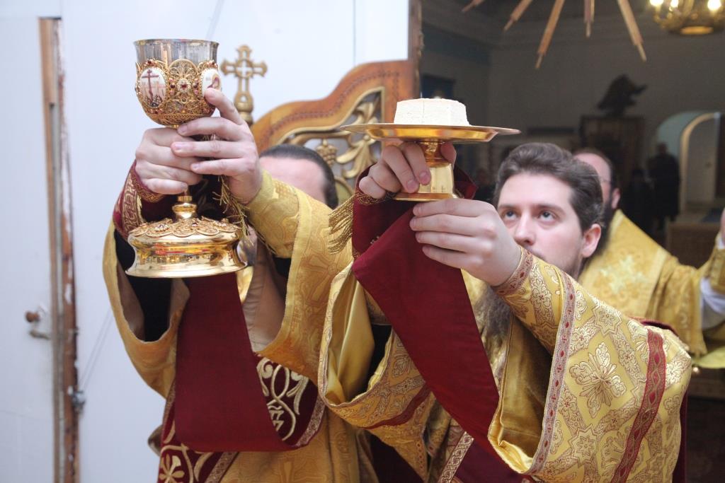 Песнопения Божественной Литургии исполнял мужской хор под управлением А. Шагидевича.