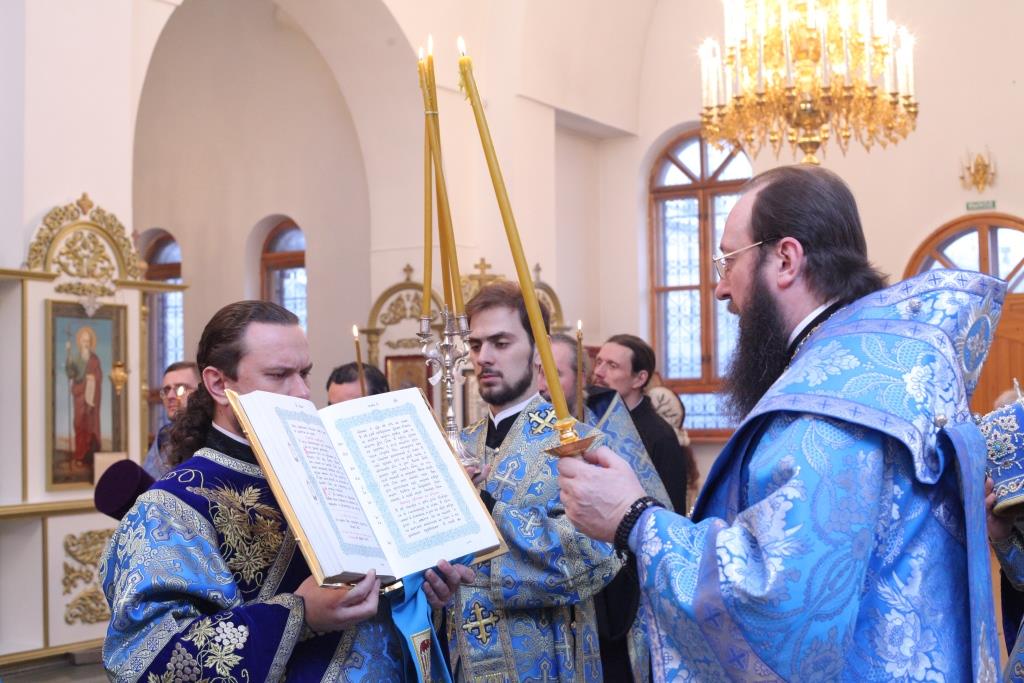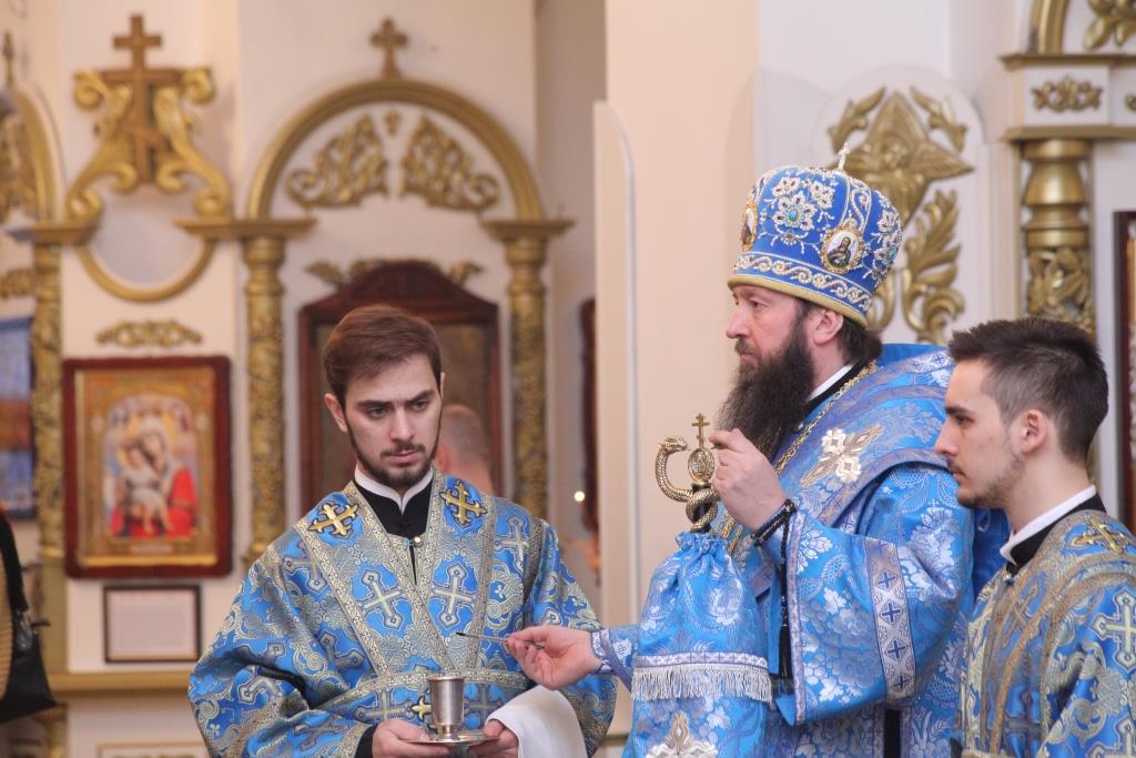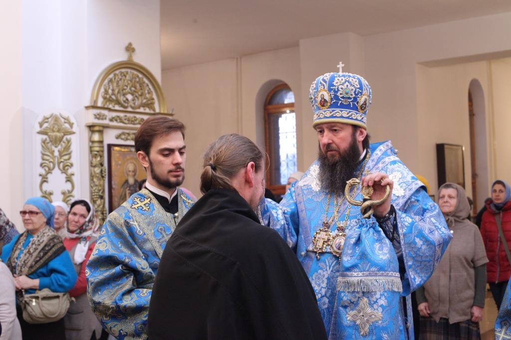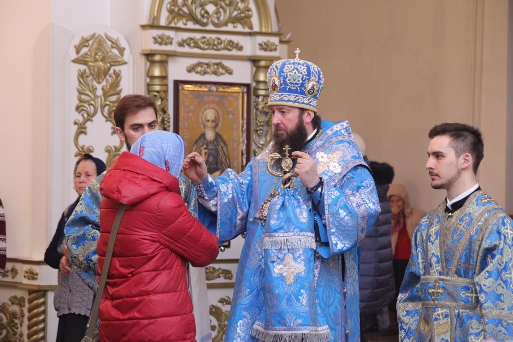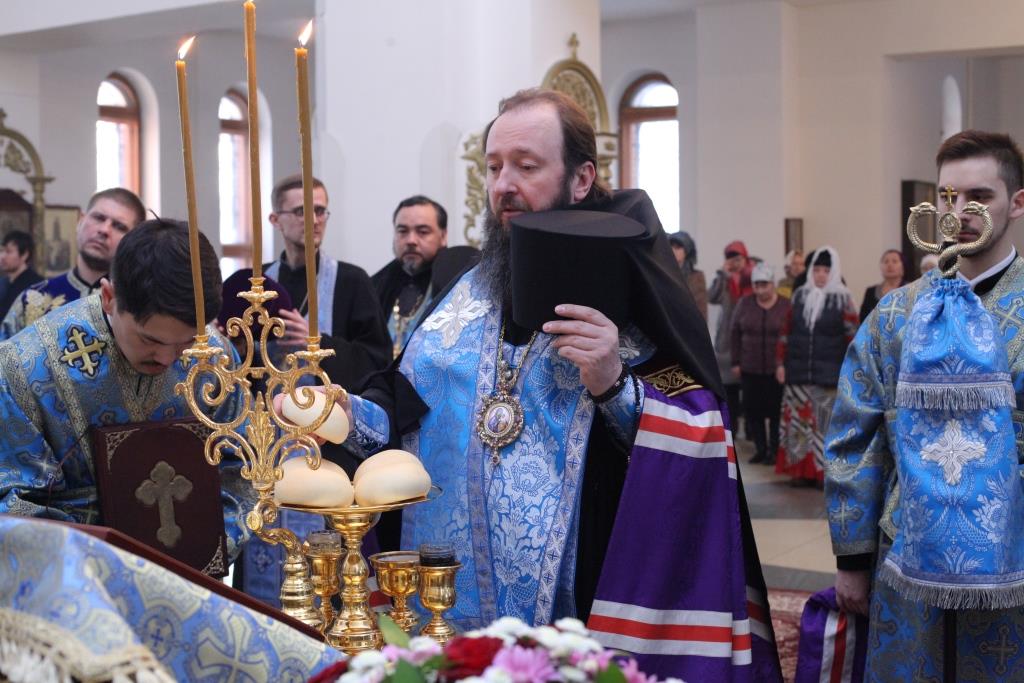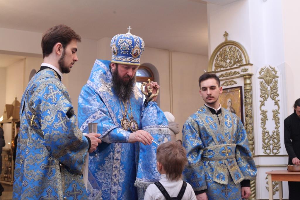 Преосвященнейшему Архипастырю сослужили: ключарь собора иеромонах Никодим (Авдеев), клирики собора иерей Алексий Клепиков, иеромонах Севастиан (Андрющенко) и иерей Константин Дьяков; протодиаконы Георгий Засыпкин и Андрей Дудник, иеродиакон Мефодий (Шевчук), диакон Алексий Горбунов.