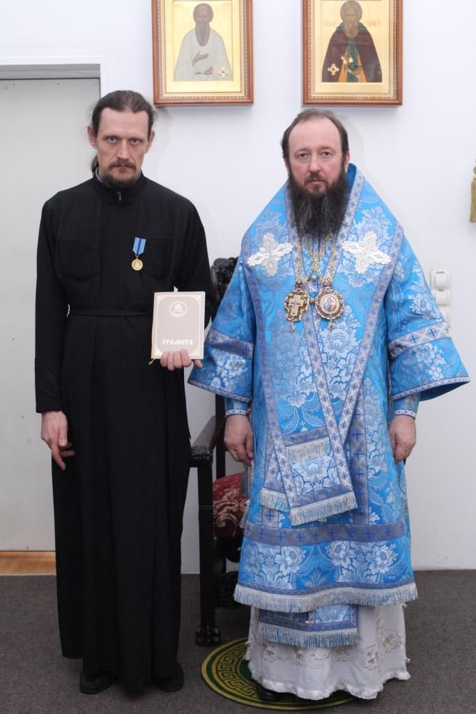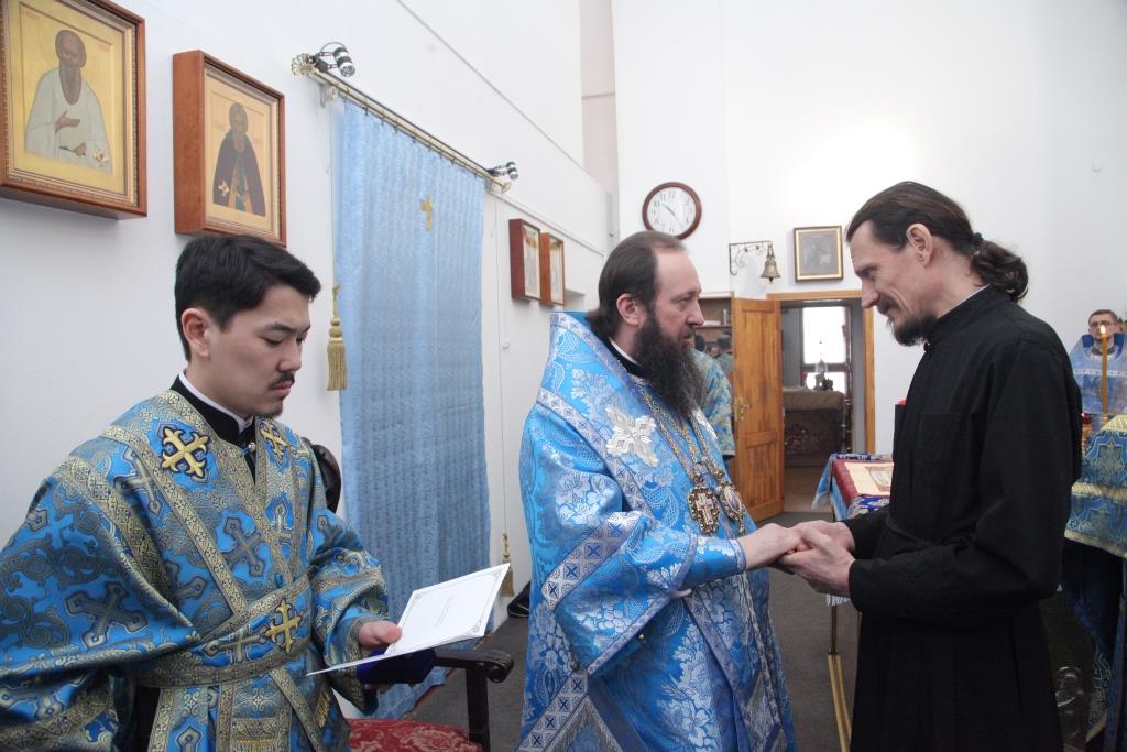 За богослужением епископ Амфилохий наградил старейшего пономаря Андреевского собора В. Сидехменова медалью «За заслуги перед Православной Церковью Казахстана» за 20-летние пономарские труды и в связи с 45-летием со дня рождения.