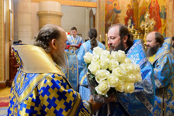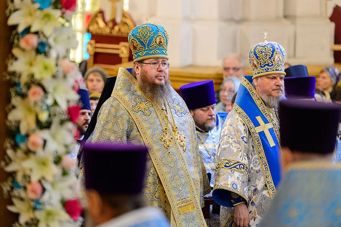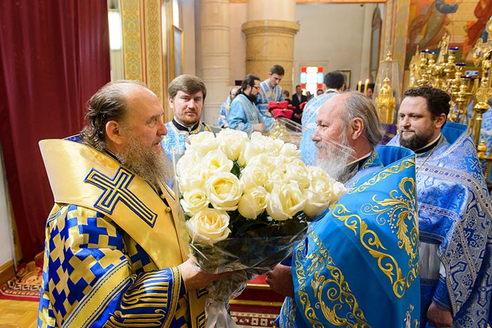 Главе Православной Церкви Казахстана сослужили: викарий Астанайской епархии епископ Талдыкорганский Нектарий, управляющий делами Казахстанского Митрополичьего округа епископ Каскеленский Геннадий, епископ Карагандинский и Шахтинский Севастиан, епископ Усть-Каменогорский и Семипалатинский Амфилохий, епископ Петропавловский и Булаевский Владимир; благочинный храмов Алма-Аты, настоятель Свято-Никольского собора протоиерей Валерий Захаров, благочинный храмов Астаны архимандрит Сергий (Карамышев), руководители епархиальных отделов и комиссий в священном сане; настоятели и духовенство храмов Алма-Атинской епархии, священнослужители, прибывшие с гостями архипастырями.