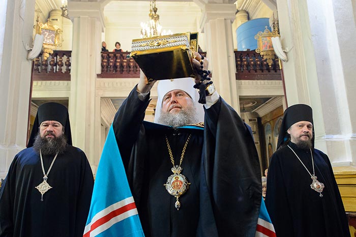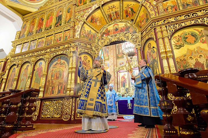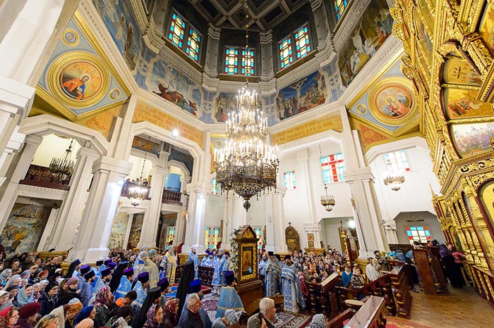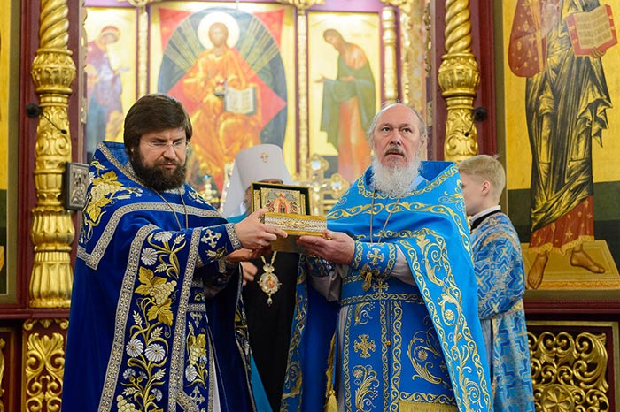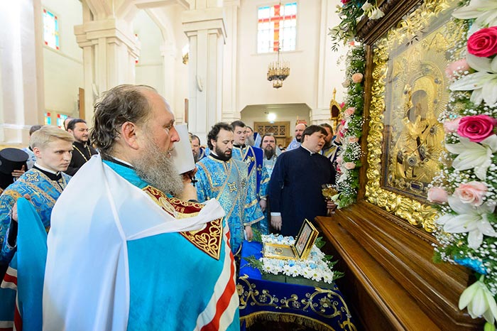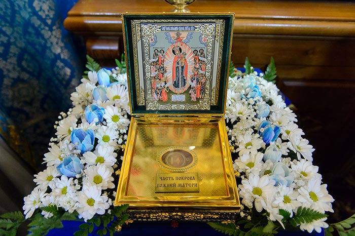 Литургия завершилась славлением перед Алма-Атинской Феодоровской иконой Пресвятой Богородицы – точным списком с чудотворного Феодоровского образа Богородицы и ковчегом с частью Покрова Пресвятой Богородицы.