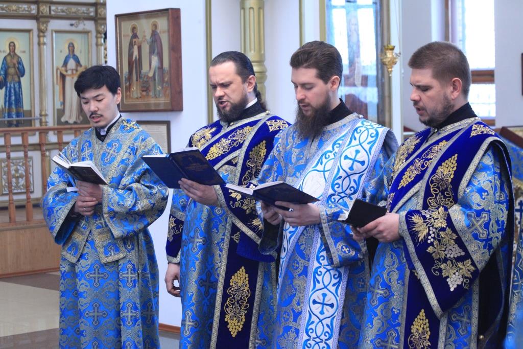 Песнопения великопостной утрени и Акафиста Пресвятой Богородице исполняли клирики кафедрального собора и хор под управлением регента В. Фёдоровой. За Богослужением молились братия Свято-Троицкого мужского монастыря, сотрудники епархиального управления, прихожане и паломники главного храма Рудного Алтая.
