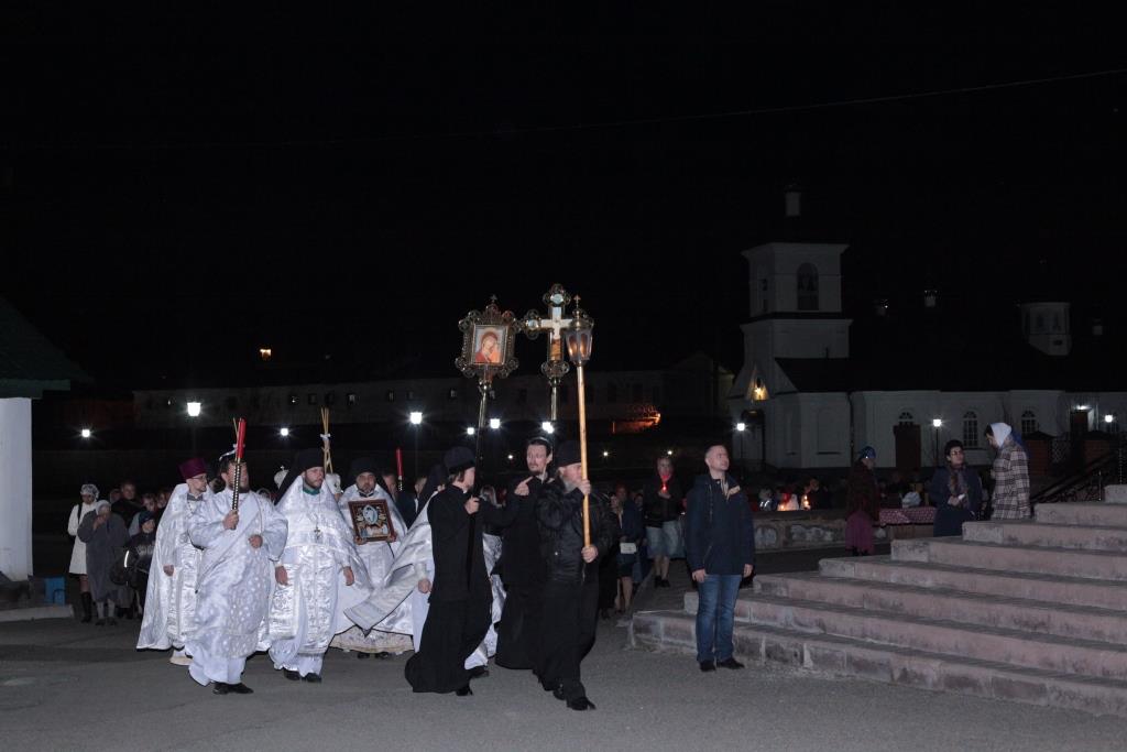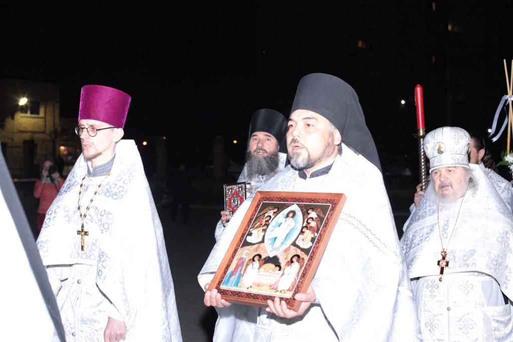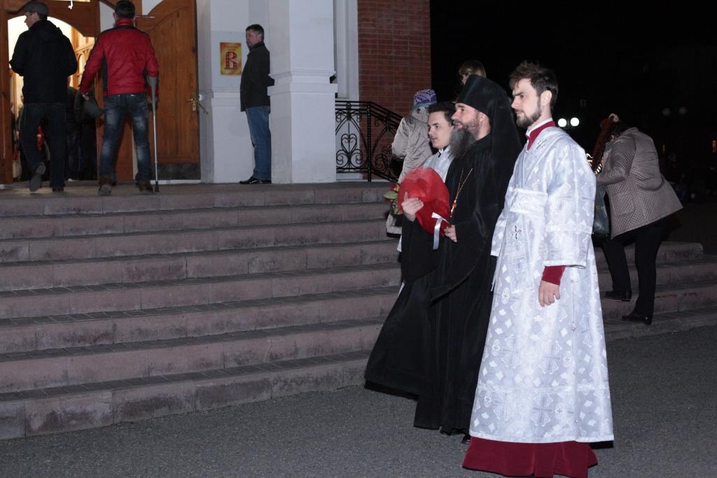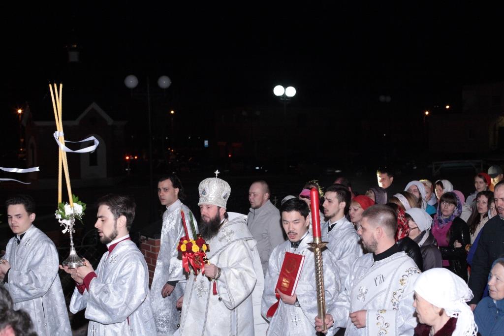 Ровно в полночь, под колокольный звон и пение стихиры «Воскресение Твое, Христе Спасе», был совершен крестный ход. Богослужение продолжилась пением пасхального канона, на каждой песне которого клирики кафедрального собора совершали малое каждение и поздравляли многочисленных прихожан и паломников со Светлым Христовым Воскресением. Пасхальные песнопения исполняли хор кафедрального собора под управлением В. Федоровой и мужской хор под управлением А. Шагидевича.