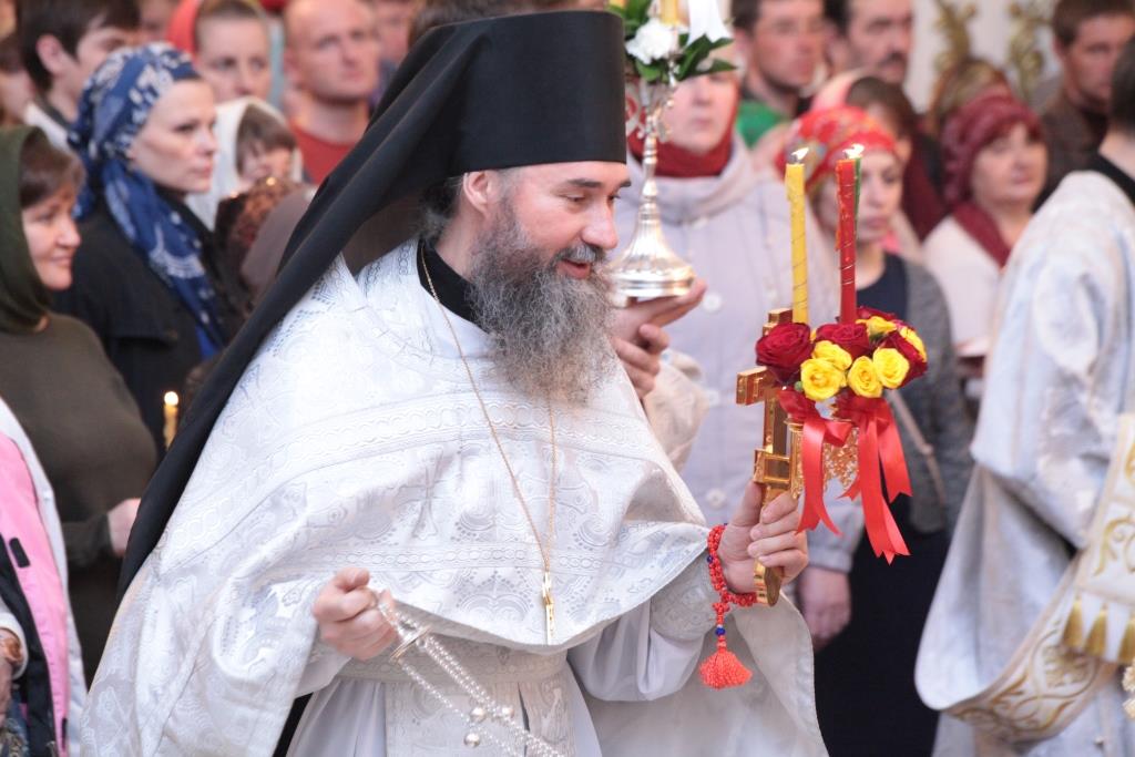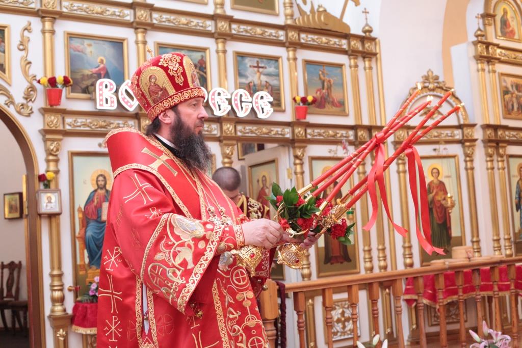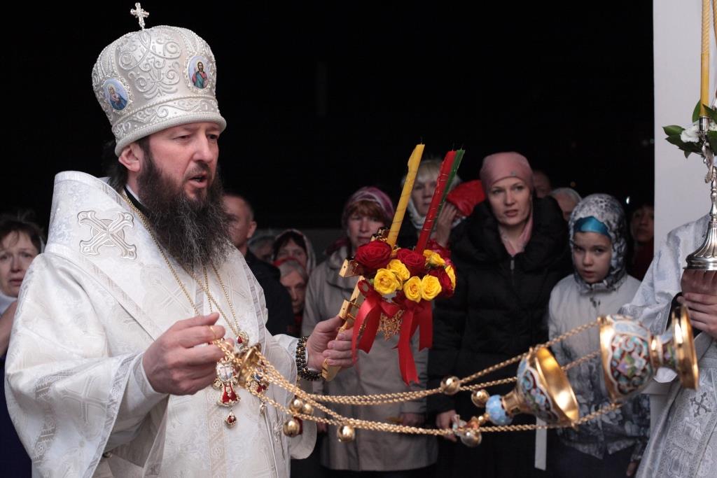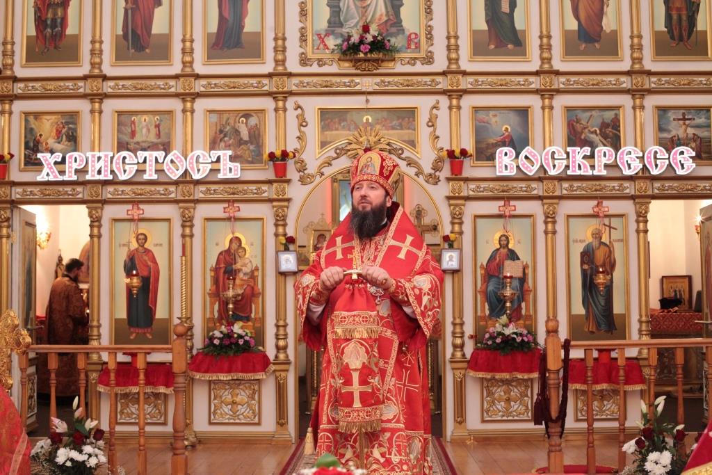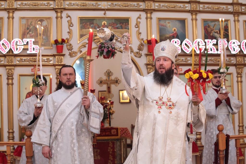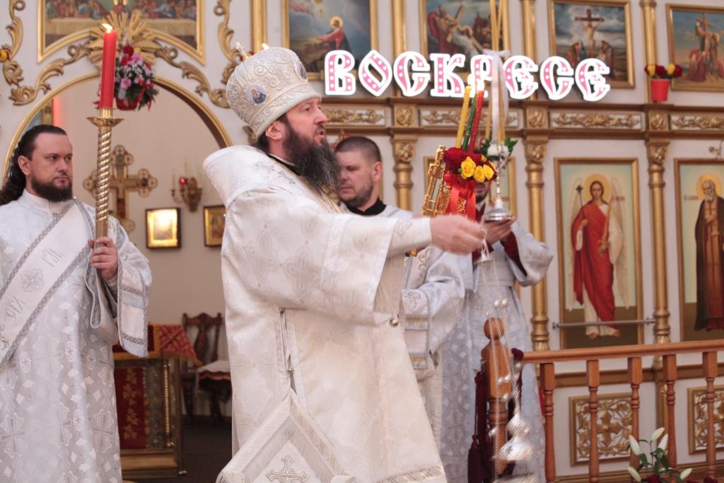После заамвонной молитвы епископ Амфилохий освятил артосы, и обратился к народу Божию со словами пасхального приветствия, в котором поздравил всех с великим торжеством и мироспасительным праздником Воскресения Господа Бога и Спаса нашего Иисуса Христа. В завершение Богослужения Преосвященнейший Владыка освятил пасхальную трапезу: крашеные яйца, творожные пасхи и куличи.