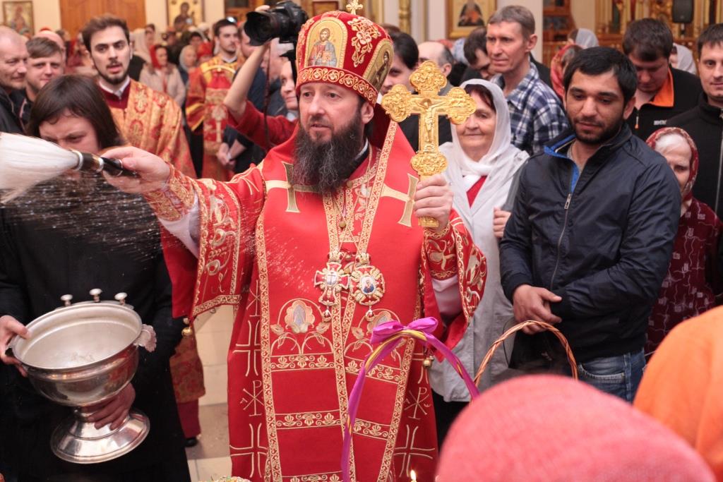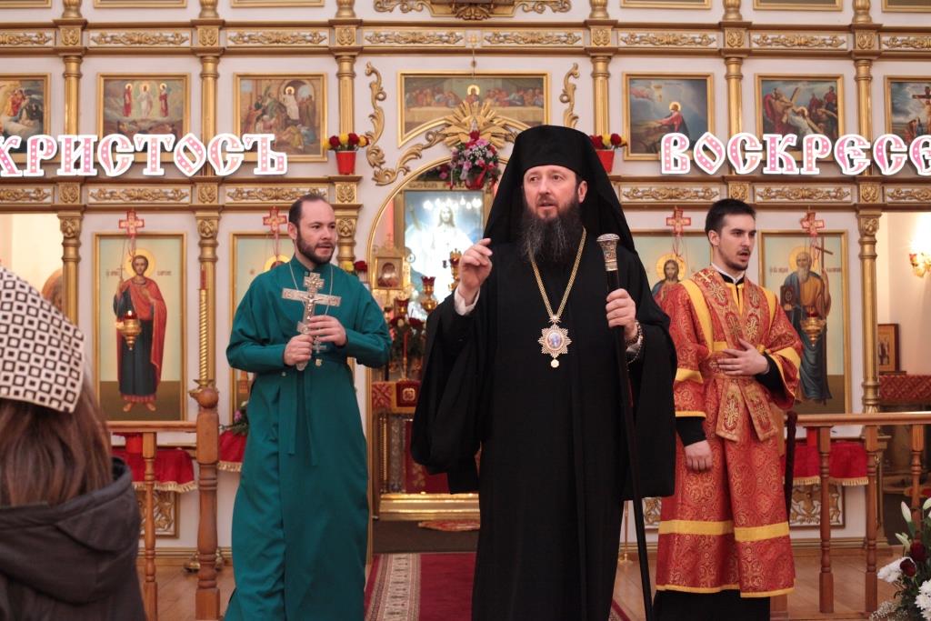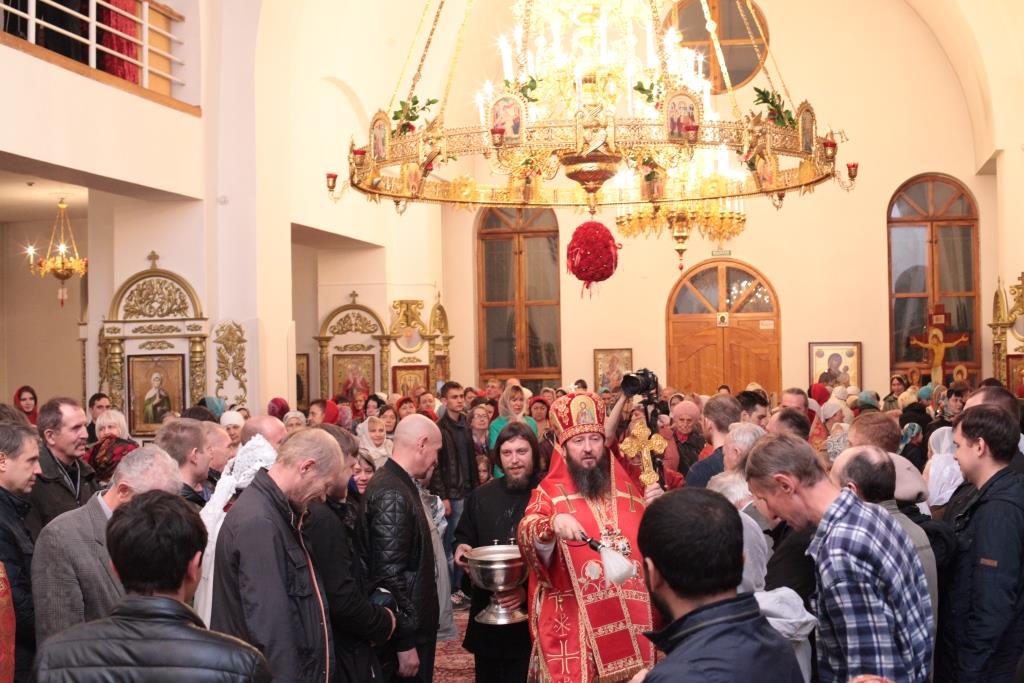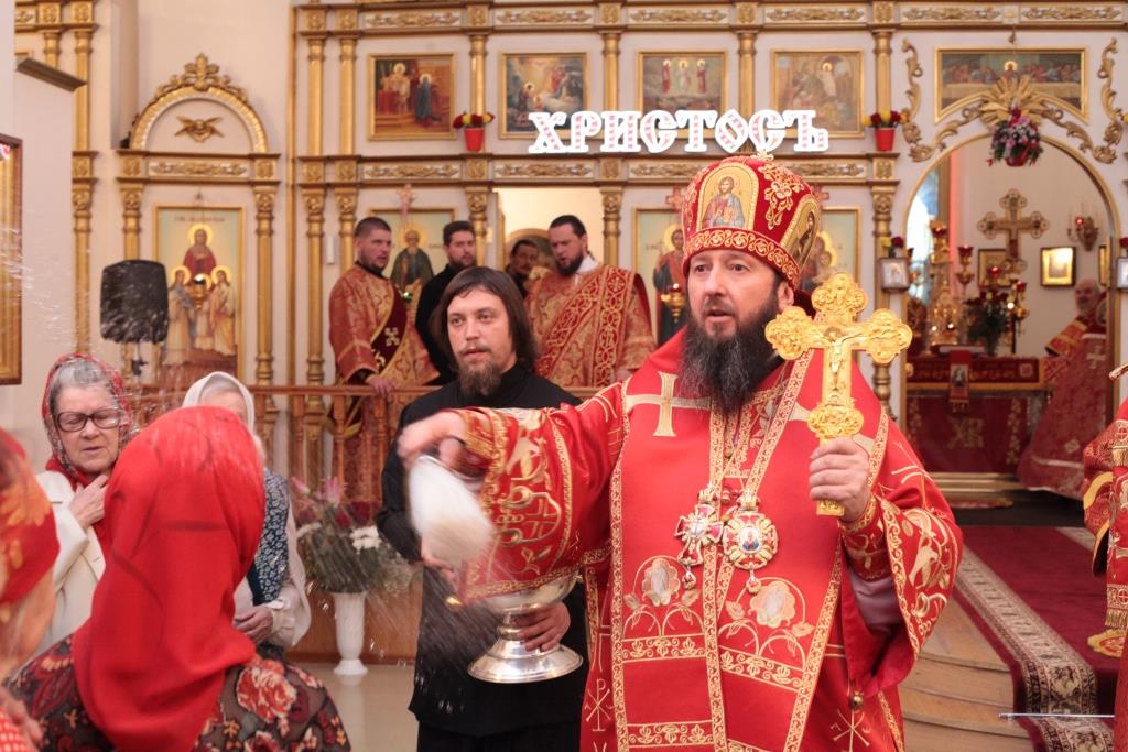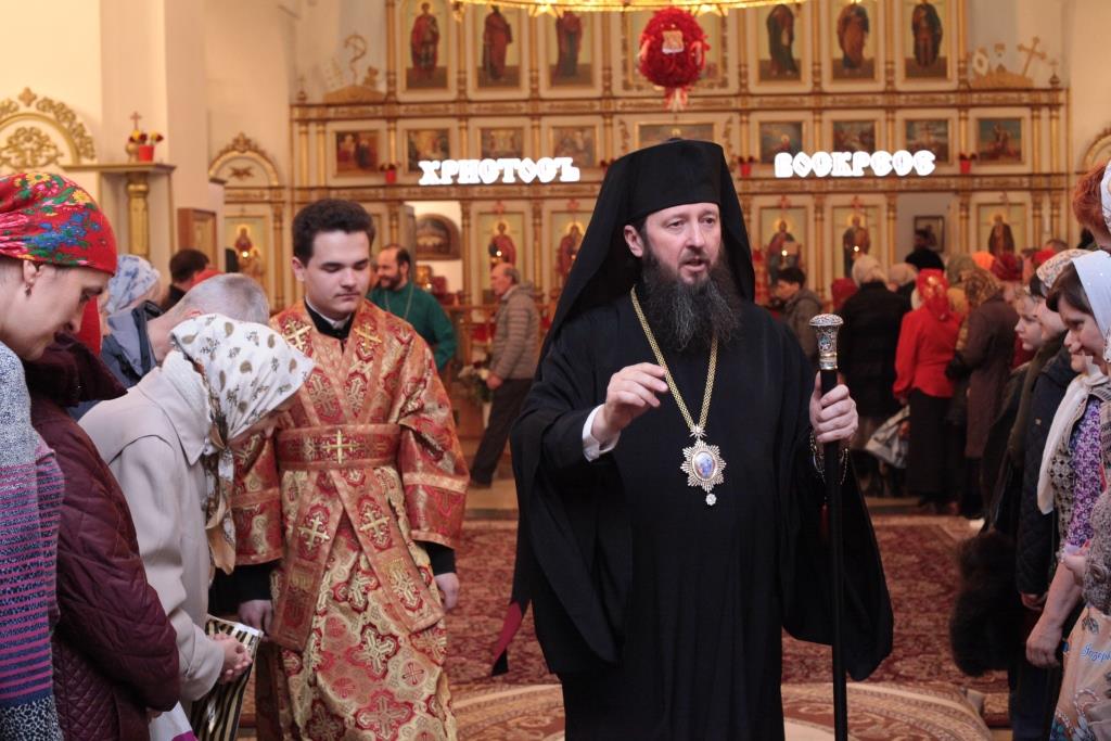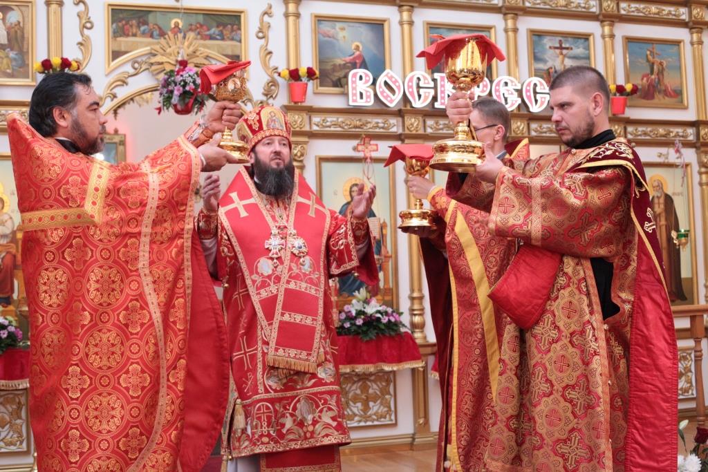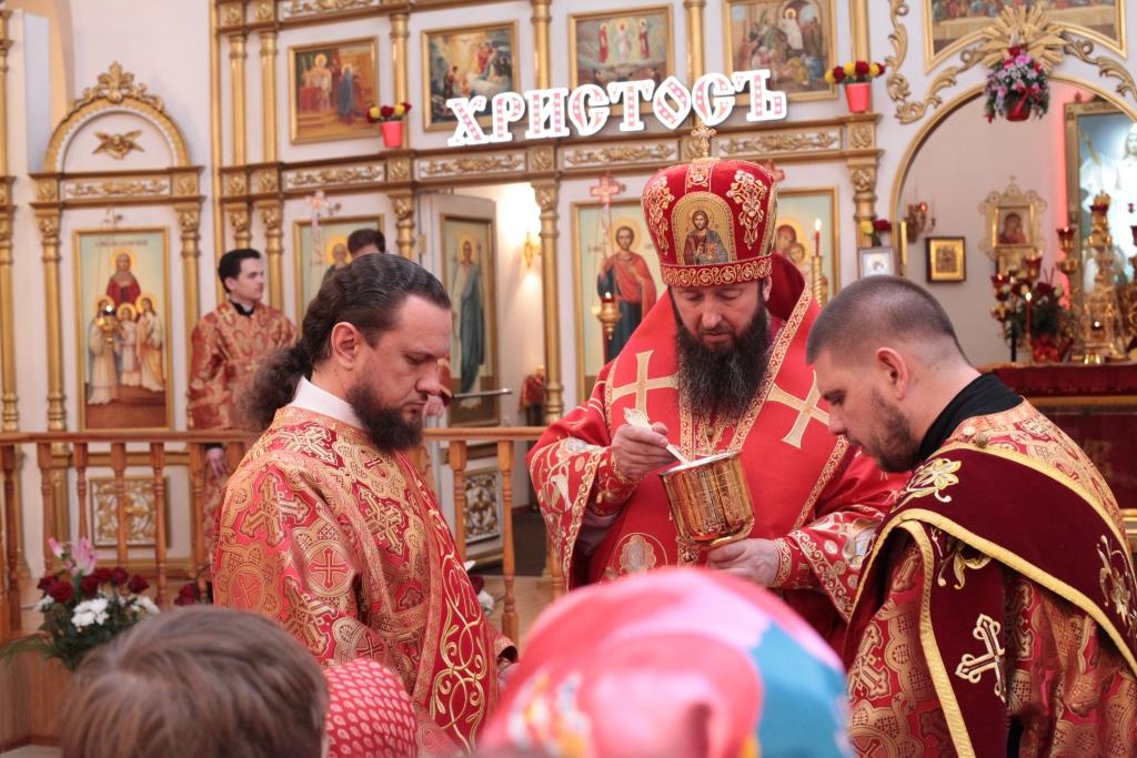 После заамвонной молитвы епископ Амфилохий освятил артосы, и обратился к народу Божию со словами пасхального приветствия, в котором поздравил всех с великим торжеством и мироспасительным праздником Воскресения Господа Бога и Спаса нашего Иисуса Христа. В завершение Богослужения Преосвященнейший Владыка освятил пасхальную трапезу: крашеные яйца, творожные пасхи и куличи.