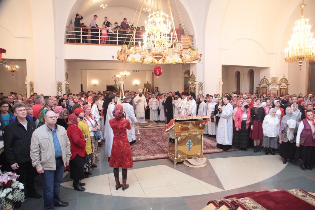 За Божественной Литургией ключарь кафедрального собора огласил многочисленным прихожанам Пасхальное послание Святейшего Патриарха Московского и всея Руси Кирилла, в котором Предстоятель Русской Церкви отметил: «Воскресение Господа Иисуса – главное содержание христианского послания миру. Только благодаря Голгофской жертве, неразрывно соединенной со славным Воскресением, обретают смысл и ценность все человеческие дерзания, направленные к Источнику всякого блага. Жертва Христова стала ответом на предпринимавшиеся людьми разных культур и традиций попытки поиска Живого Бога, ибо, по слову Священного Писания, Господь «нелицеприятен, но во всяком народе боящийся Его и поступающий праведно угоден Ему» (Деян. 10, 34-35), и Он хочет, чтобы все спаслись и достигли познания истины (1 Тим. 2, 4). Эти напряженные усилия воплощали в себе чаяния и надежды миллионов людей, в разные времена тщетно искавших возможность преодолеть свое плачевное состояние и обрести подлинную «жизнь и жизнь с избытком» (Ин. 10, 10)».