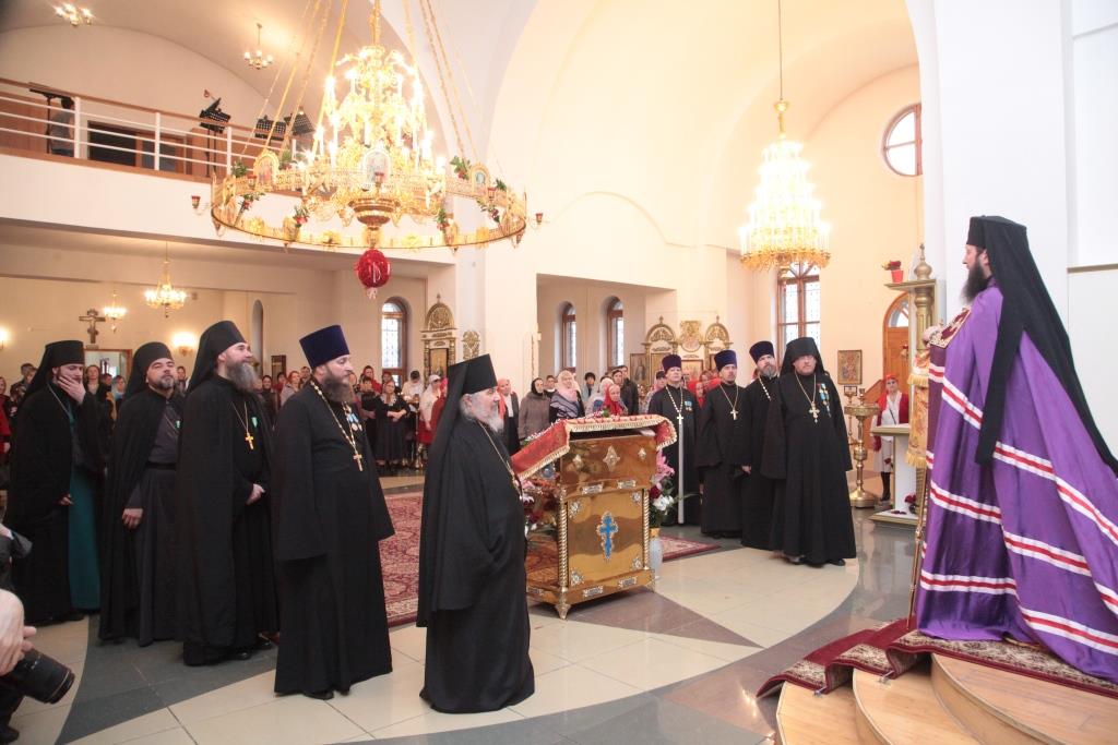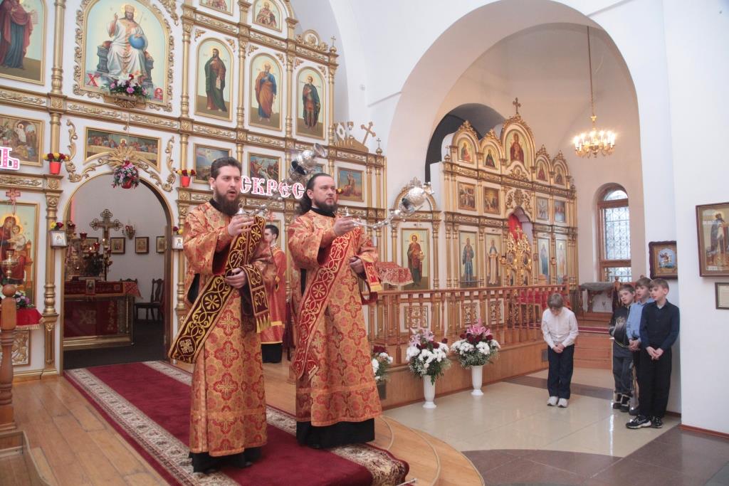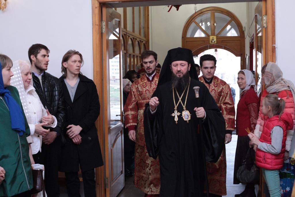 На вечернем богослужении присутствовали сотрудники епархиального управления, представители городских православных молодежных организаций, паломники и прихожане. Возглашался великий прокимен «Кто Бог велий, яко Бог наш», прославляющий всемогущество Господа, победившего смерть. После прокимна Преосвященнейший Владыка прочитал Евангельское зачало о явлении Воскресшего Христа ученикам (Ин. 20:19-25).