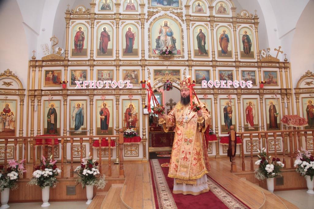 В день Пасхи Христовой Преосвященнейший епископ Усть-Каменогорский и Семипалатинский Амфилохий совершил великую Пасхальную вечерню в Свято-Андреевском кафедральном соборе города Усть-Каменогорска. Его Преосвященству сослужили: духовник епархии архимандрит Спиридон (Теплухин), благочинный Усть-Каменогорского церковного округа иерей Алексий Анищенко, ключарь Андреевского собора иеромонах Никодим (Авдеев), руководитель молодежного отдела епархии иерей Вячеслав Гутов, клирики кафедрального собора и городское духовенство.