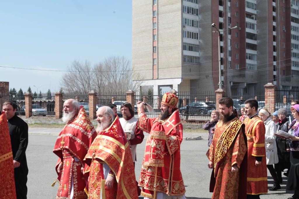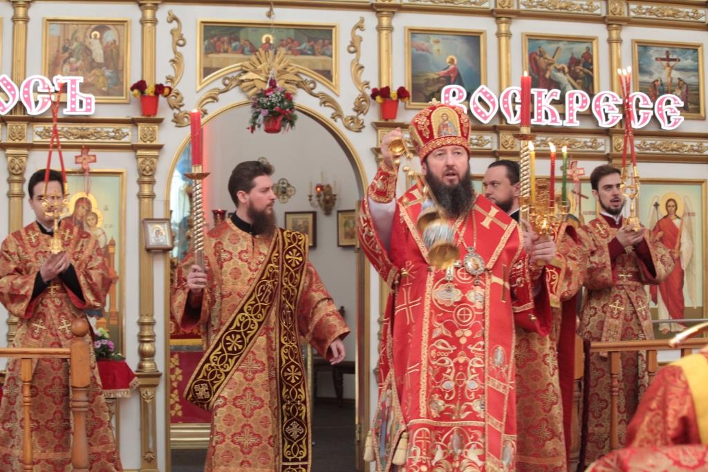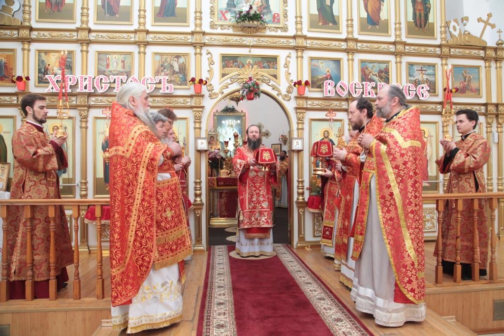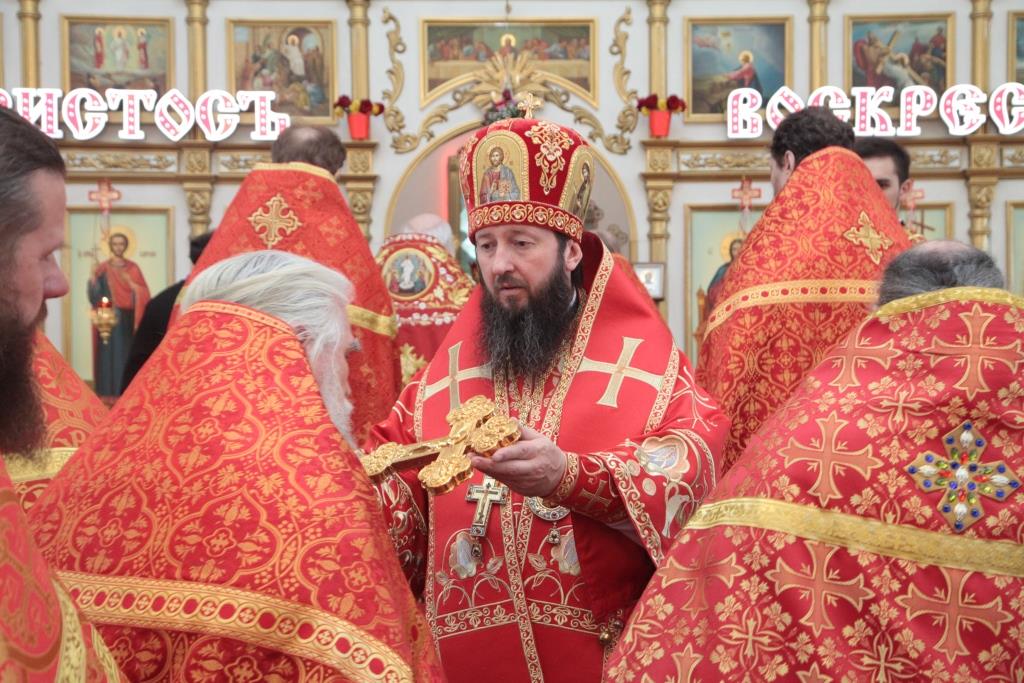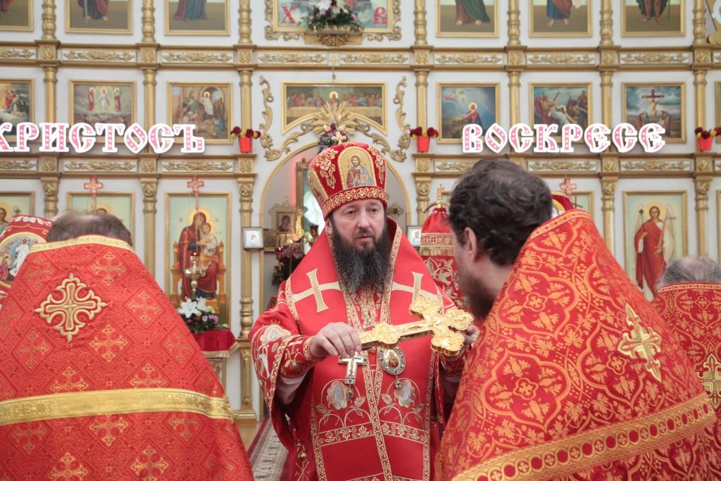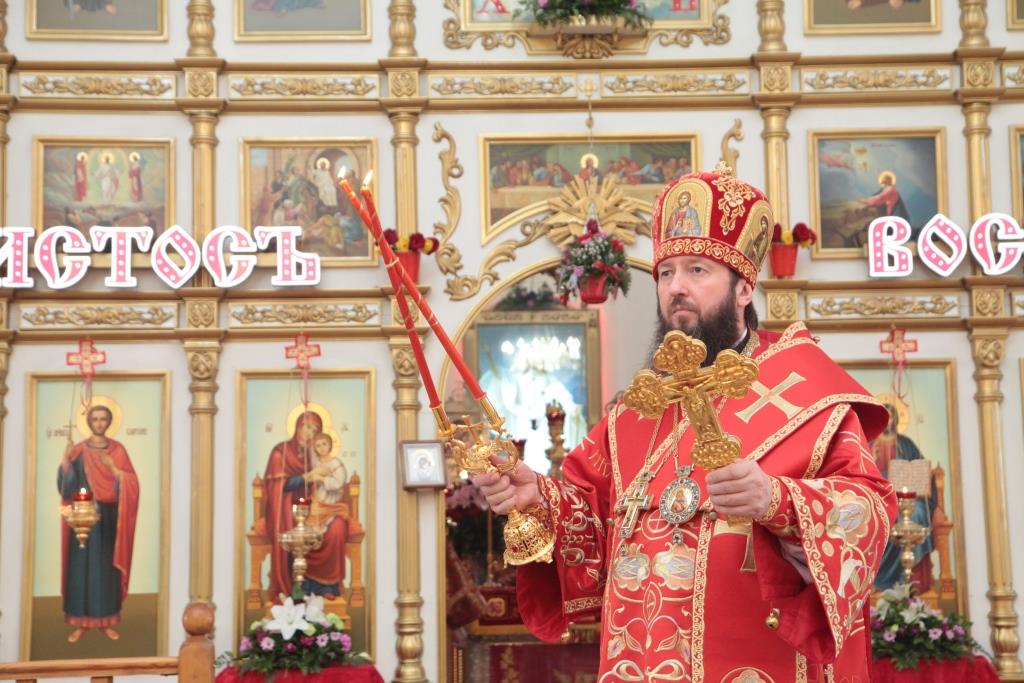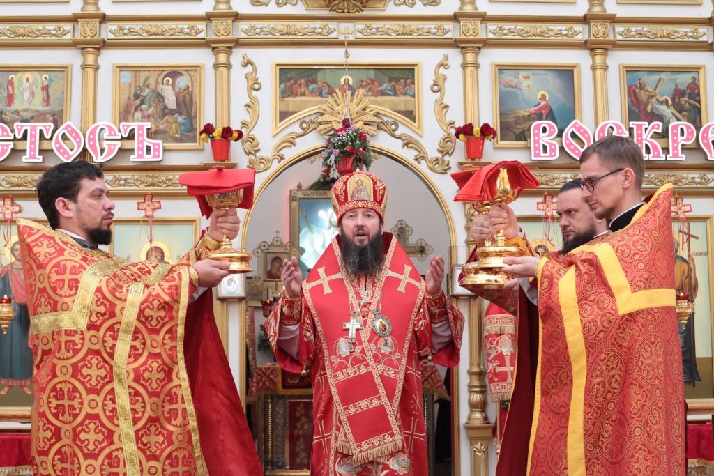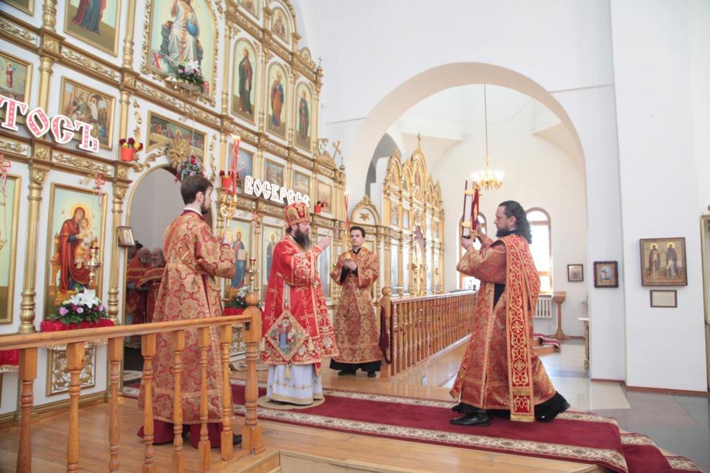 Перед причастием мирян проповедовал благочинный Усть-Каменогорского церковного округа иерей Алексий Анищенко. После заамвонной молитвы был совершен пасхальный крестный ход, после которого Архипастырь с клириками воспел славление священномученику Александру (Дагаеву).