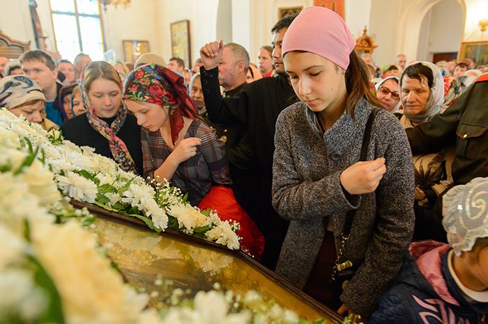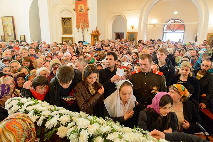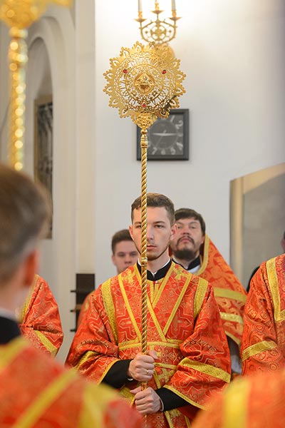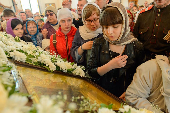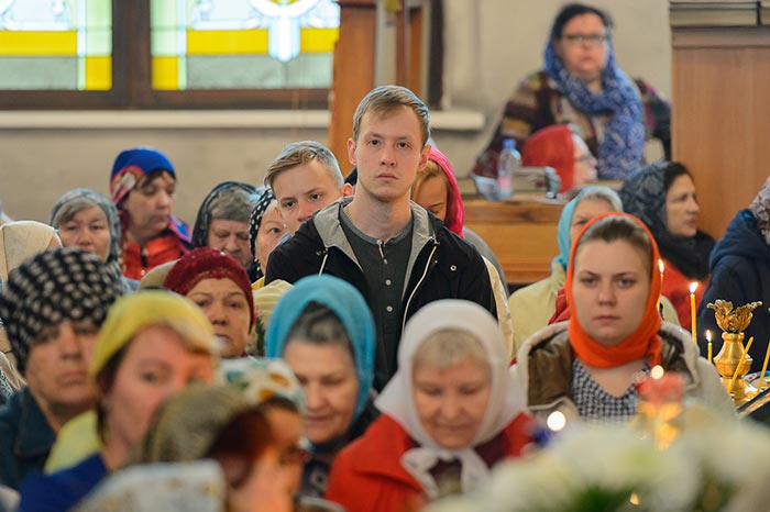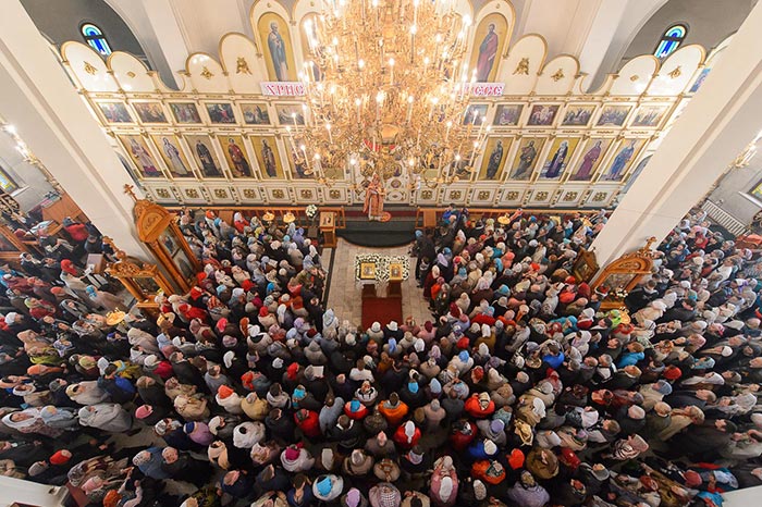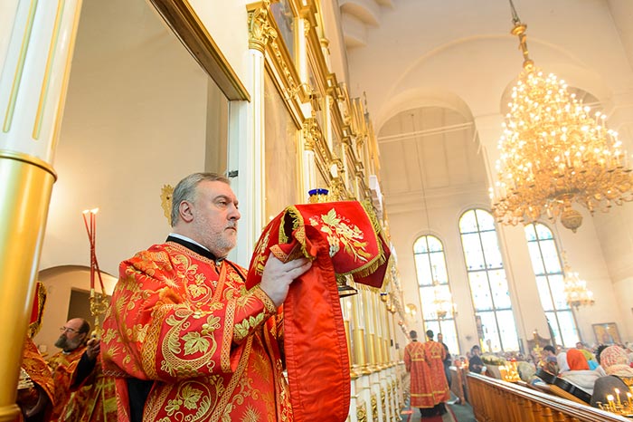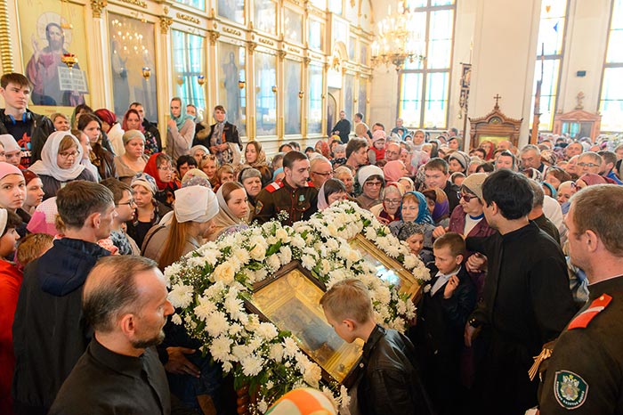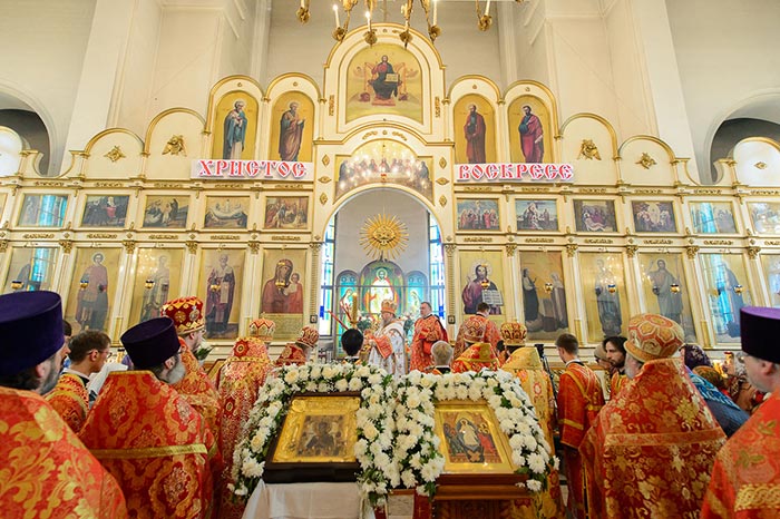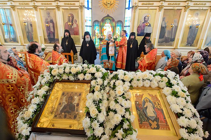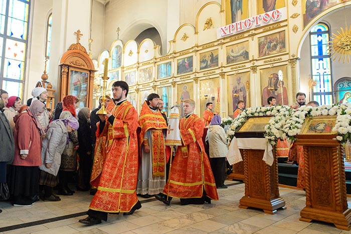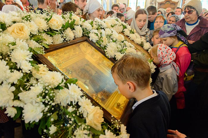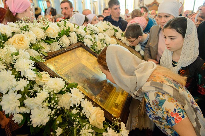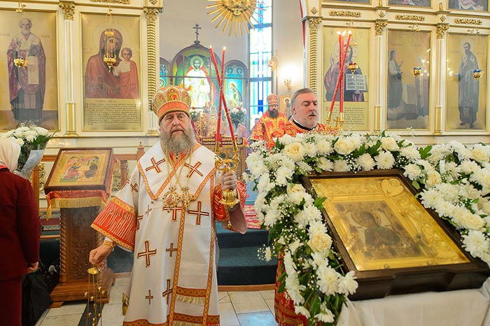 Богослужение завершилось пением стихир святой Пасхи и славлением пред киотом с мироточивым образом Божией Матери. С многочисленными верующими владыка митрополит похристосовался на древних и современных языках, произнес проповедь и окропил всех участников богослужения святой водой.