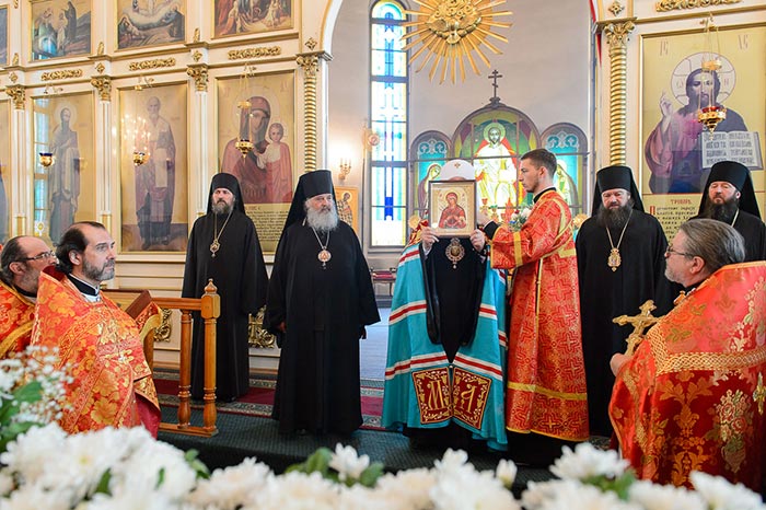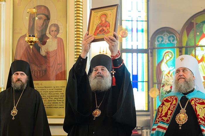 В дар Благовещенскому собору в память о принесении мироточивого образа Царицы Небесной в город Павлодар Глава Казахстанского Митрополичьего округа передал копию иконы Богоматери «Умягчение злых сердец».