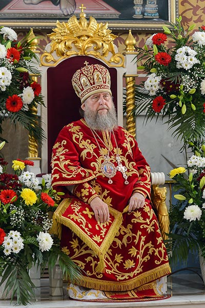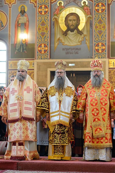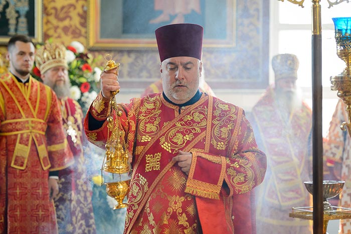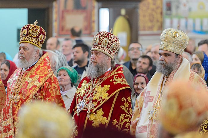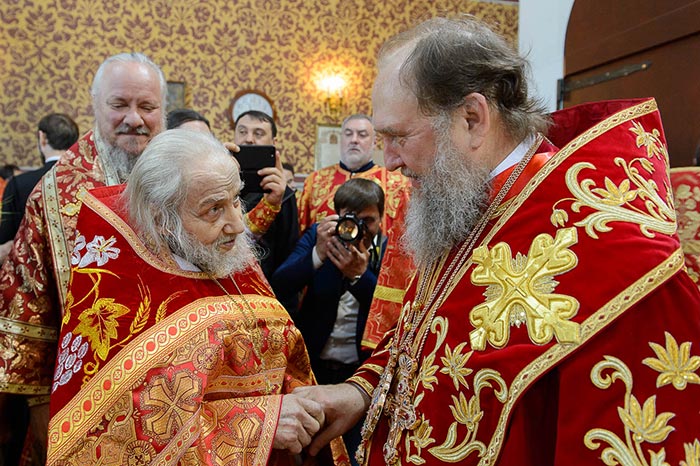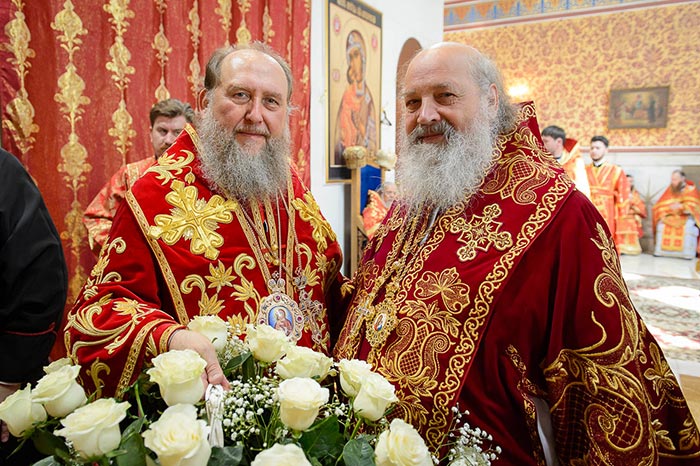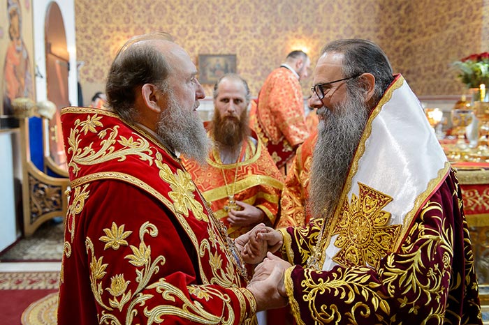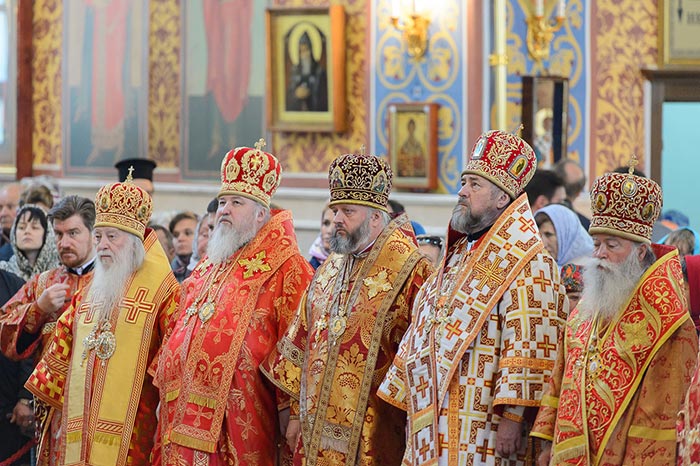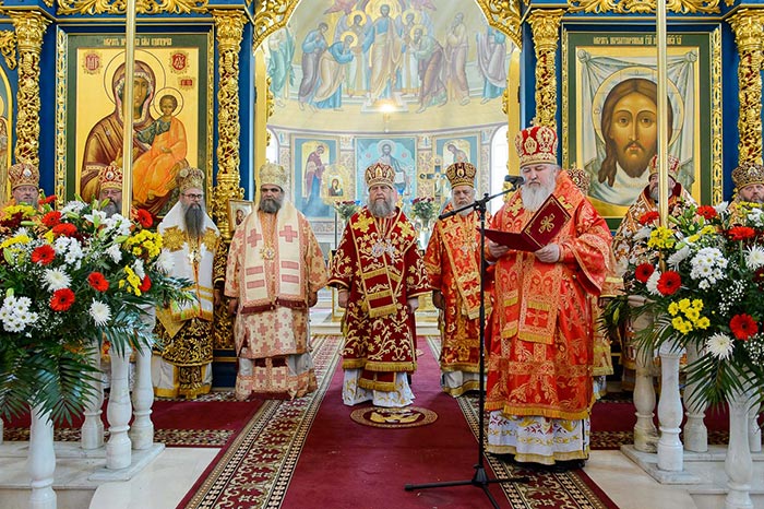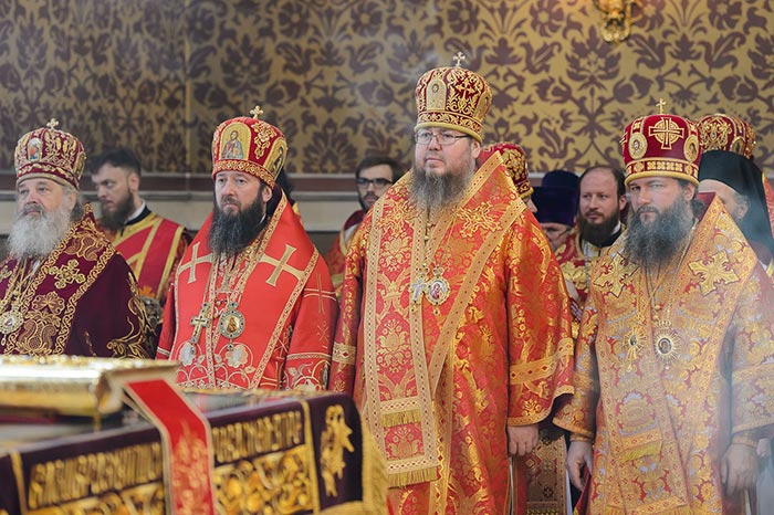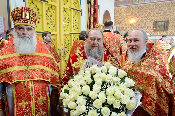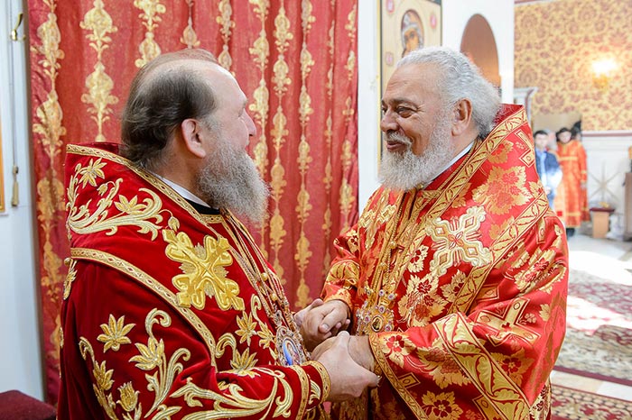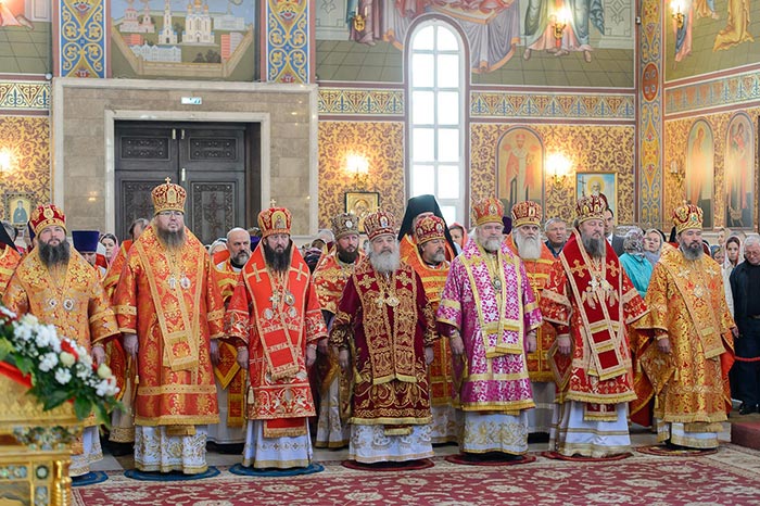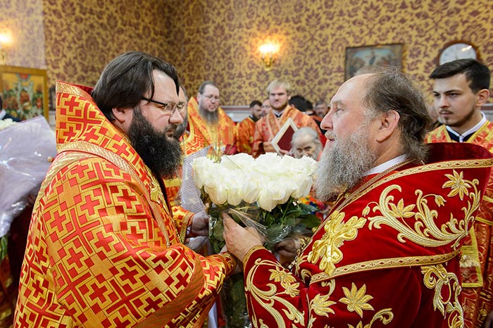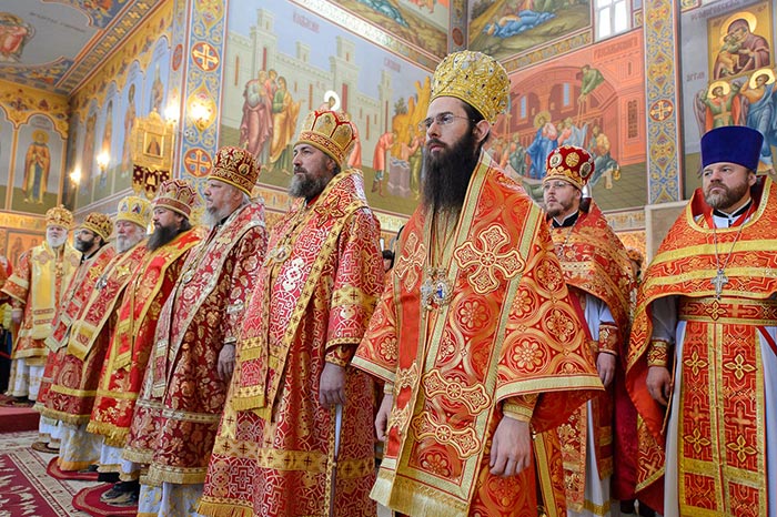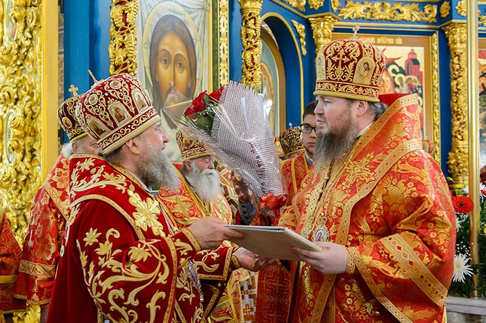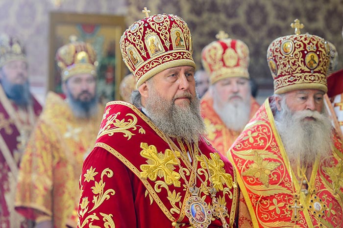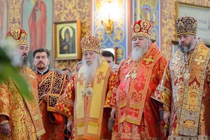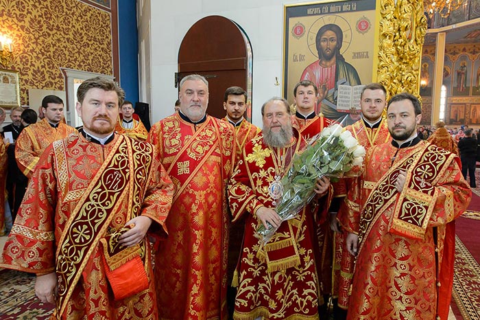 Главе Православной Церкви Казахстана сослужили: представитель Патриарха Антиохийского и всего Востока при Патриархе Московском и всея Руси митрополит Филиппопольский Нифон (Антиохийская Православная Церковь), митрополит Тамасосский и Оринийский Исаия (Кипрская Православная Церковь), митрополит Ловчанский Гавриил (Болгарская Православная Церковь), митрополит Пловдивский Николай (Болгарская Православная Церковь), глава Екатеринбургской митрополии митрополит Екатеринбургский и Верхотурский Кирилл, председатель Синодального миссионерского отдела Украинской Православной Церкви митрополит Полтавский и Миргородский Филипп, митрополит Черновицкий и Буковинский Мелетий, глава Кузбасской митрополии митрополит Кемеровский и Прокопьевский Аристарх, председатель Синодального комитета Русской Православной Церкви по взаимодействию с казачеством, глава Ставропольской митрополии митрополит Ставропольский и Невинномысский Кирилл, глава Смоленской митрополии митрополит Смоленский и Дорогобужский Исидор, архиепископ Белостокский и Гданьский Иаков (Польская Православная Церковь), архиепископ Уральский и Актюбинский Антоний, архиепископ Чимкентский и Таразский Елевферий, архиепископ Элистинский и Калмыцкий Юстиниан, архиепископ Тираспольский и Дубоссарский Савва, епископ Гурий (Шалимов), епископ Костанайский и Рудненский Анатолий, епископ Талдыкорганский Нектарий, епископ Павлодарский и Экибастузский Варнава, епископ Карагандинский и Шахтинский Севастиан, епископ Усть-Каменогорский и Семипалатинский Амфилохий, епископ Кокшетауский и Акмолинский Серапион, епископ Петропавловский и Булаевский Владимир, викарий Пловдивской епархии епископ Знепольский Арсений (Болгарская Православная Церковь), викарий Екатеринбургской Митрополии епископ Среднеуральский Евгений.