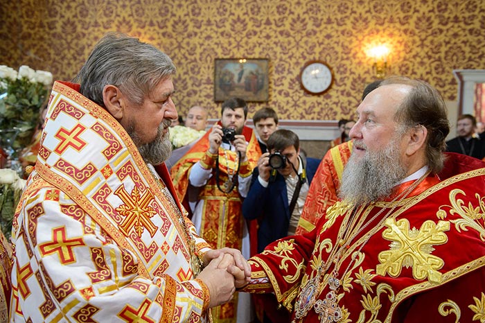По окончании славления член Высшего церковного совета Русской Православной Церкви митрополит Ставропольский и Невинномысский Кирилл огласил текст поздравления Святейшего Патриарха Кирилла митрополиту Александру с 60-летием со дня рождения.