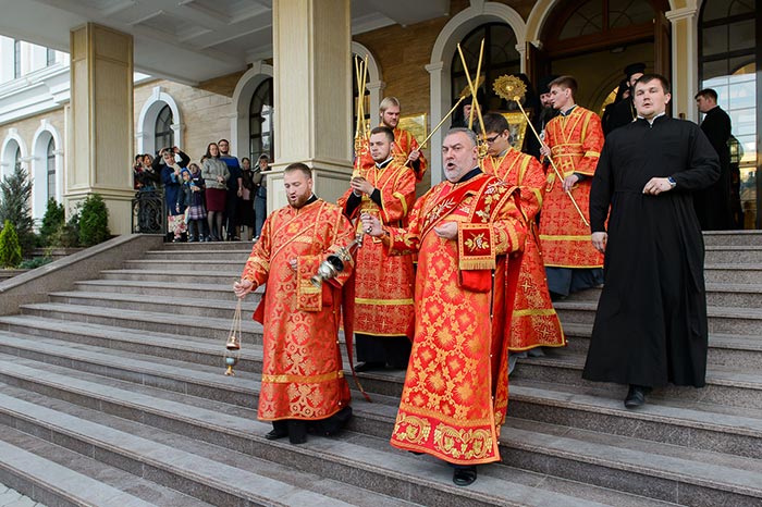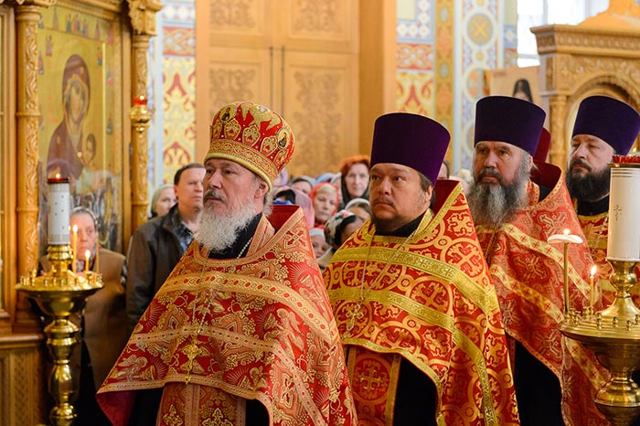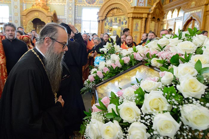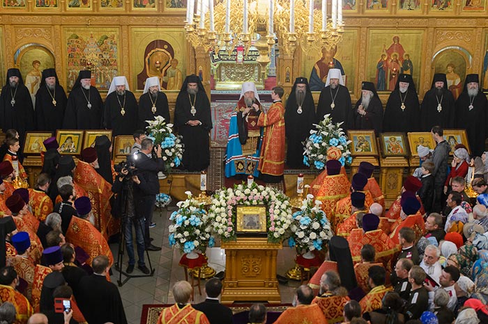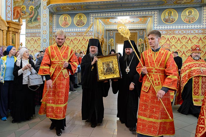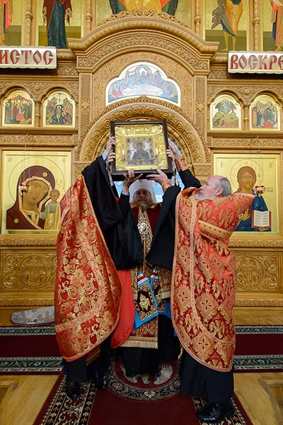 Под пение тропаря «Христос воскресе из мертвых» иерархи внесли чудотворную икону под своды собора и установили киот в центре храма, после чего началось совершение молебна, который возглавил митрополит Астанайский и Казахстанский Александр.