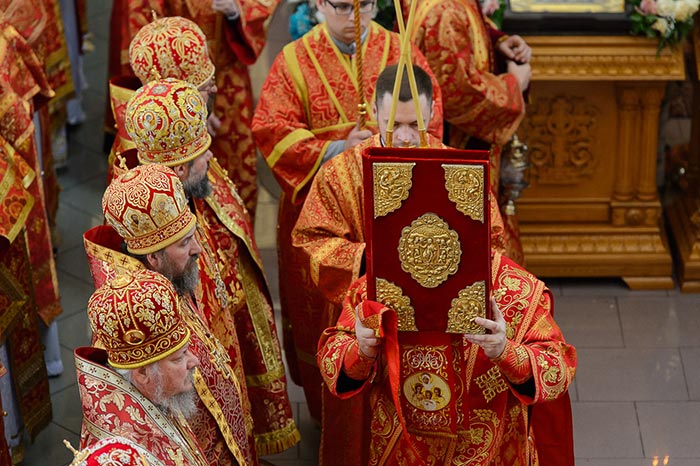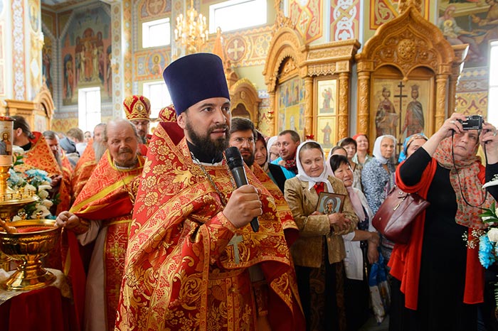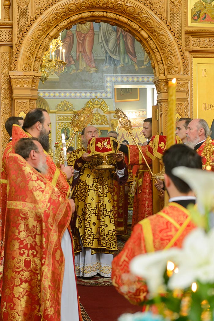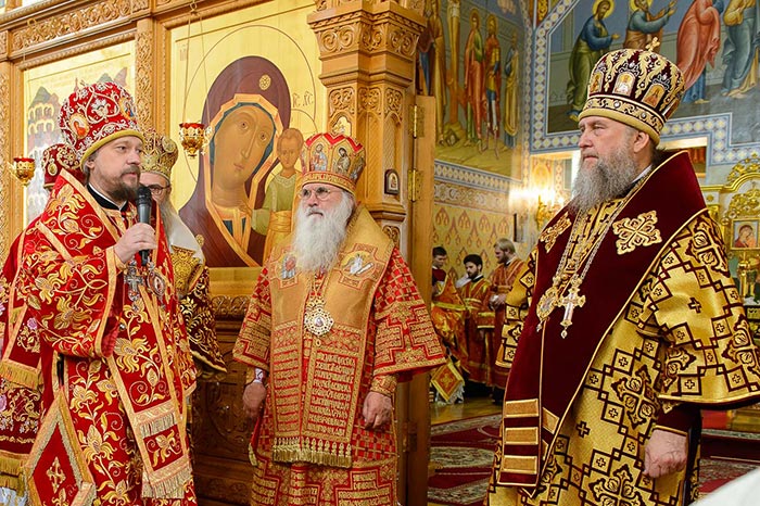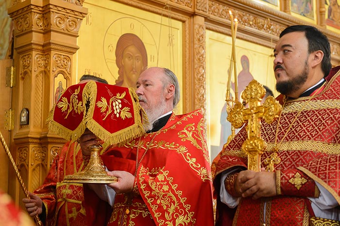 По запричастном стихе было оглашено приветствие Святейшего Патриарха Московского и всея Руси Кирилла по случаю празднования 145-летия учреждения Туркестанской епархии и обращение митрополита Астанайского и Казахстанского Александра, посвященное историческому юбилею Казахстанского Митрополичьего округа