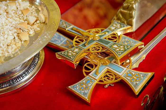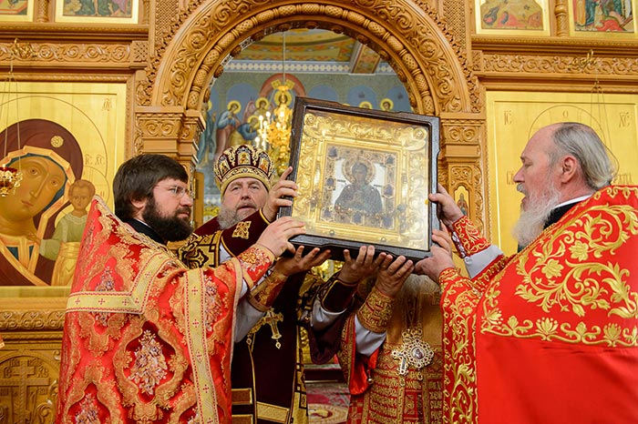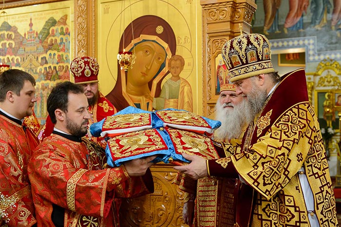 За праздничным богослужением в центре храма на аналое возлежала чудотворная мироточивая икона Пресвятой Богородицы «Умягчение злых сердец», по благословению Святейшего Патриарха Московского и всея Руси Кирилла посещающая пределы Казахстана в год 145-летия создания Туркестанской епархии.