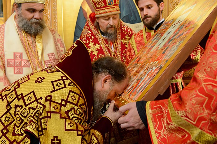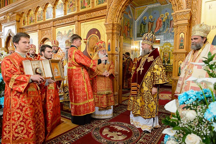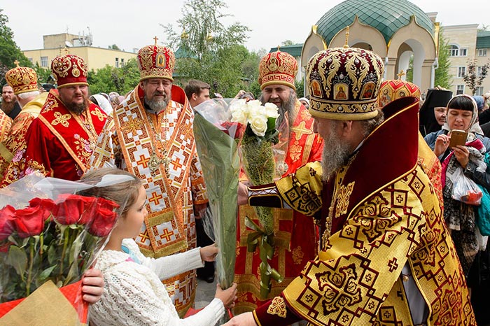 Литургия завершилась пением пасхальных стихир и славлением Пресвятой Богородице перед киотом с Ее мироточивым образом «Умягчение злых сердец».