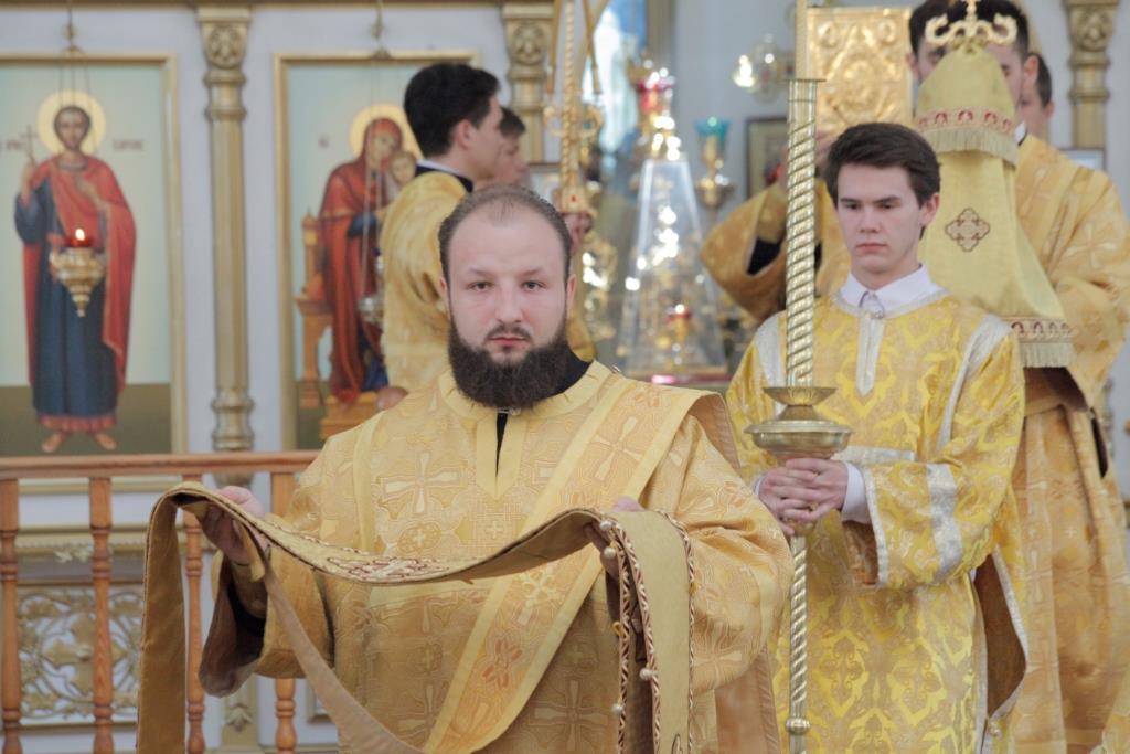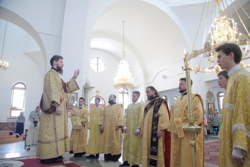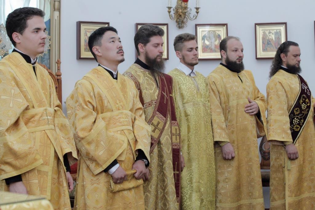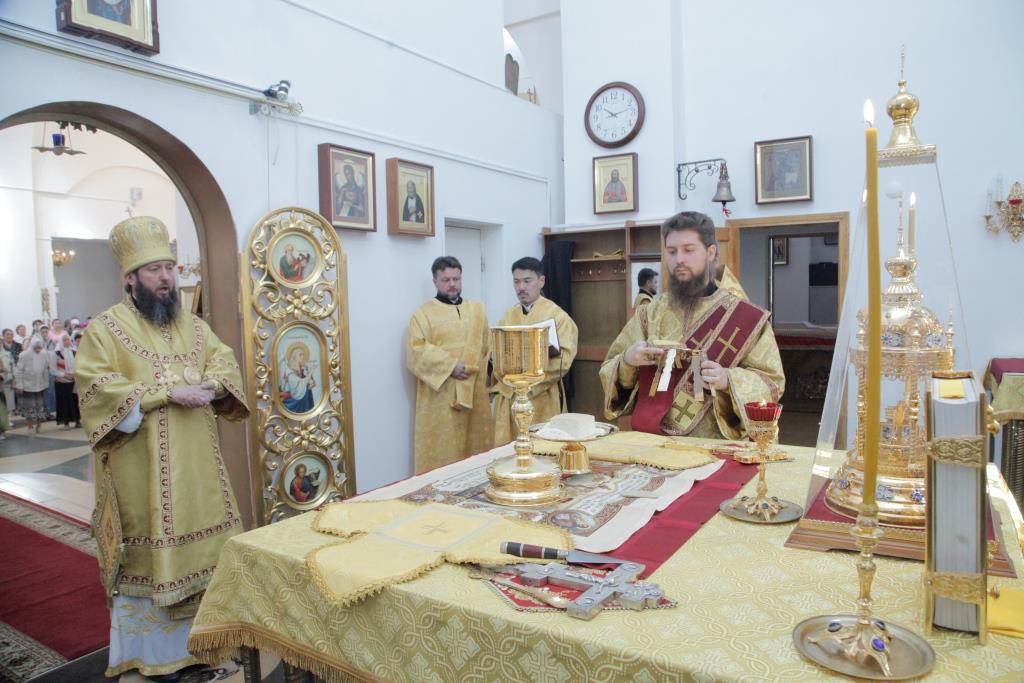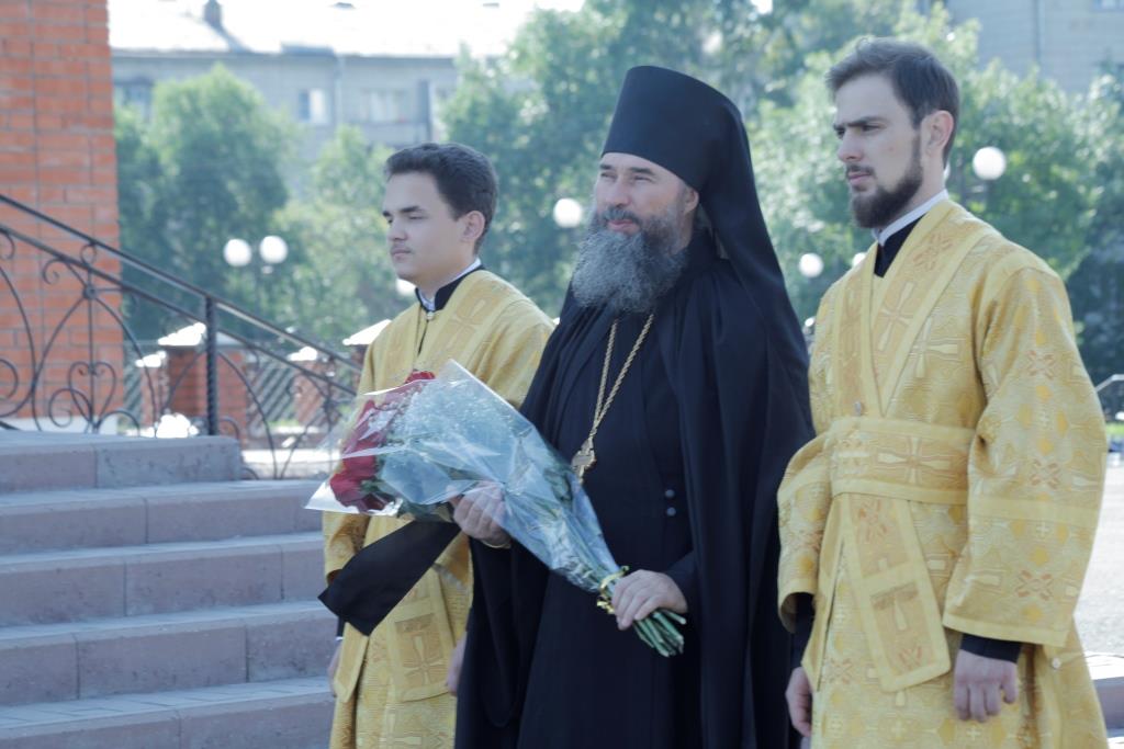 Его Преосвященству сослужили: духовник Усть-Каменогорской епархии, архимандрит Спиридон (Теплухин); ключарь Андреевского кафедрального собора, иеромонах Никодим (Авдеев); иермонах Севастиан (Анрющенко); диаконский чин возглавил протодиакон Андрей Дудник.