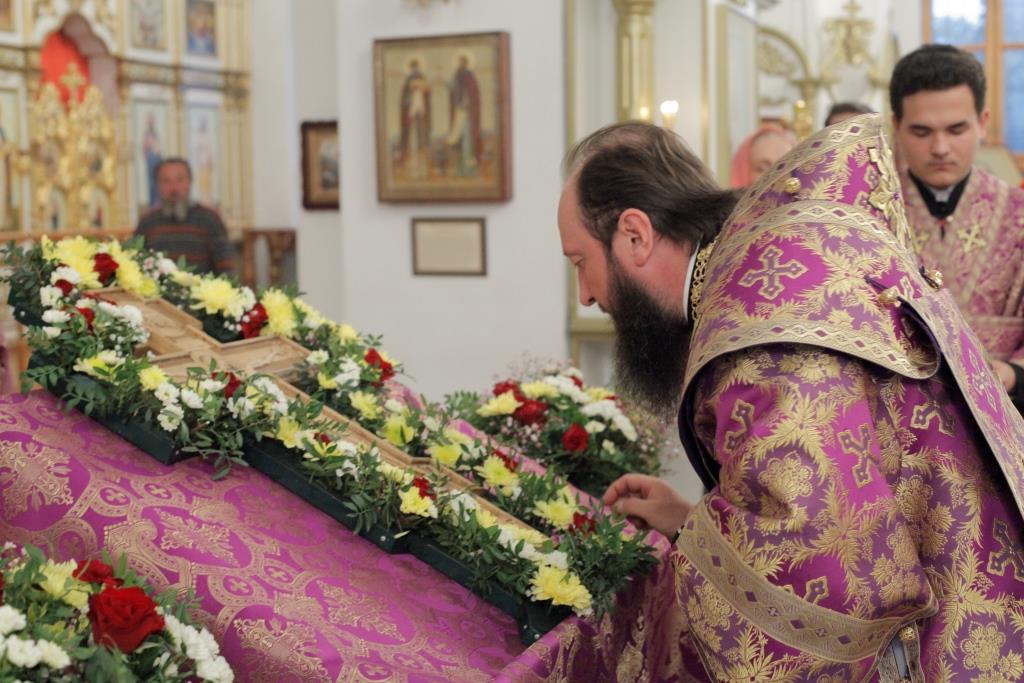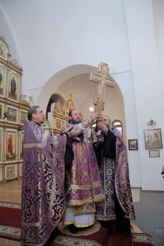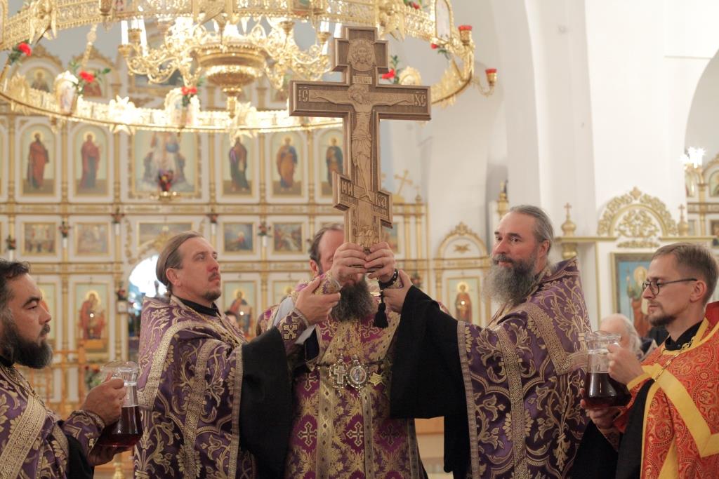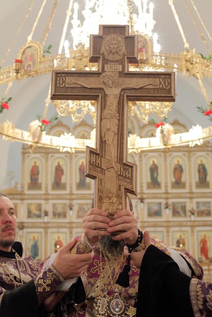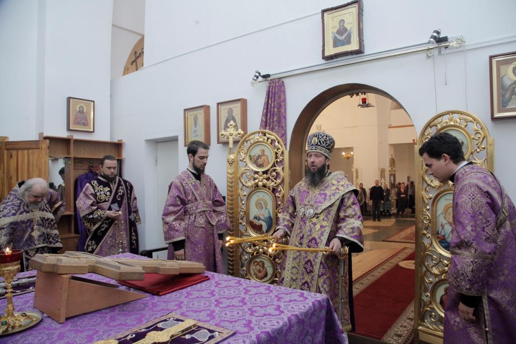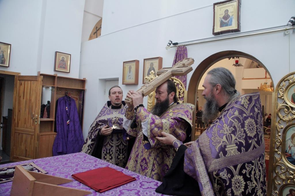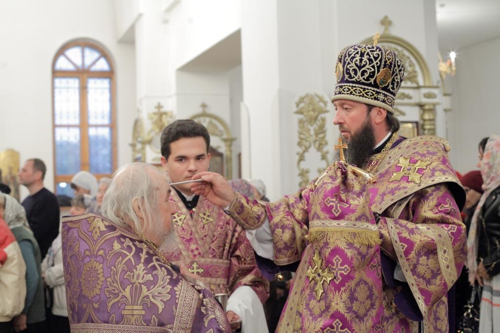 После великого славословия епископ Амфилохий совершил чин Воздвижения Креста. Воздвижение Креста совершается пять раз: на восток, на запад, на юг, на север, и в заключительный раз – вновь на восток. Каждое воздвижение сопровождается особым диаконским прошением. Воздвигаемый Крест, по древней традиции, священники омывают особым составом из благоуханного масла, вина и воды. После чина воздвижения Архипастырь помазал духовенство и прихожан освященным елеем.