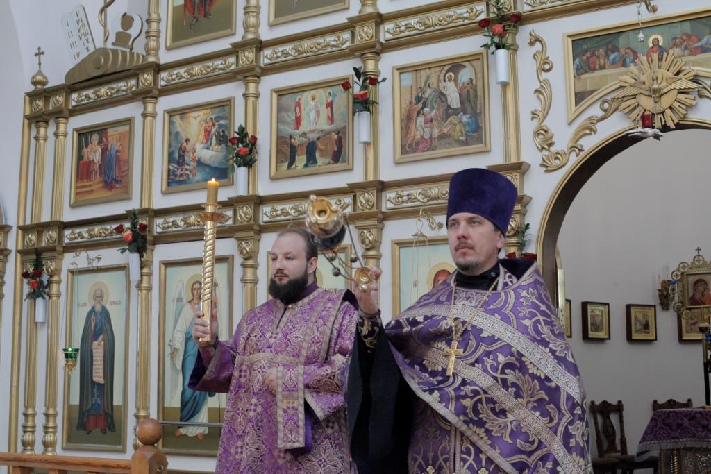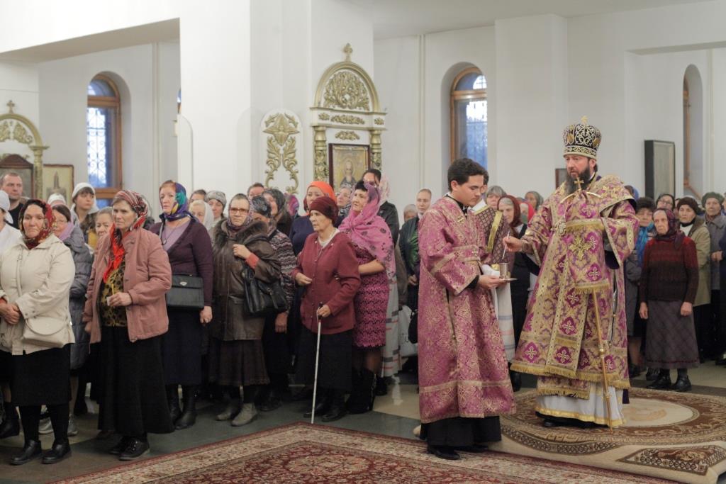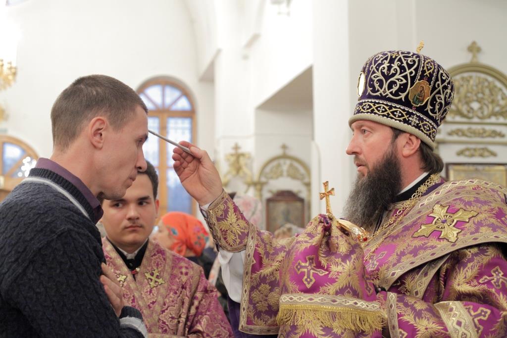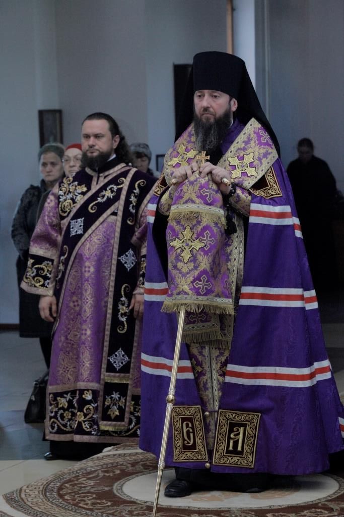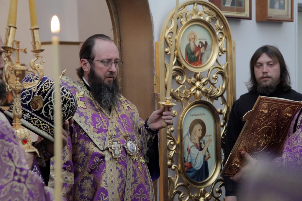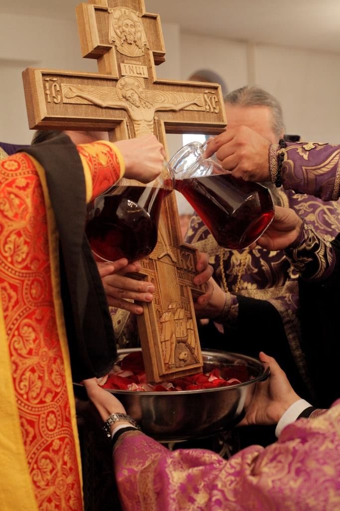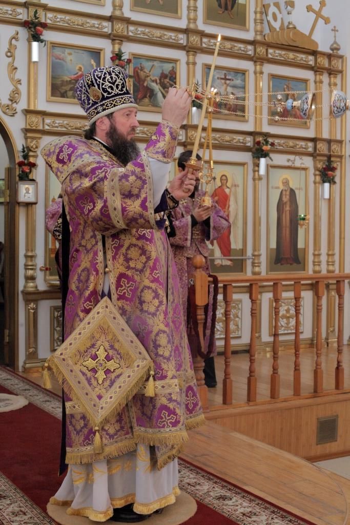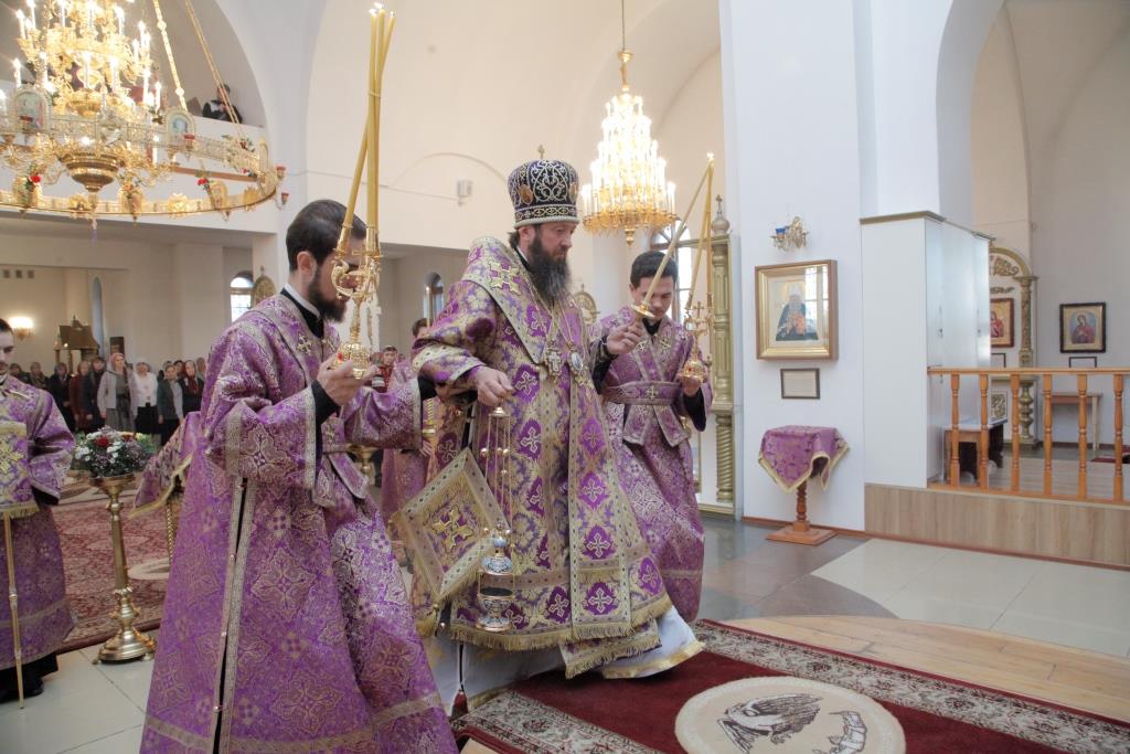 После великого славословия епископ Амфилохий совершил чин Воздвижения Креста. Воздвижение Креста совершается пять раз: на восток, на запад, на юг, на север, и в заключительный раз – вновь на восток. Каждое воздвижение сопровождается особым диаконским прошением. Воздвигаемый Крест, по древней традиции, священники омывают особым составом из благоуханного масла, вина и воды. После чина воздвижения Архипастырь помазал духовенство и прихожан освященным елеем.